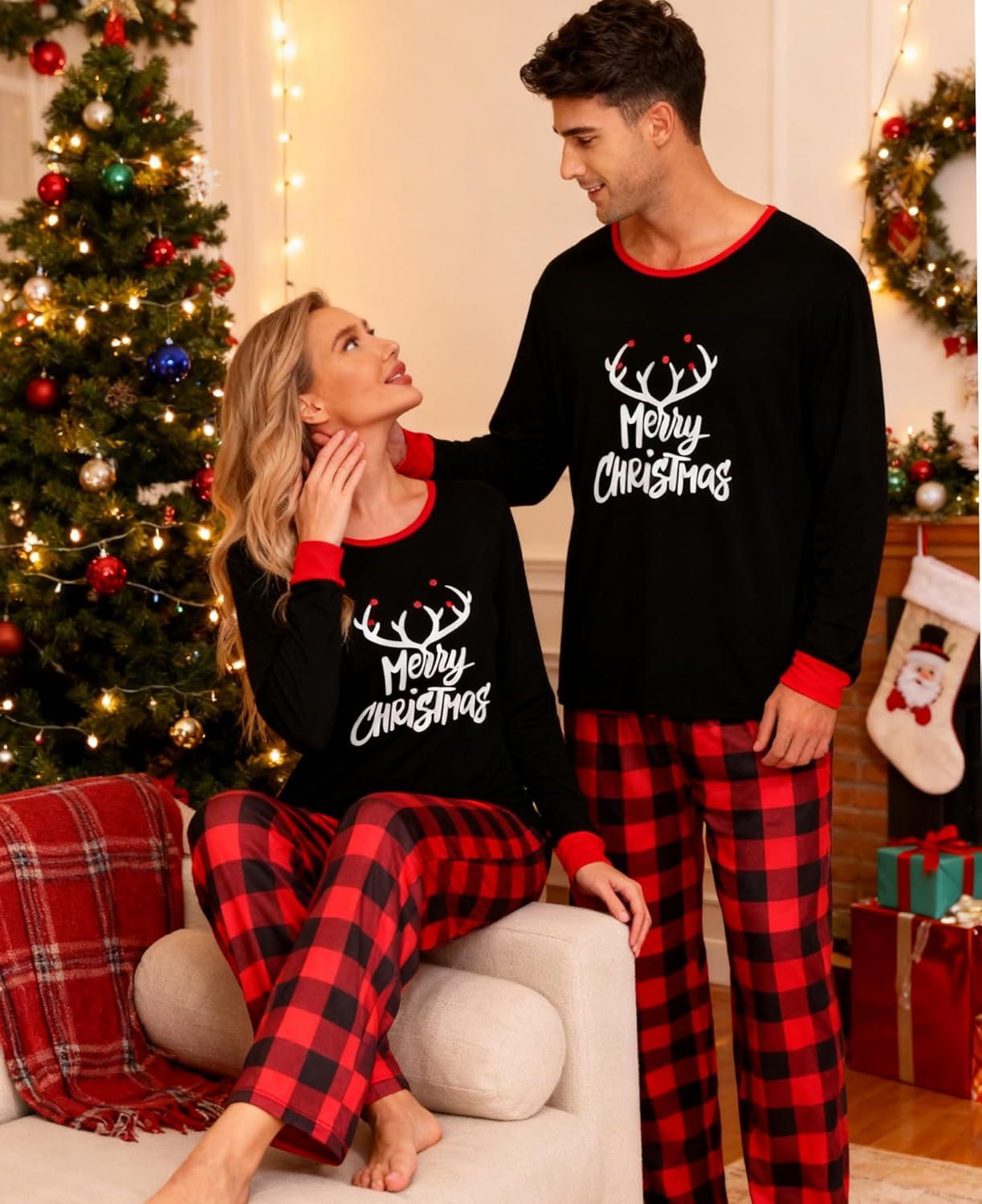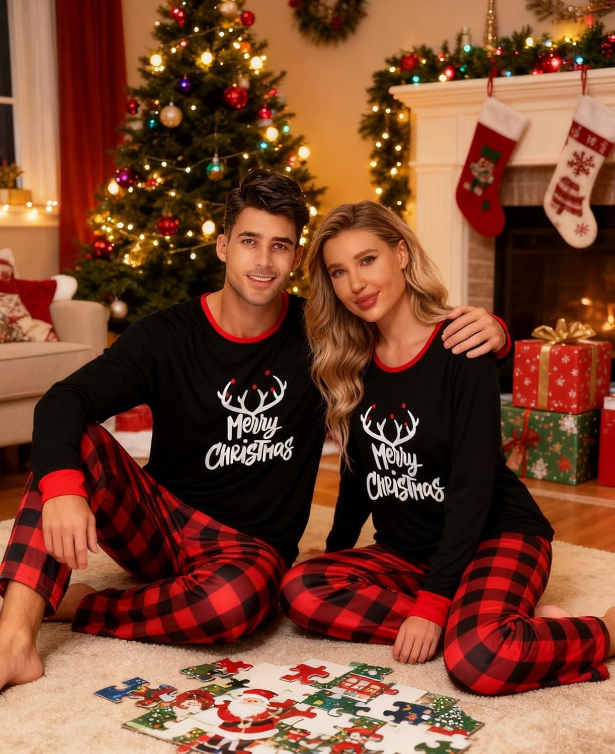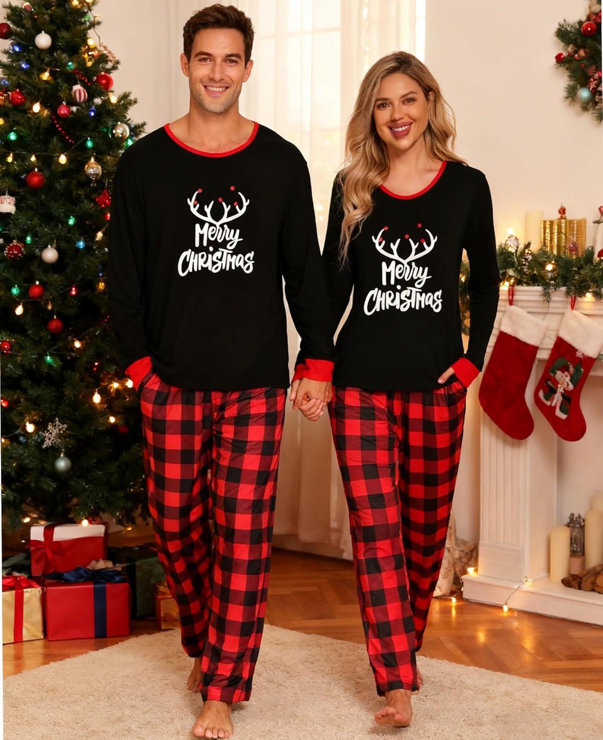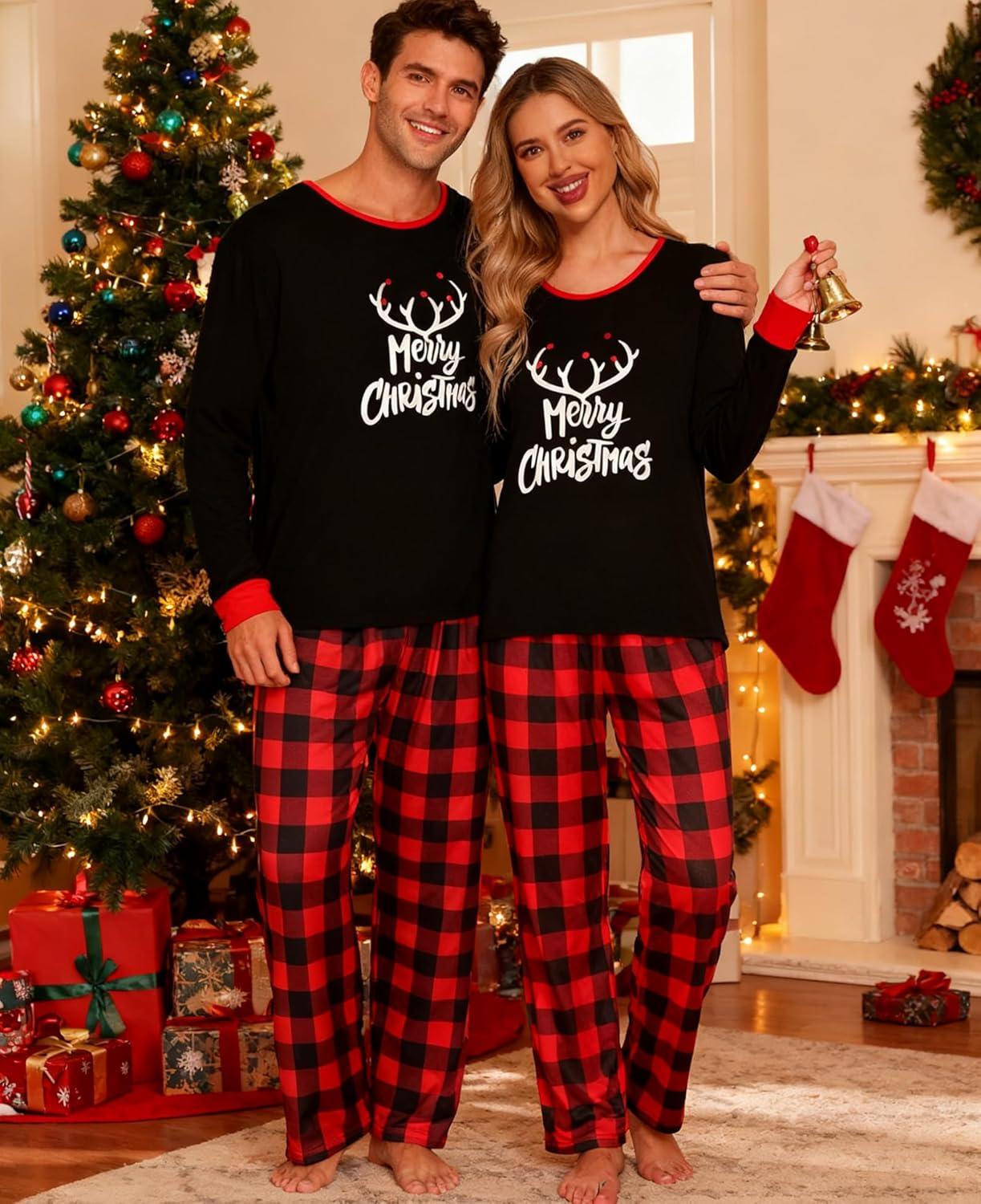 SWOMOG Adult Christmas Pajamas Buffalo Plaid Pajama Pants with Pockets Long Sleeve Tops for Couples & Family(Xmas Reindeer&plaid)