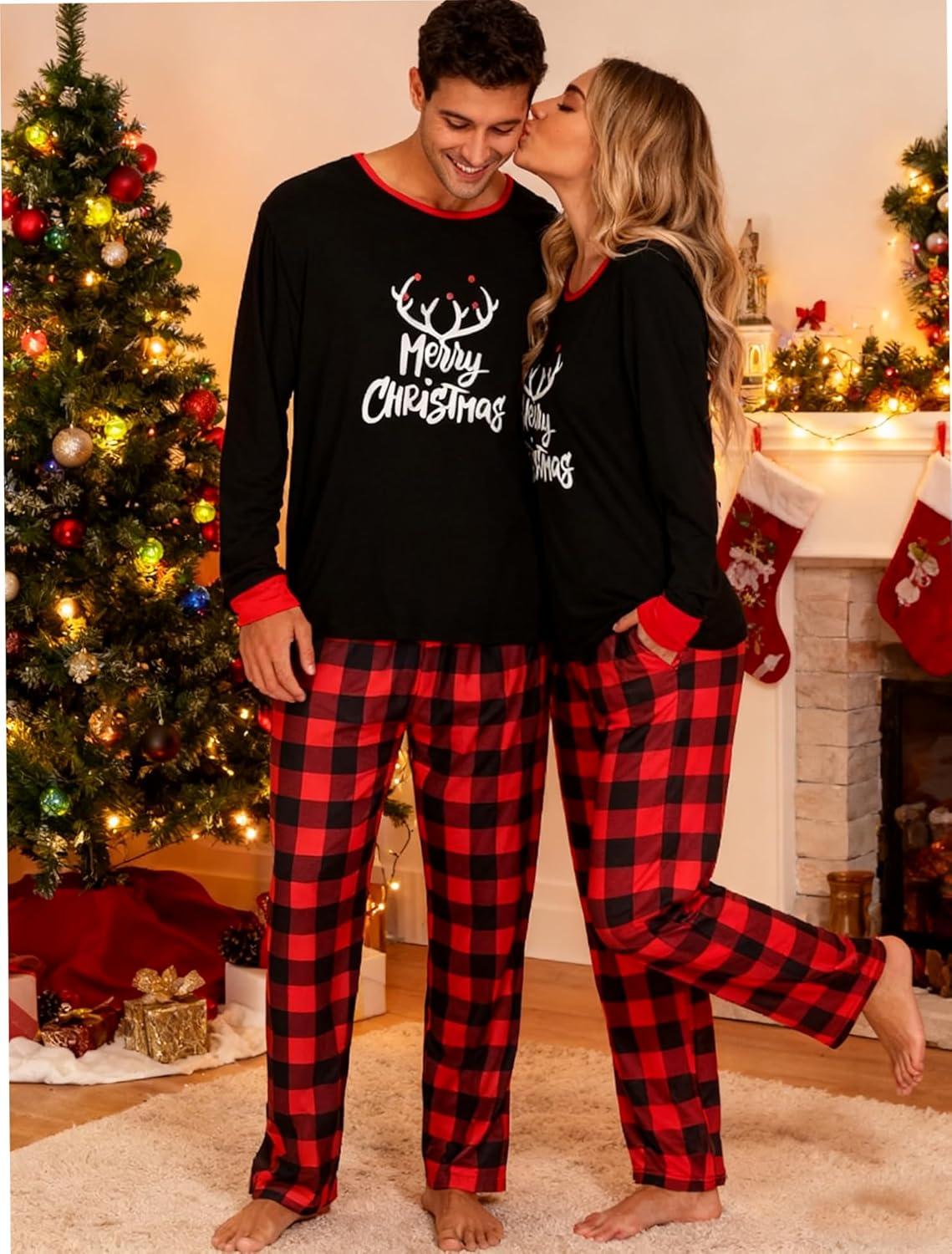 SWOMOG Adult Christmas Pajamas Buffalo Plaid Pajama Pants with Pockets Long Sleeve Tops for Couples & Family(Merry Christmas&plaid)