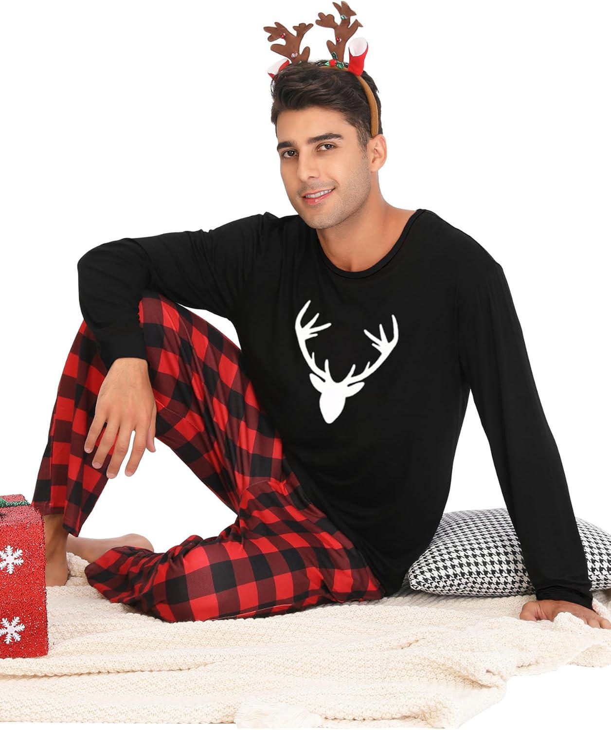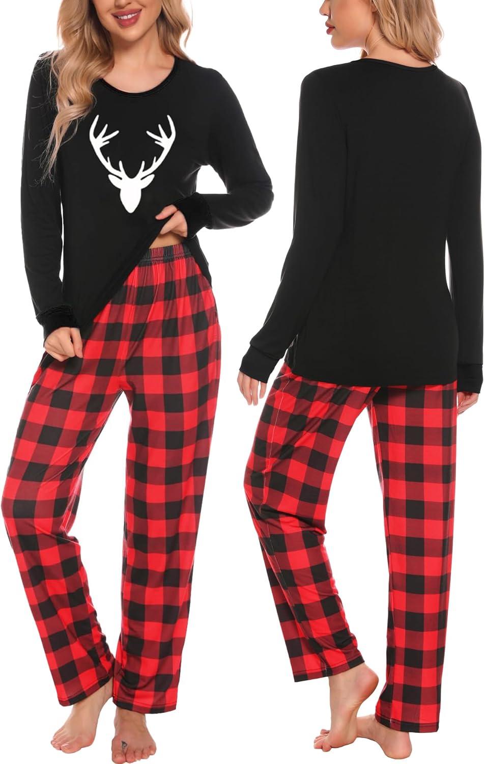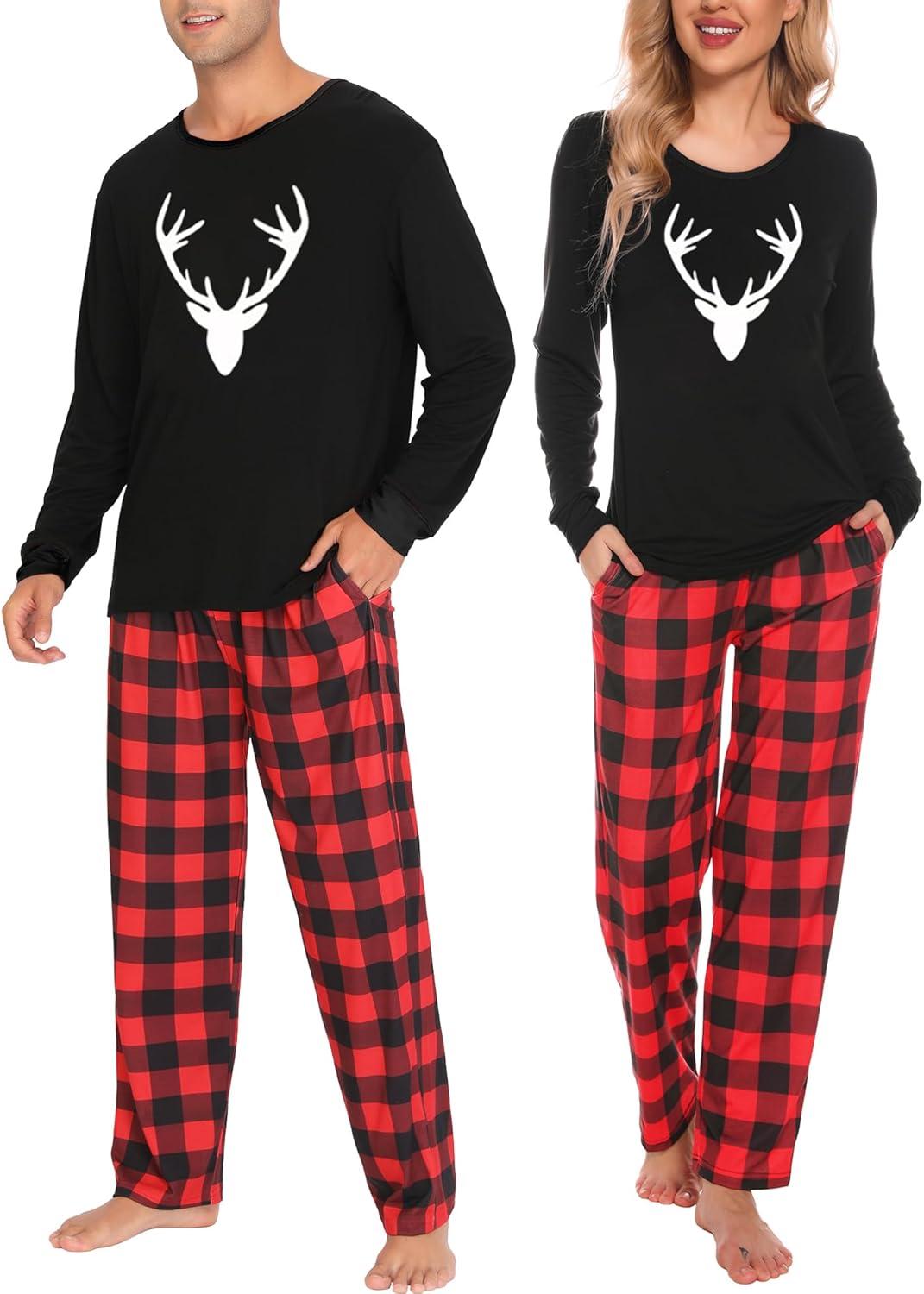 SWOMOG Adult Christmas Pajamas Buffalo Plaid Pajama Pants with Pockets Long Sleeve Tops for Couples & Family(Reindeer &Plaid)