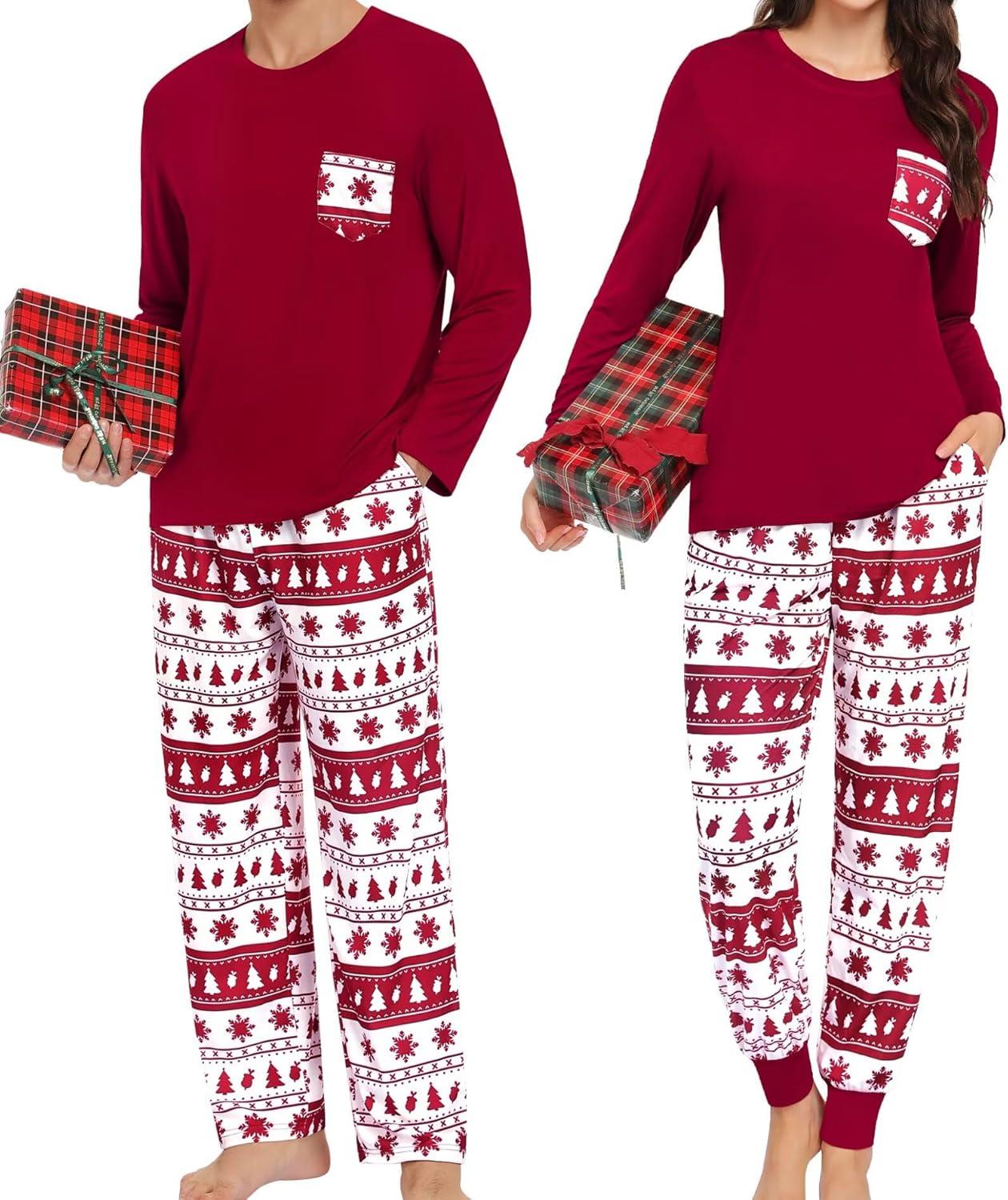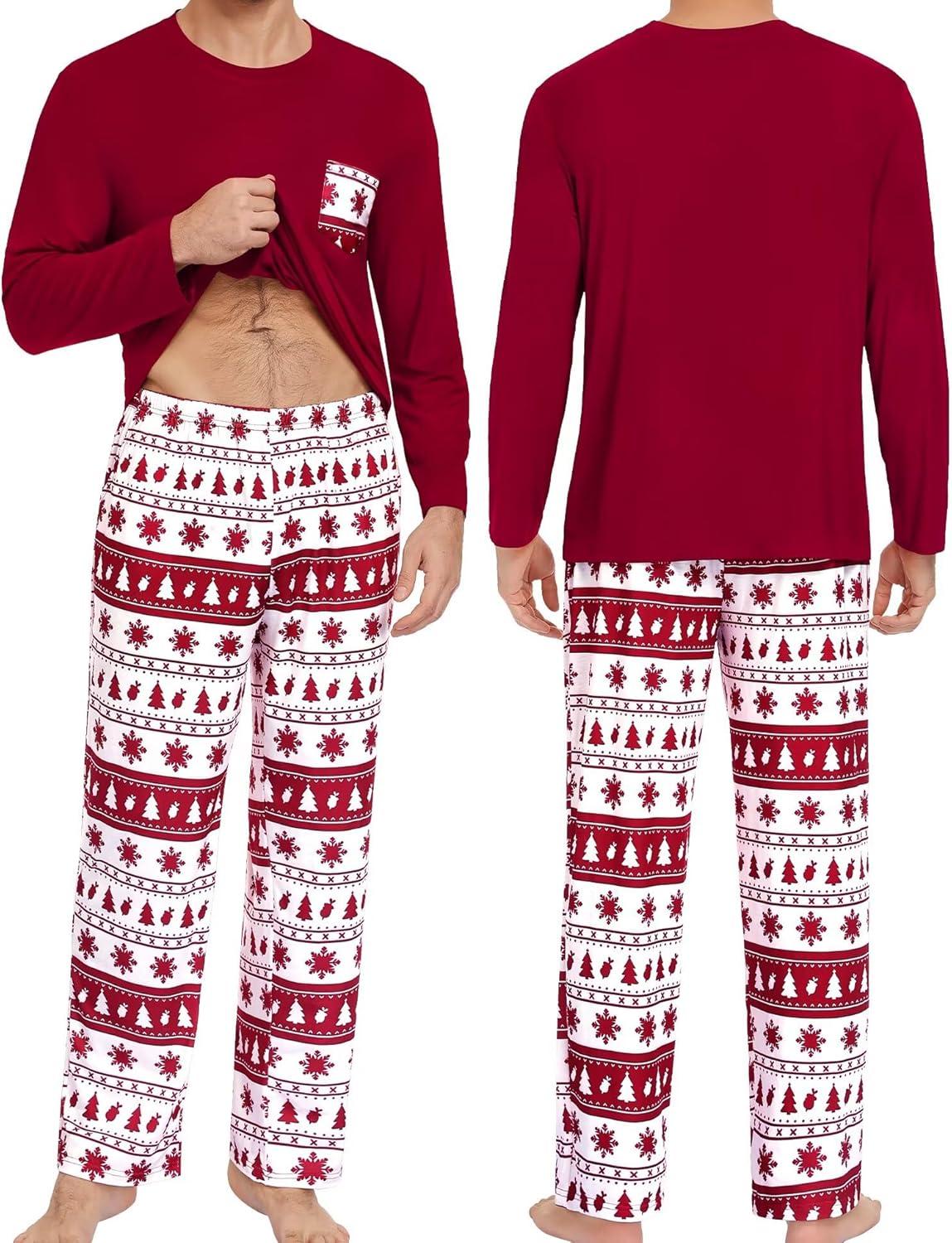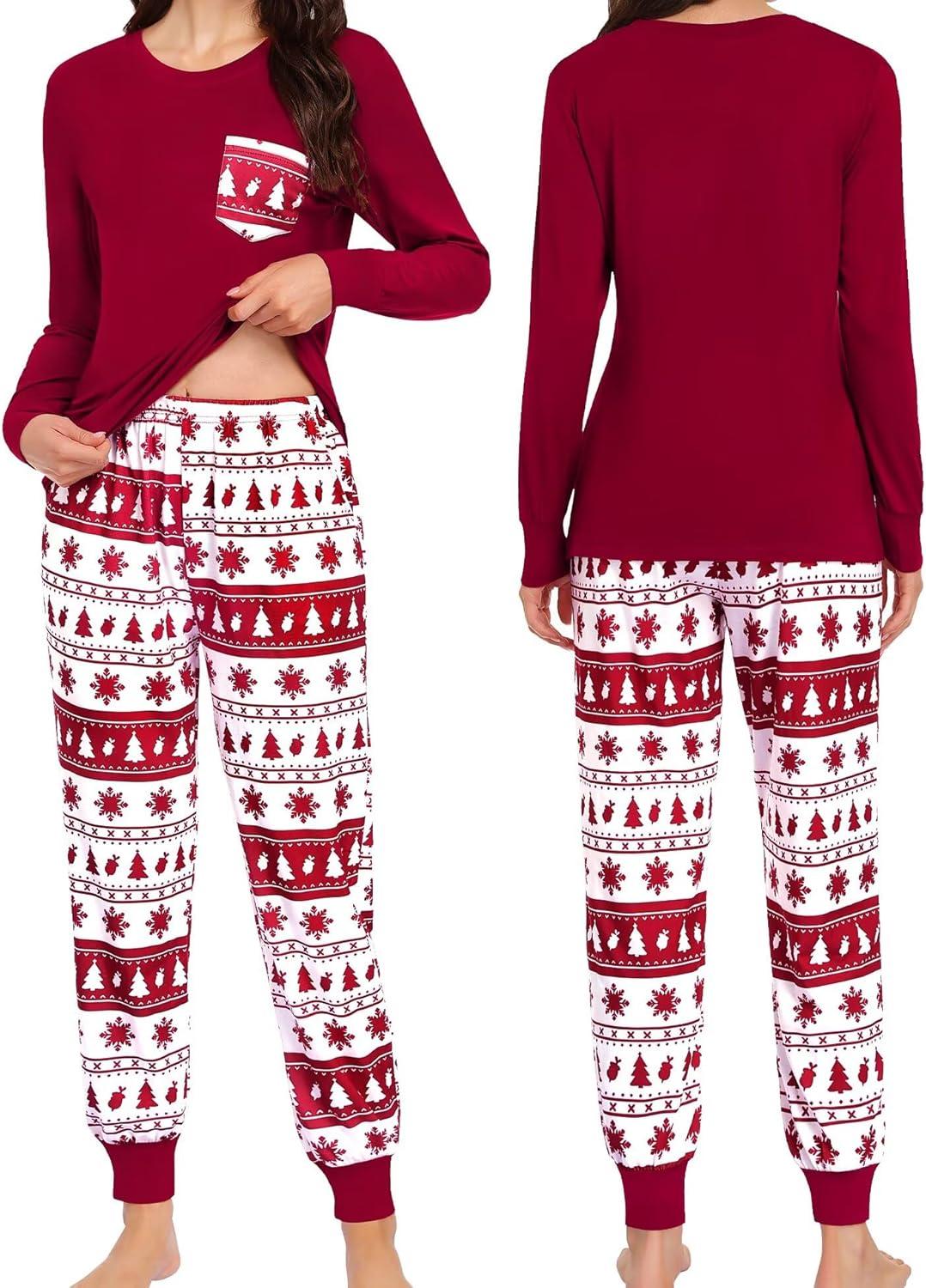 SWOMOG Adult Christmas Pajamas Buffalo Plaid Pajama Pants with Pockets Long Sleeve Tops for Couples & Family(Wine Red Christmas Tree)