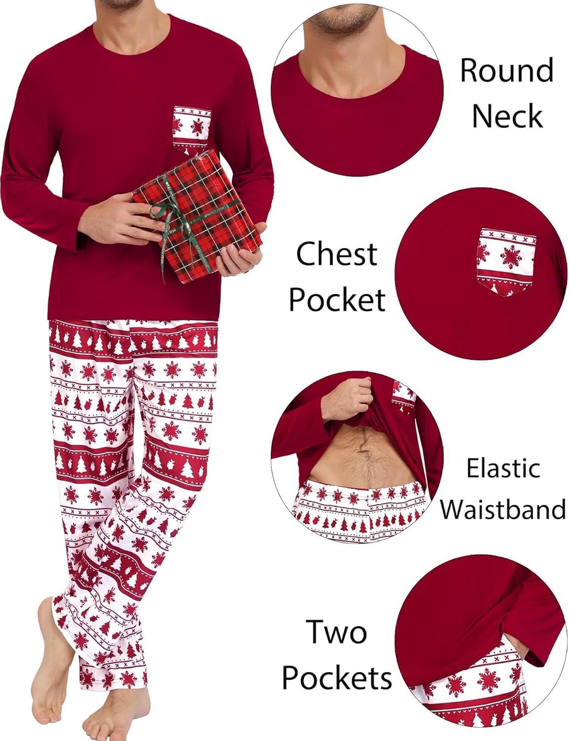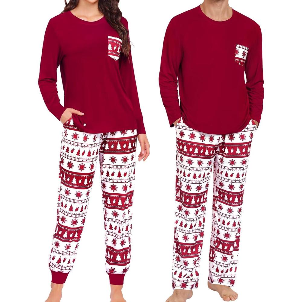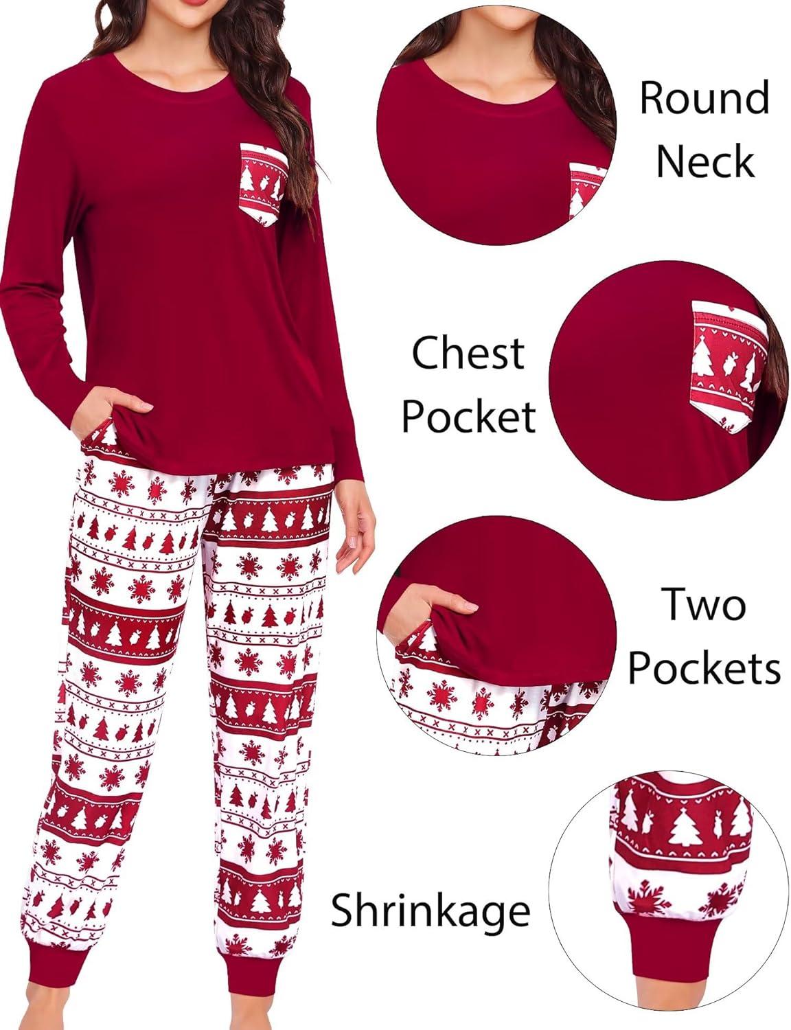 SWOMOG Adult Christmas Pajamas Buffalo Plaid Pajama Pants with Pockets Long Sleeve Tops for Couples & Family(Wine Red Christmas Tree)