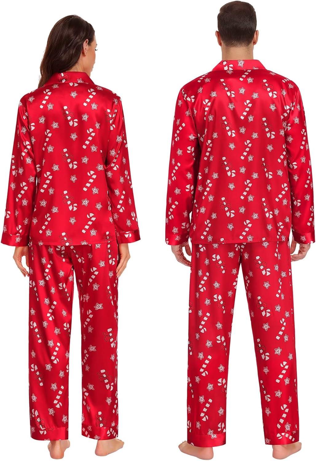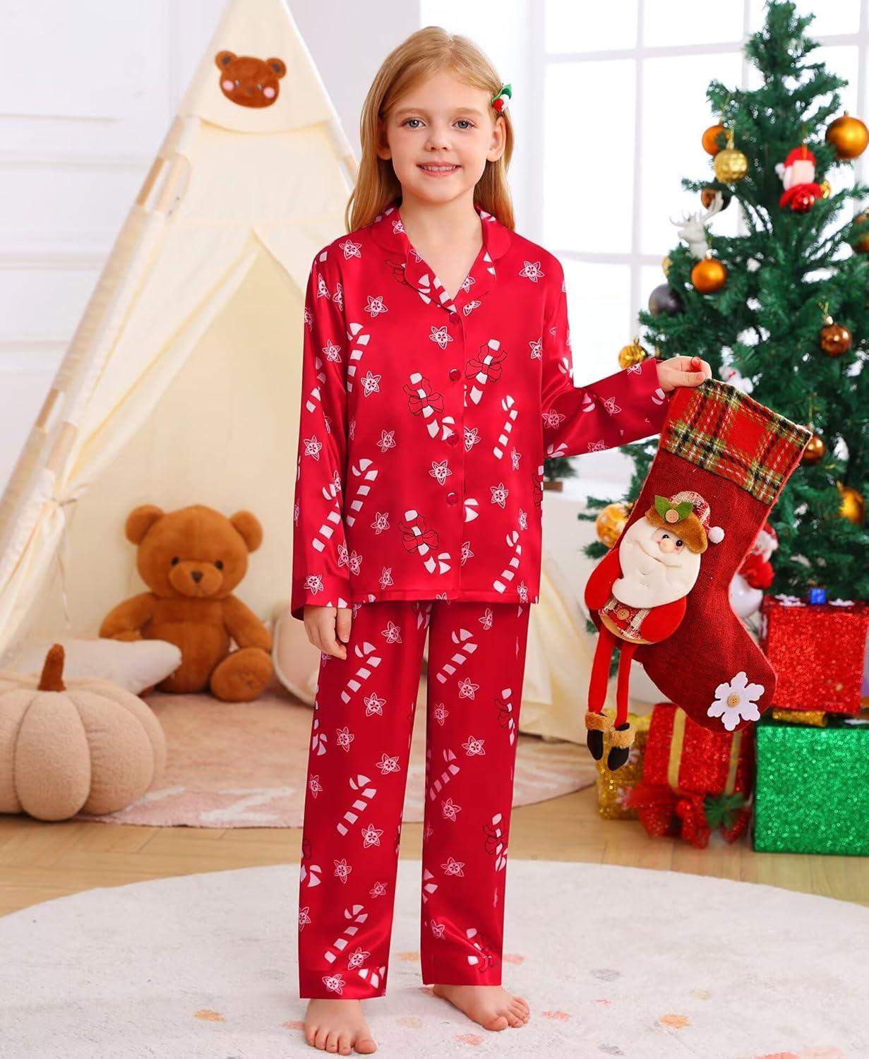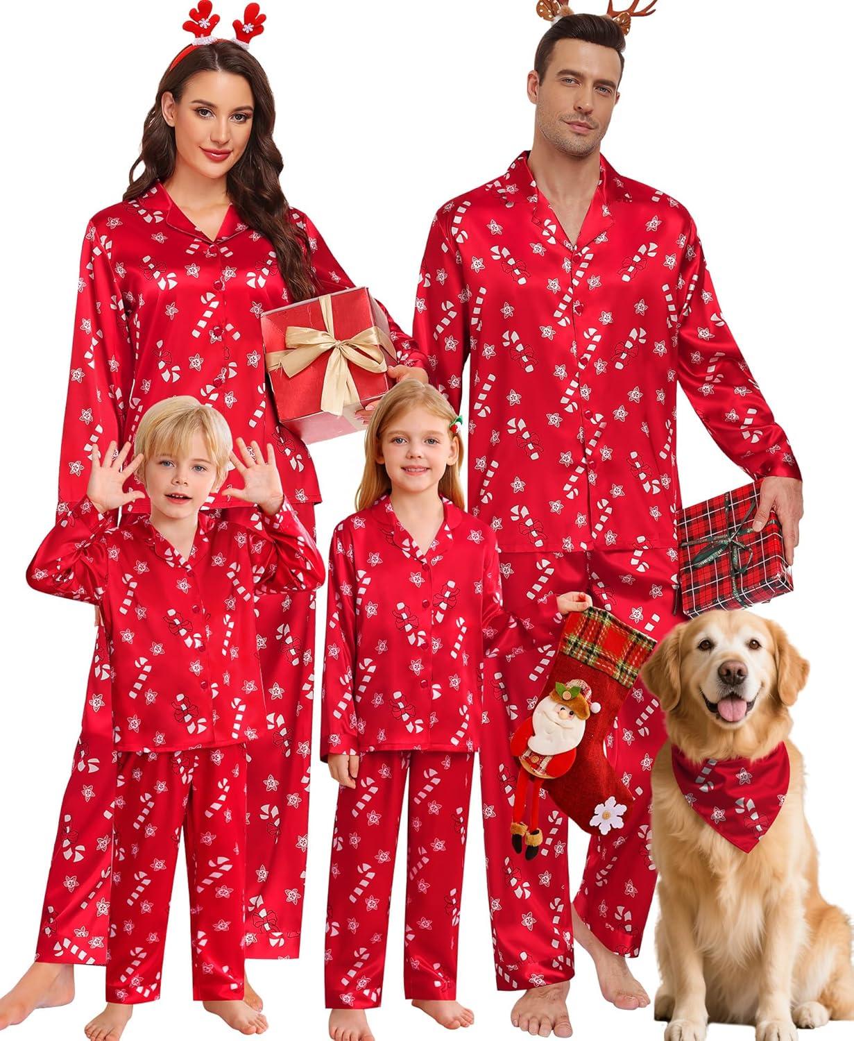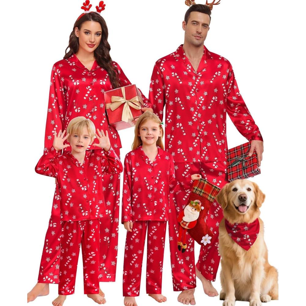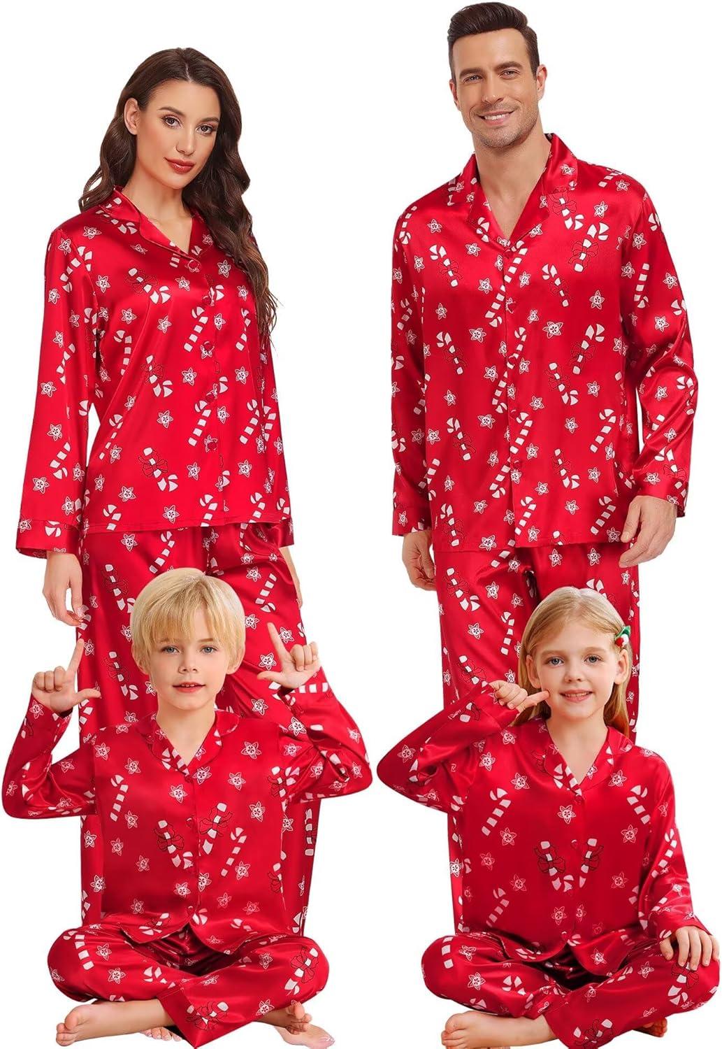 SWOMOG Family Matching Pajamas Silk Satin Long Sleeve Sleepwear Soft Button Down Loungewear 2 Pcs Pj Set(Red Candy Cane)