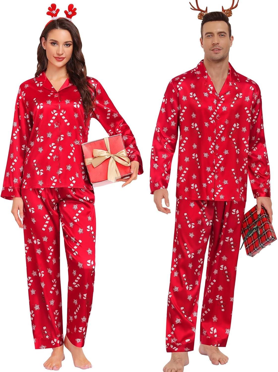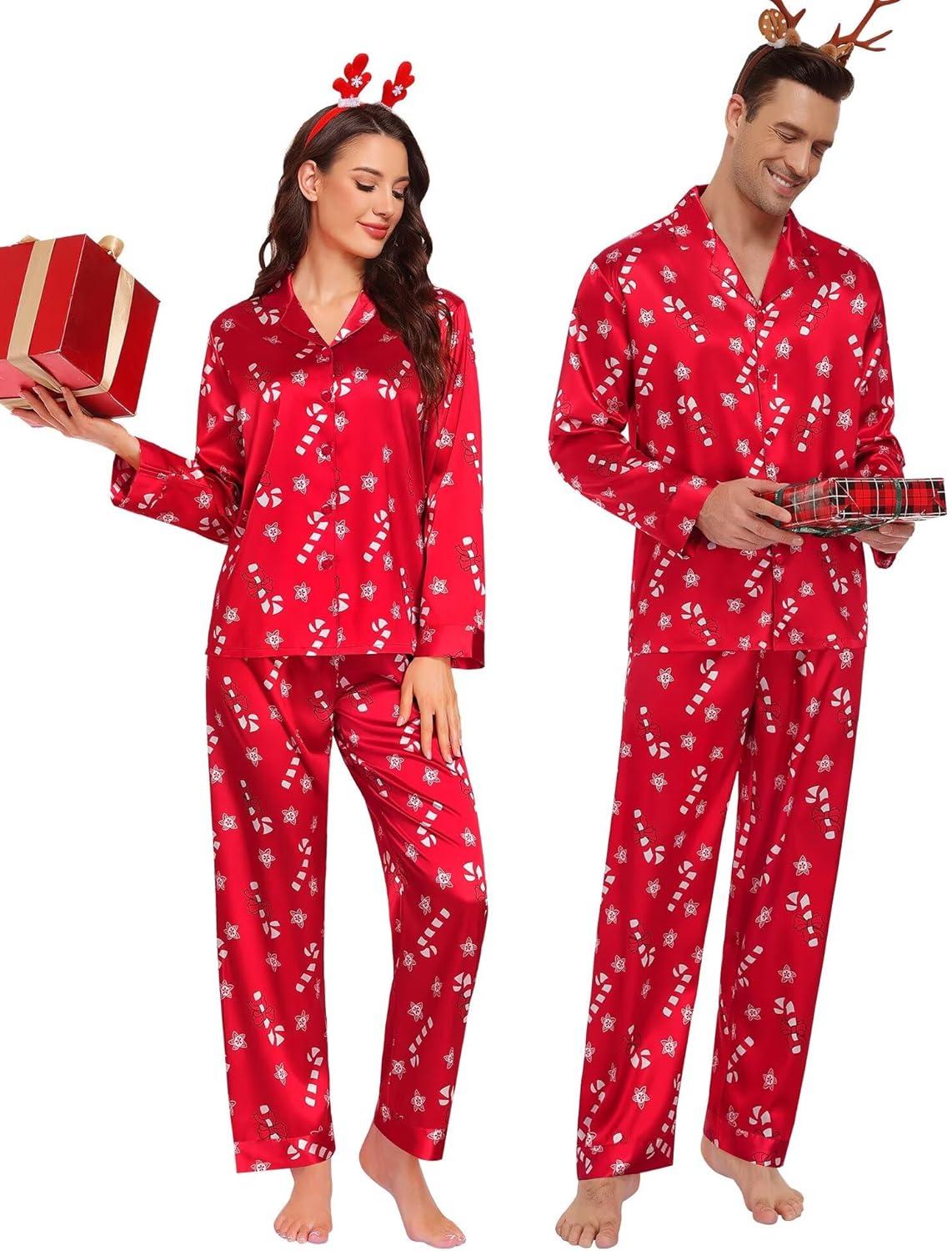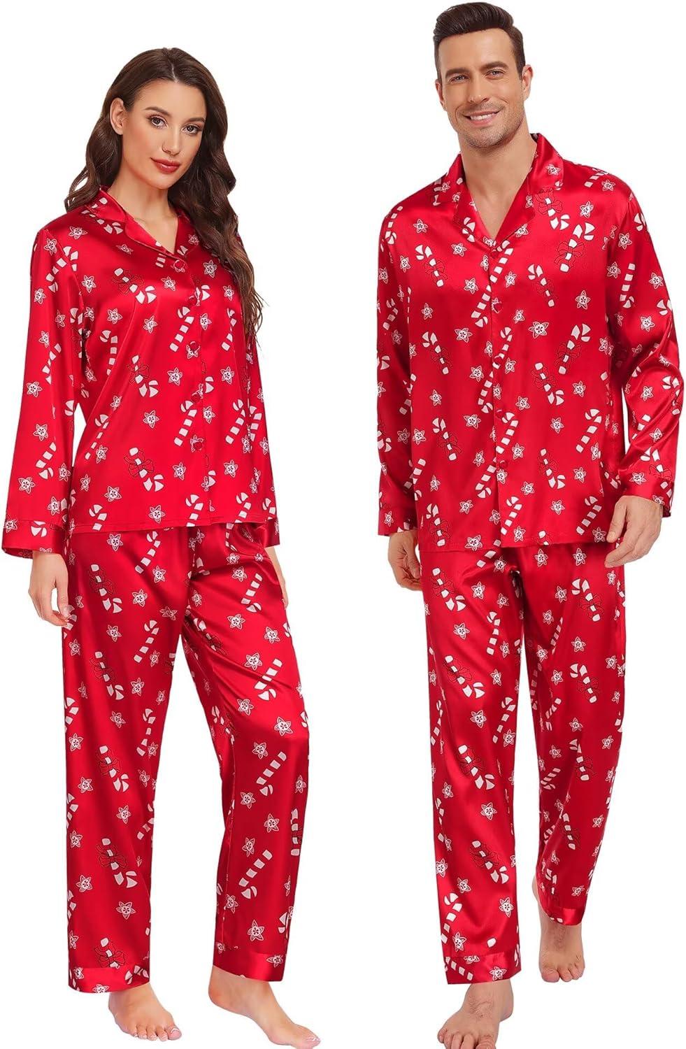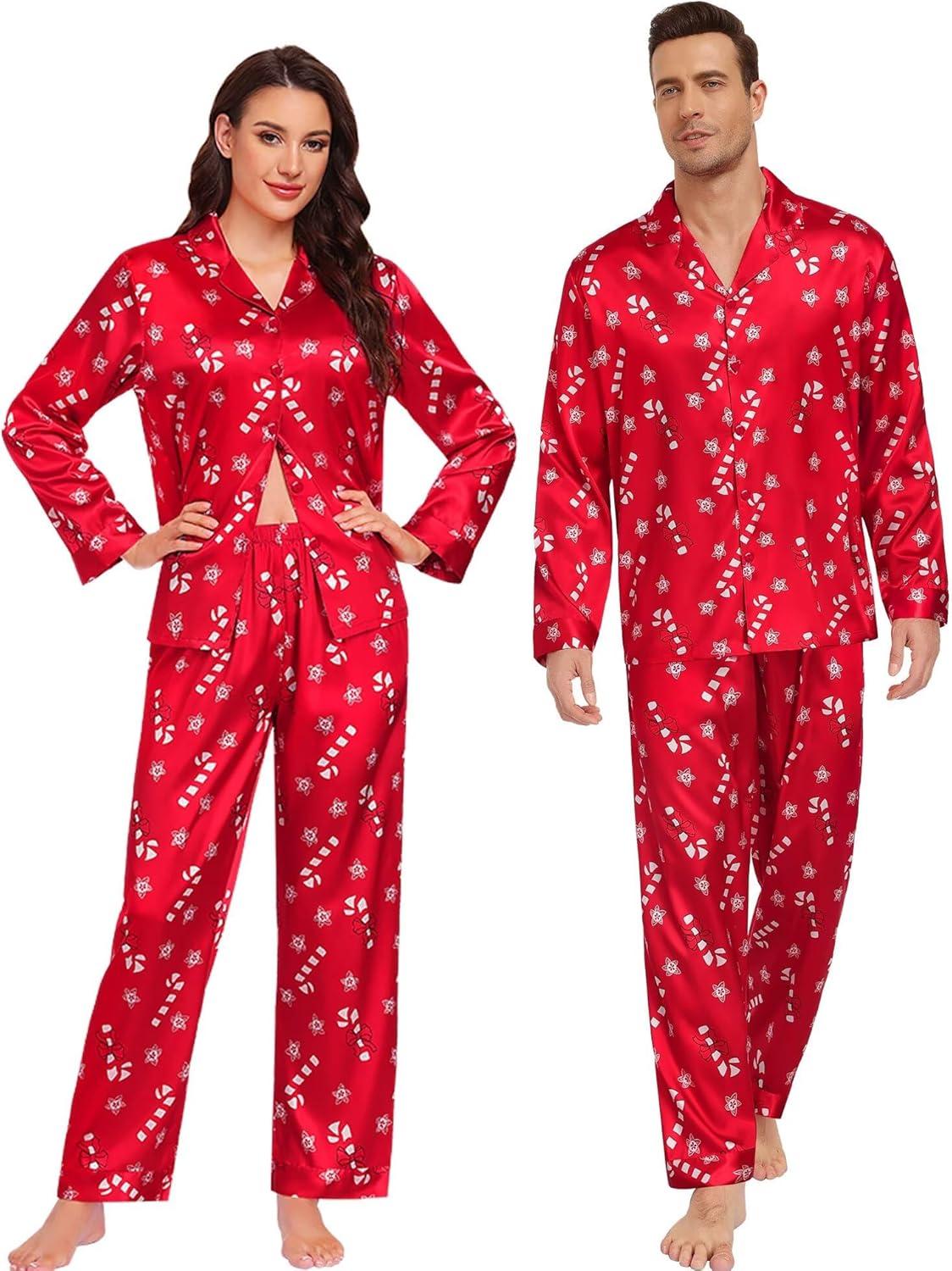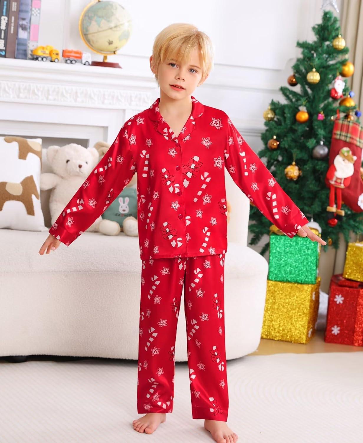 SWOMOG Family Matching Pajamas Silk Satin Long Sleeve Sleepwear Soft Button Down Loungewear 2 Pcs Pj Set(Red Candy Cane)