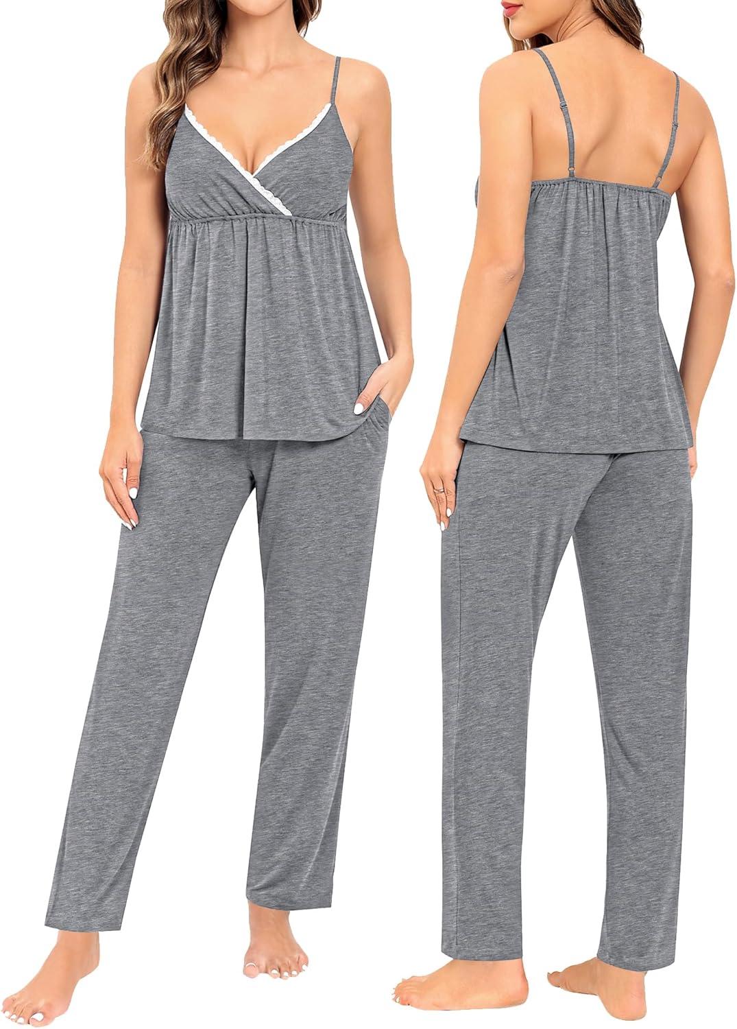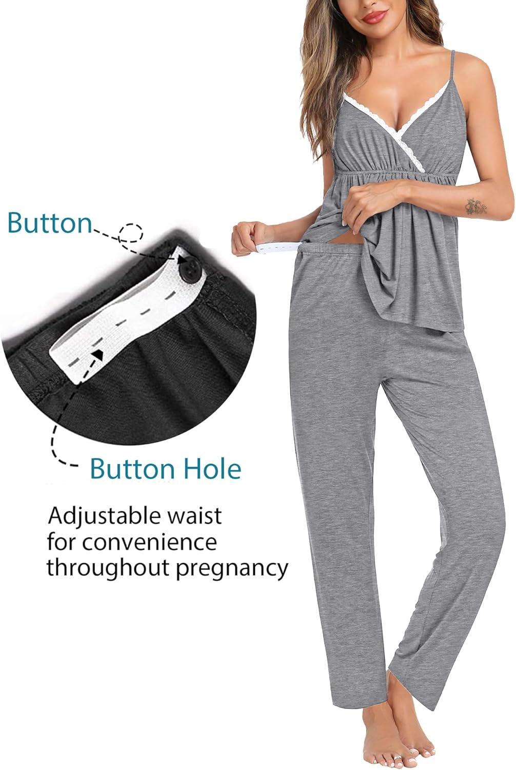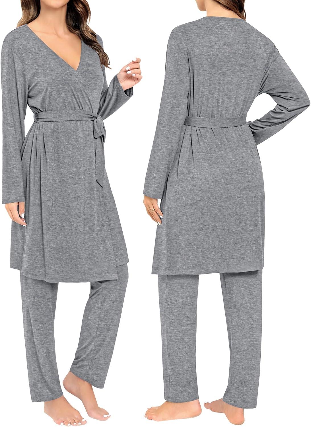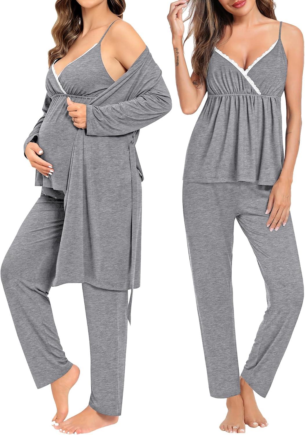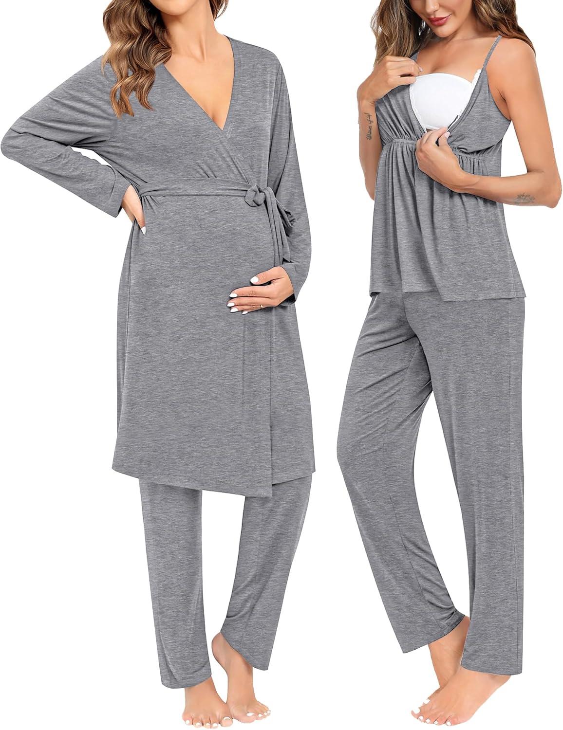 SWOMOG Maternity Nursing Robe Set 3 Piece Breastfeeding Pajamas 3 in 1 Labor Delivery Sleevless Tops&Long Pants Pregnancy Pjs(Grey)