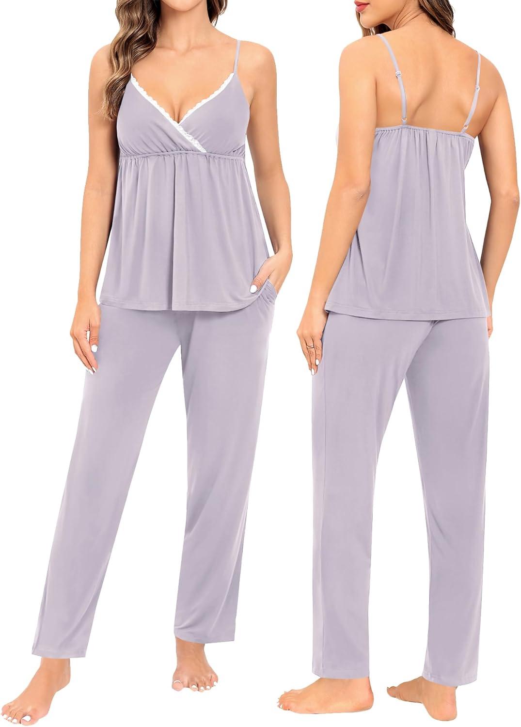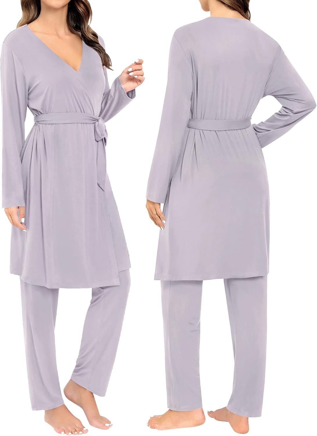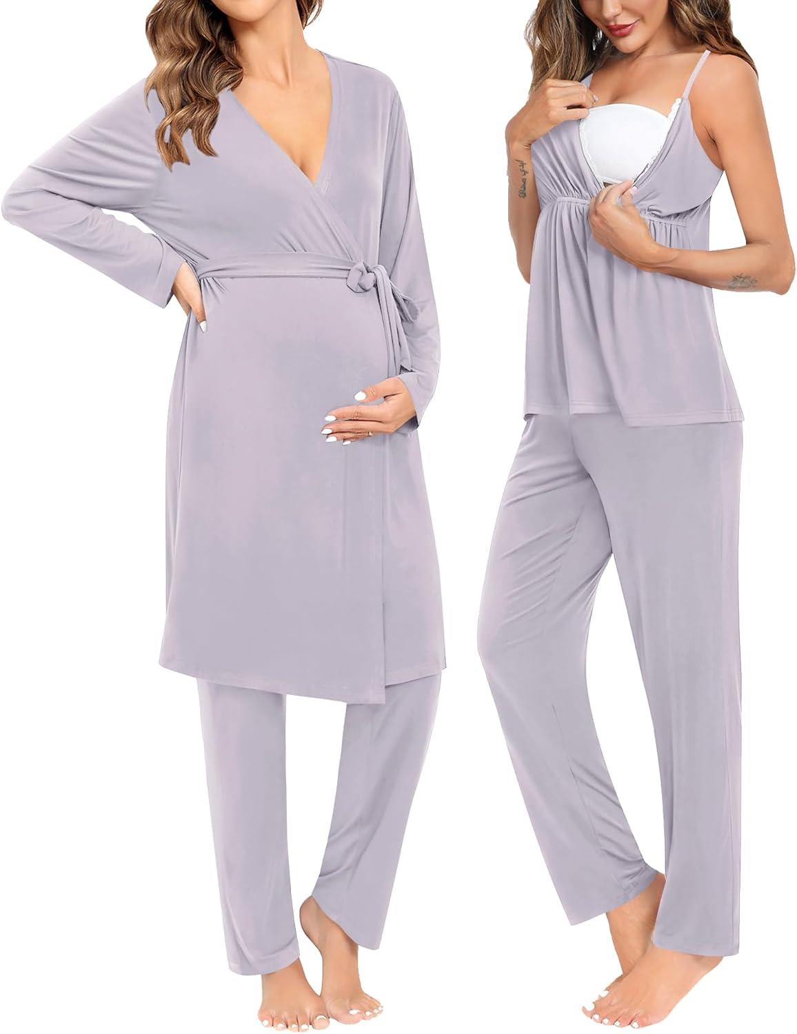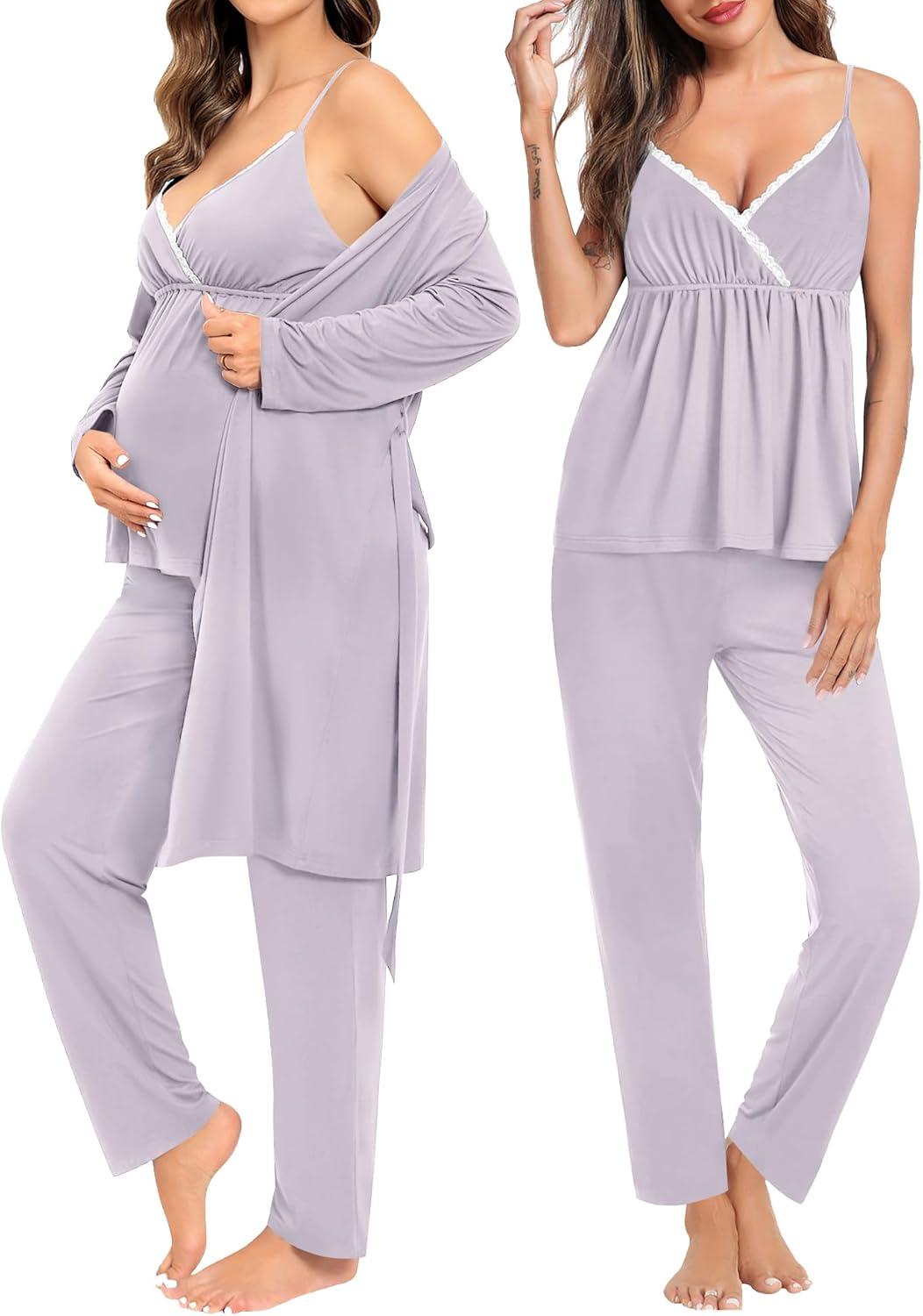 SWOMOG Maternity Nursing Robe Set 3 Piece Breastfeeding Pajamas 3 in 1 Labor Delivery Sleevless Tops&Long Pants Pregnancy Pjs(Lilac)