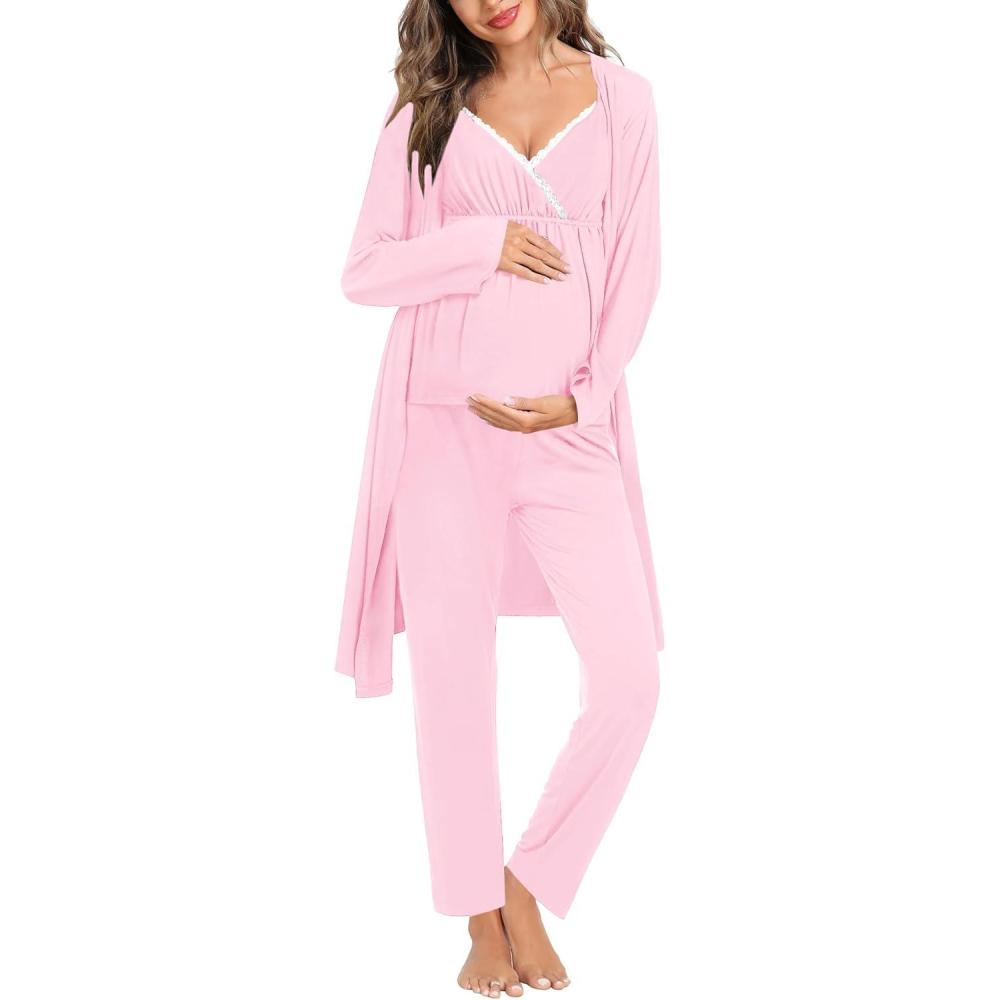 imageSWOMOG Maternity Nursing Robe Set 3 Piece Breastfeeding Pajamas 3 in 1 Labor Delivery Sleevless TopsampampLong Pants Pregnancy PjsPink