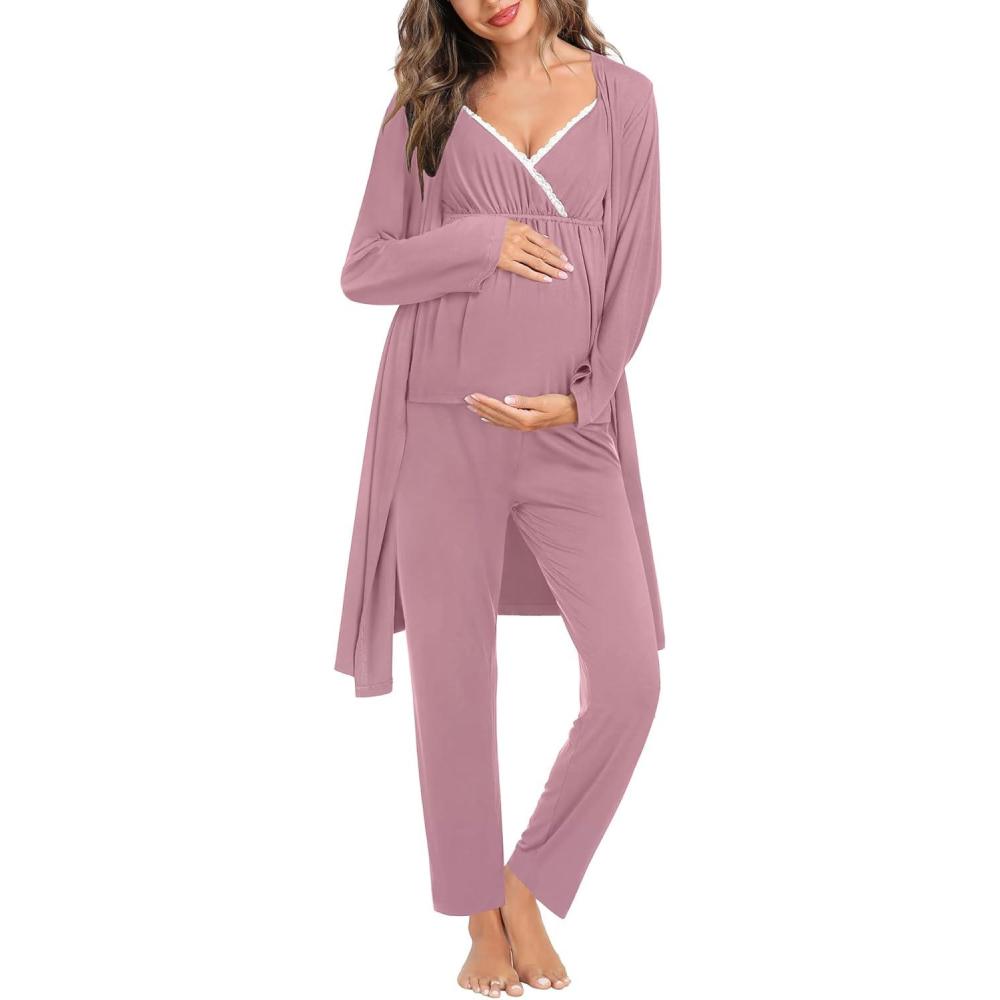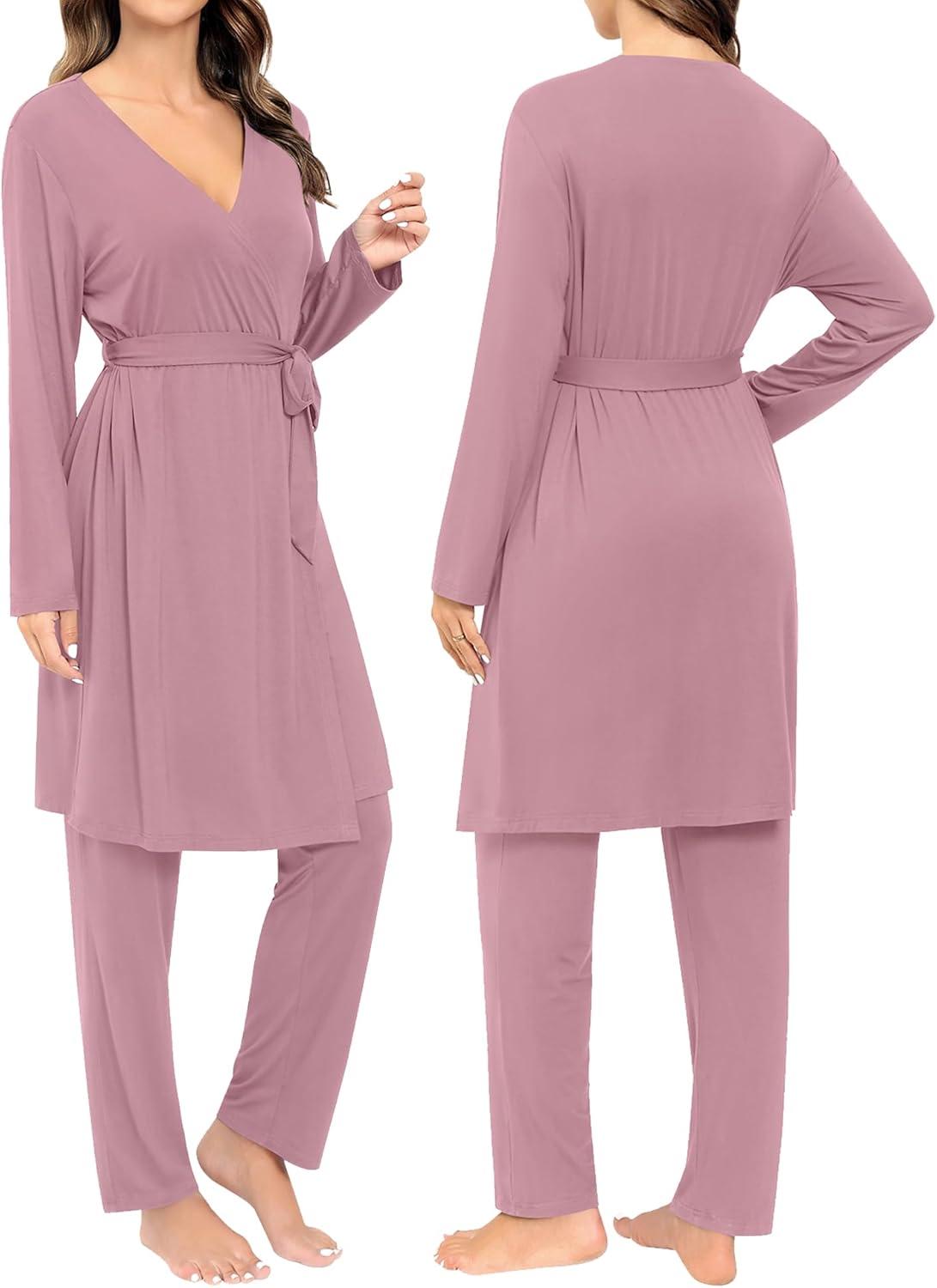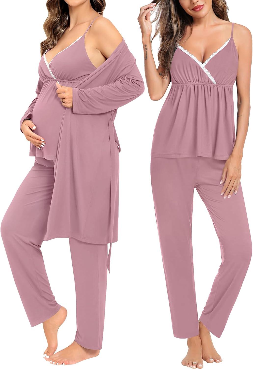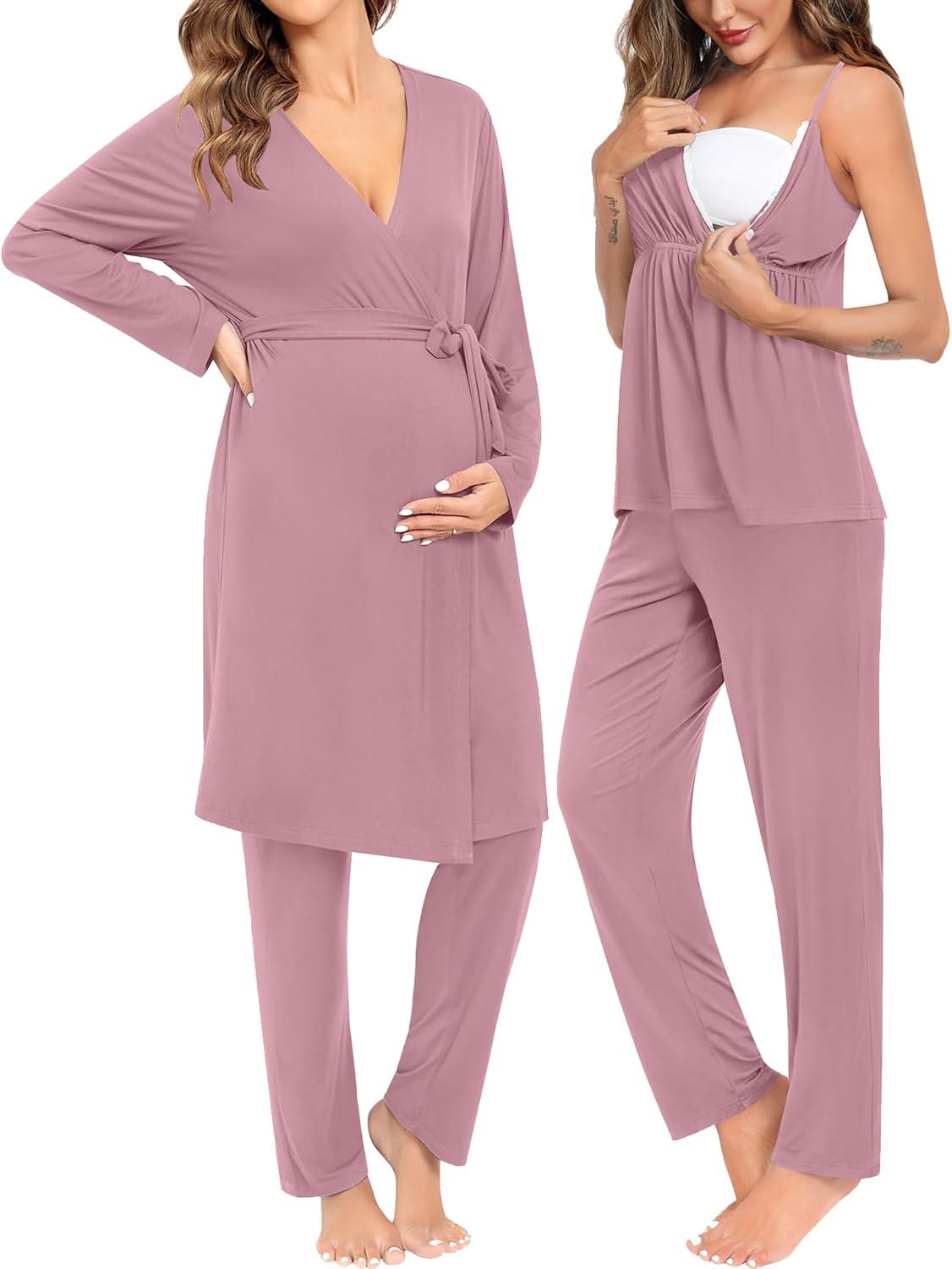 SWOMOG Maternity Nursing Robe Set 3 Piece Breastfeeding Pajamas 3 in 1 Labor Delivery Sleevless Tops&Long Pants Pregnancy Pjs(Taro Purple)