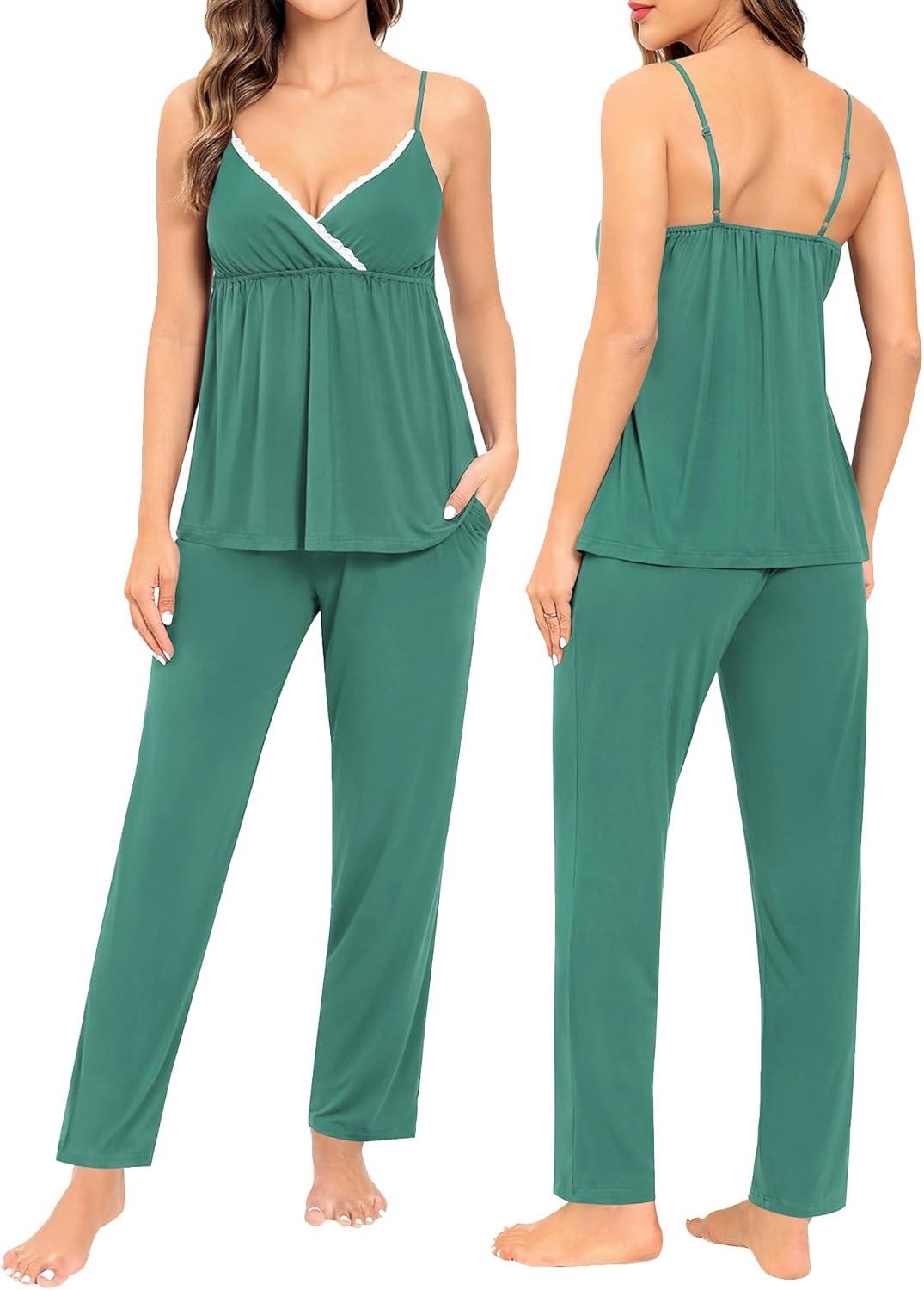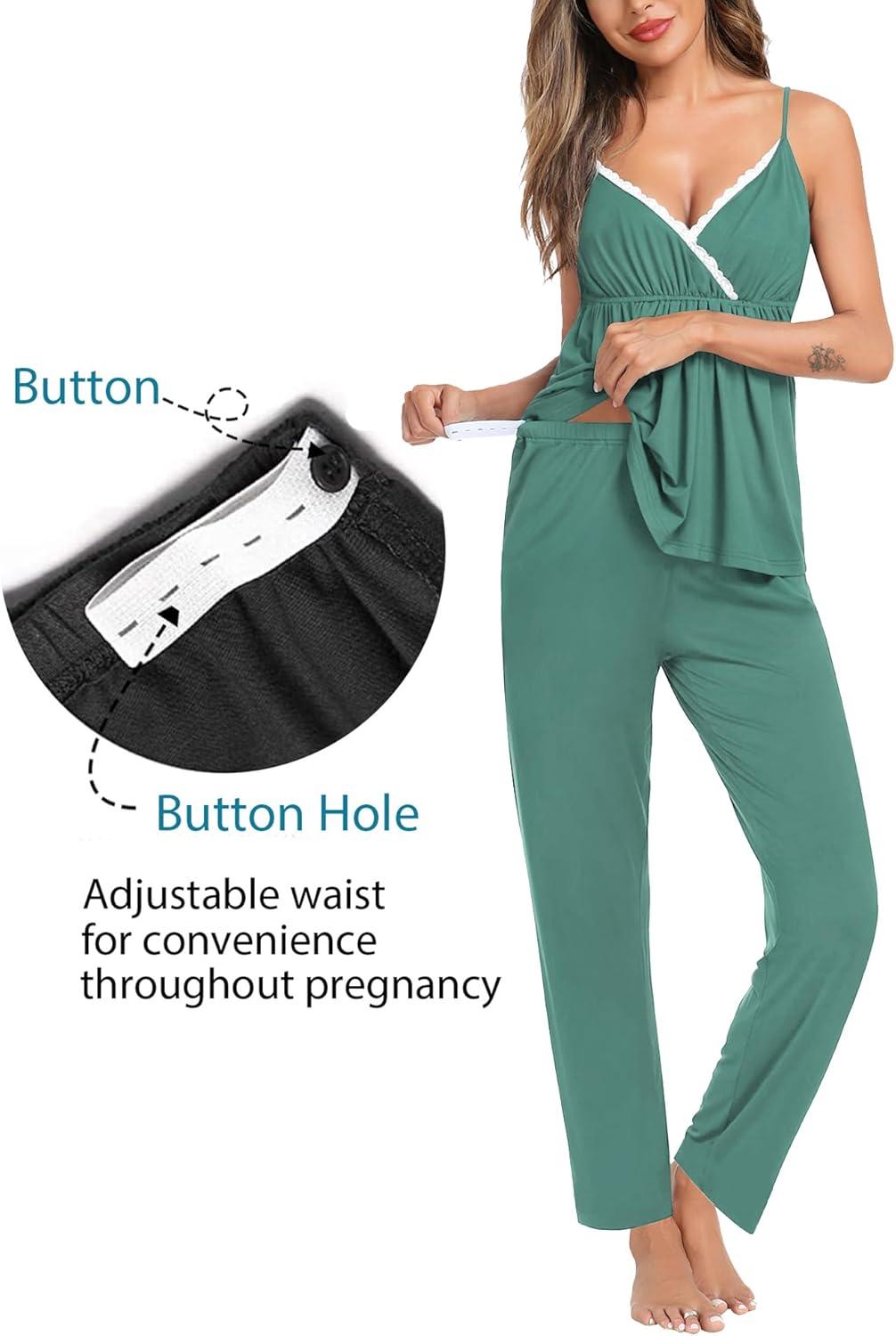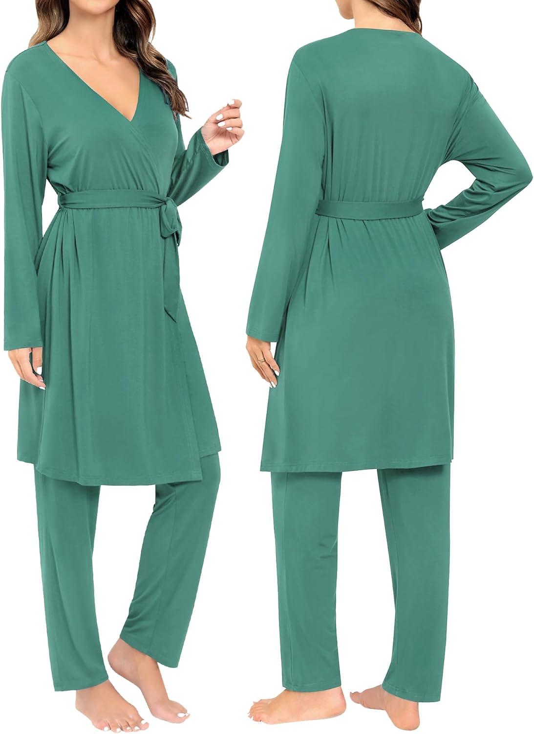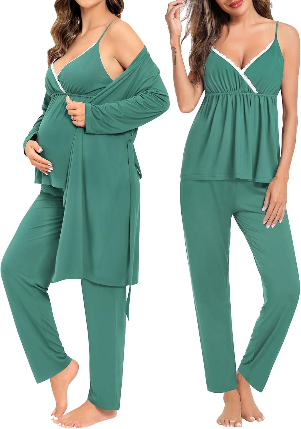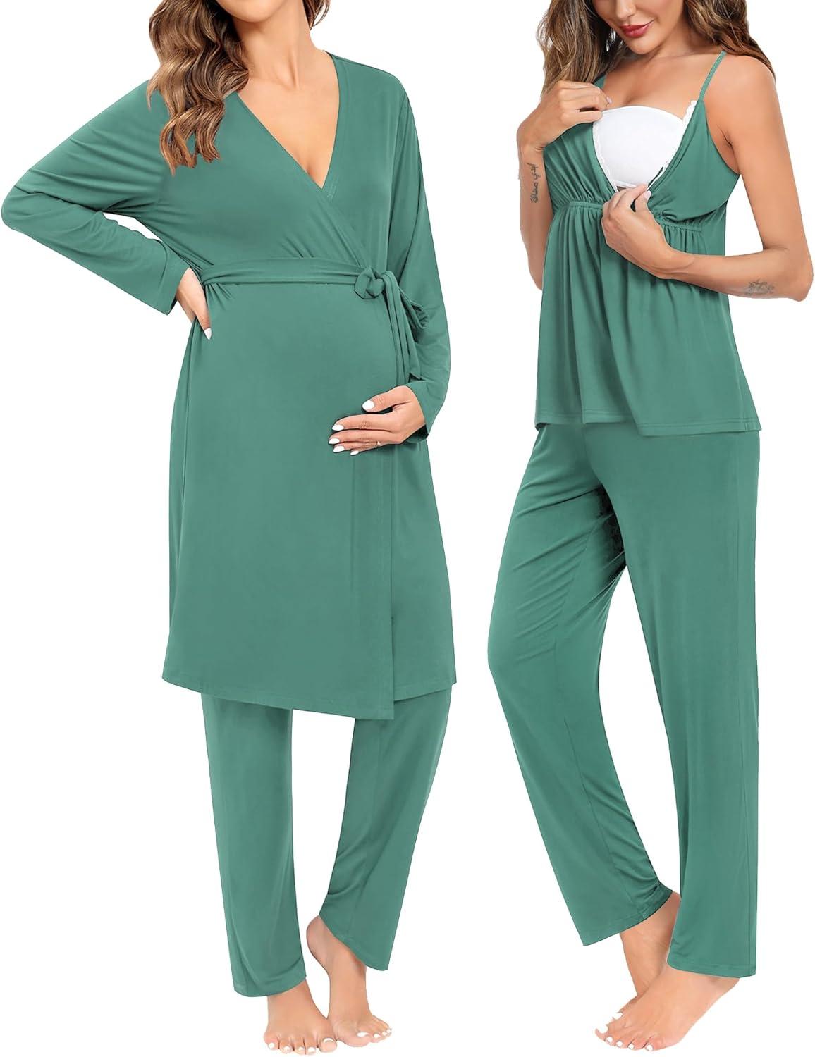 SWOMOG Maternity Nursing Robe Set 3 Piece Breastfeeding Pajamas 3 in 1 Labor Delivery Sleevless Tops&Long Pants Pregnancy Pjs(Teal Green)