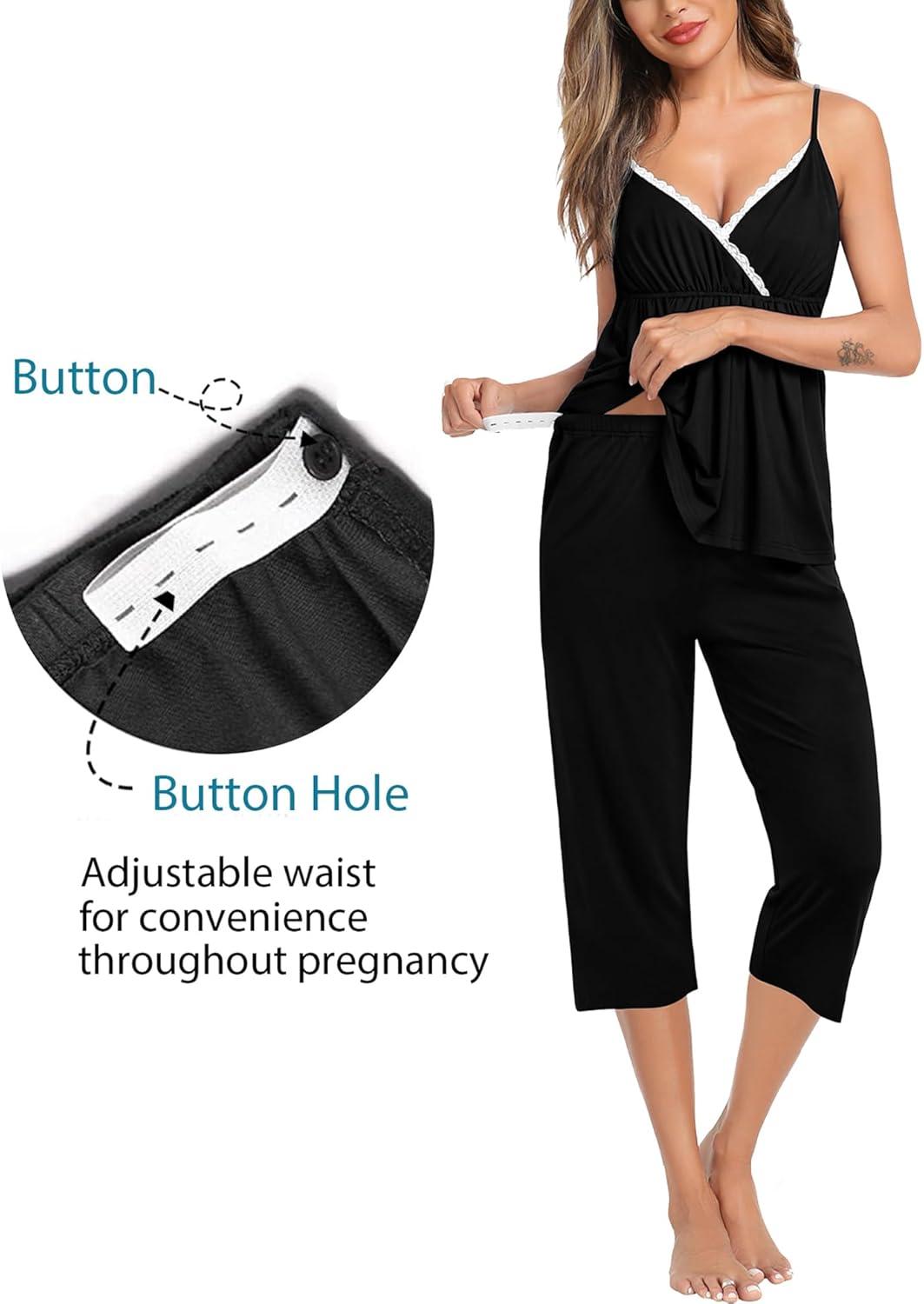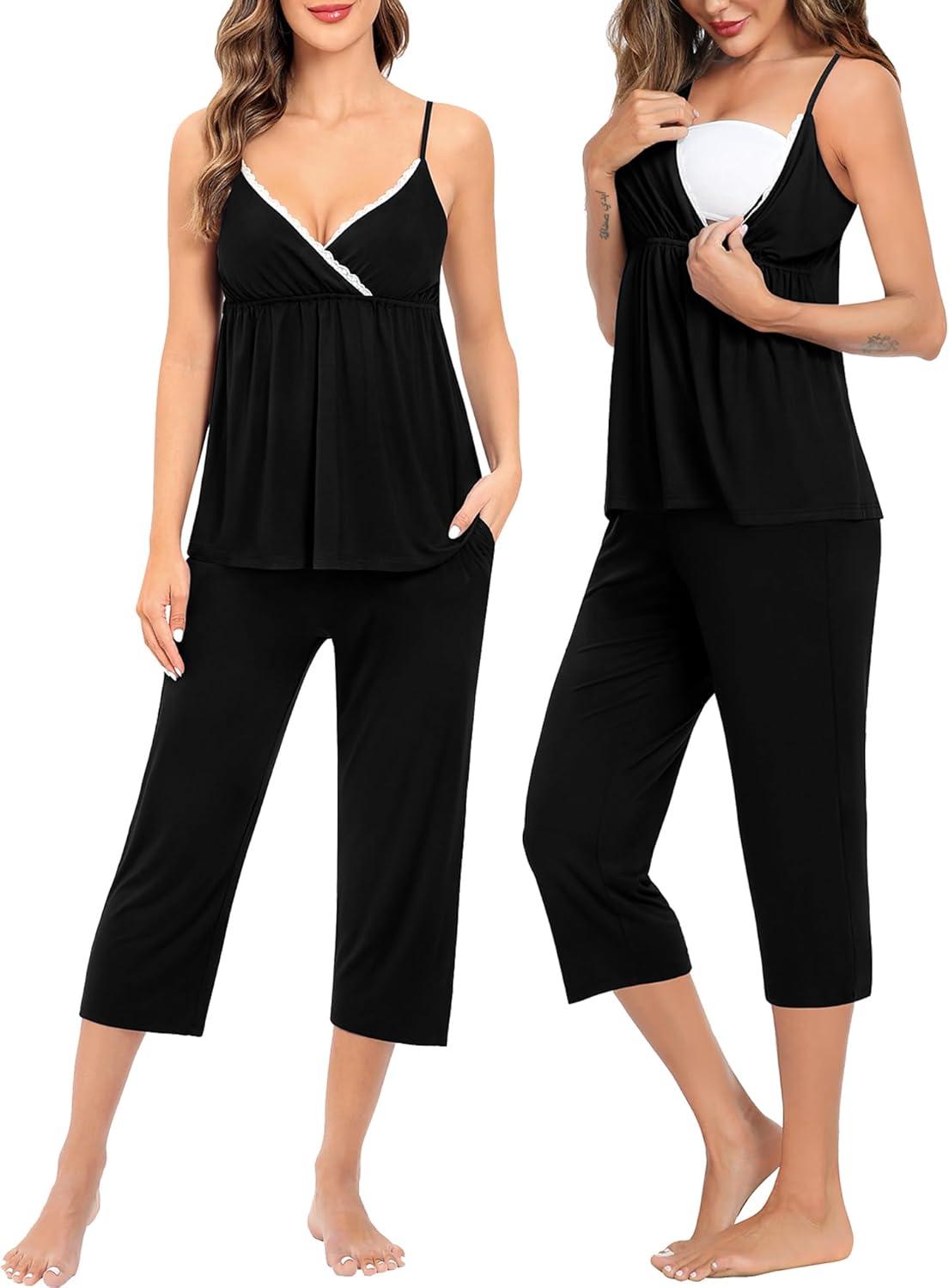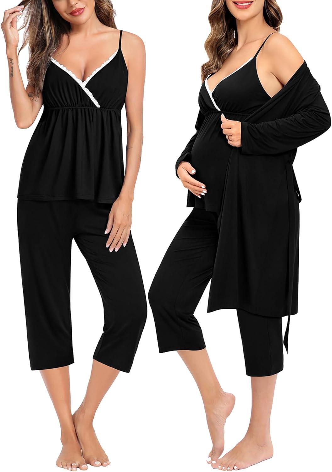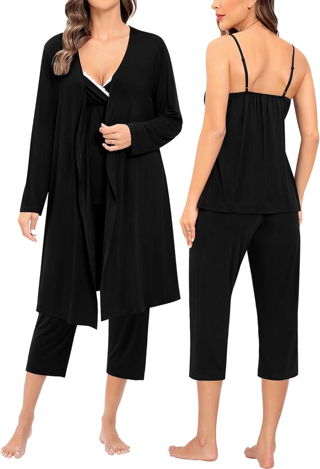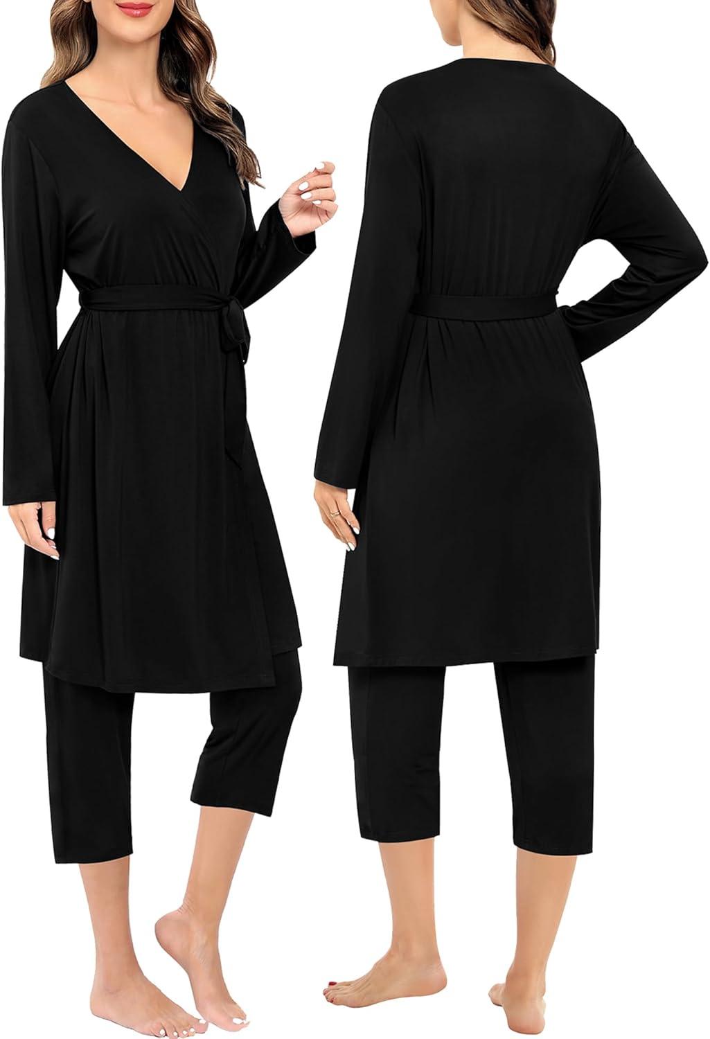 SWOMOG Maternity Nursing Robe Set 3 Piece Breastfeeding Pajamas 3 in 1 Labor Delivery Sleevless Tops&Long Pants Pregnancy Pjs(Z Capri-carbon Black)