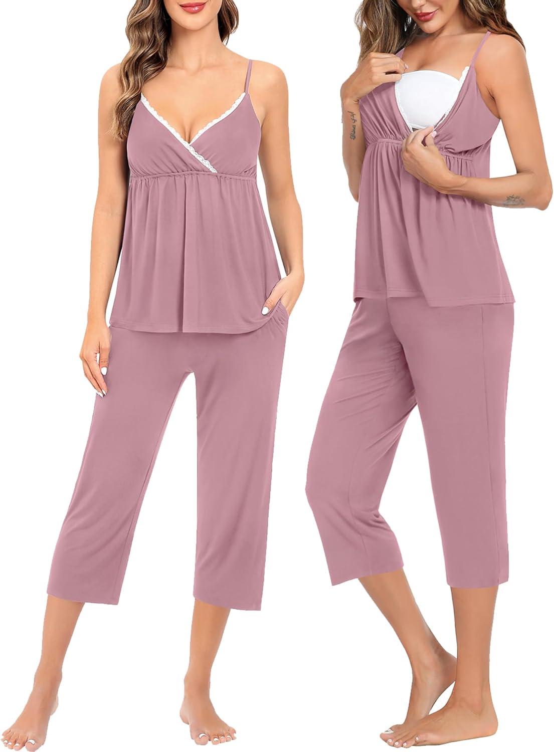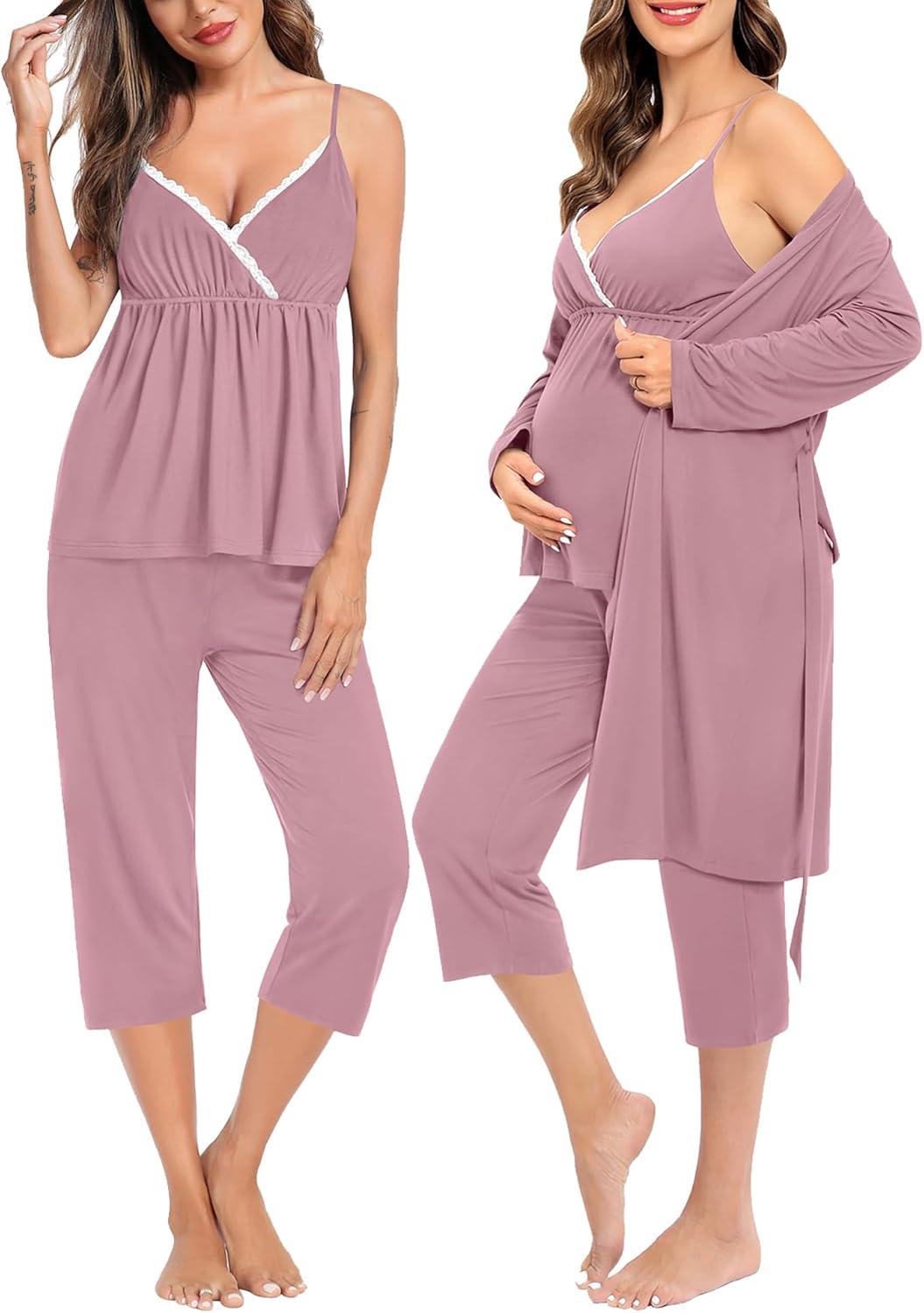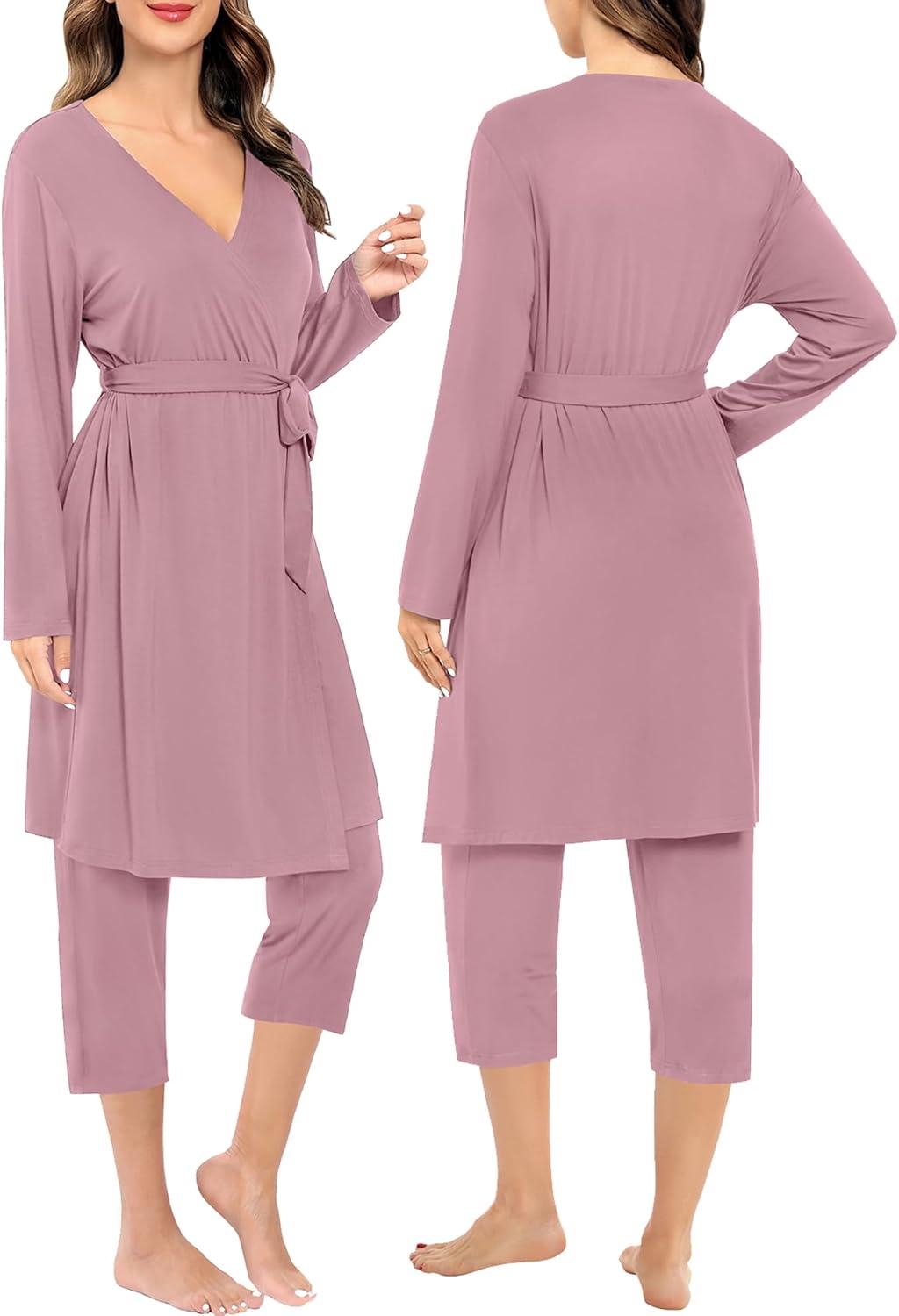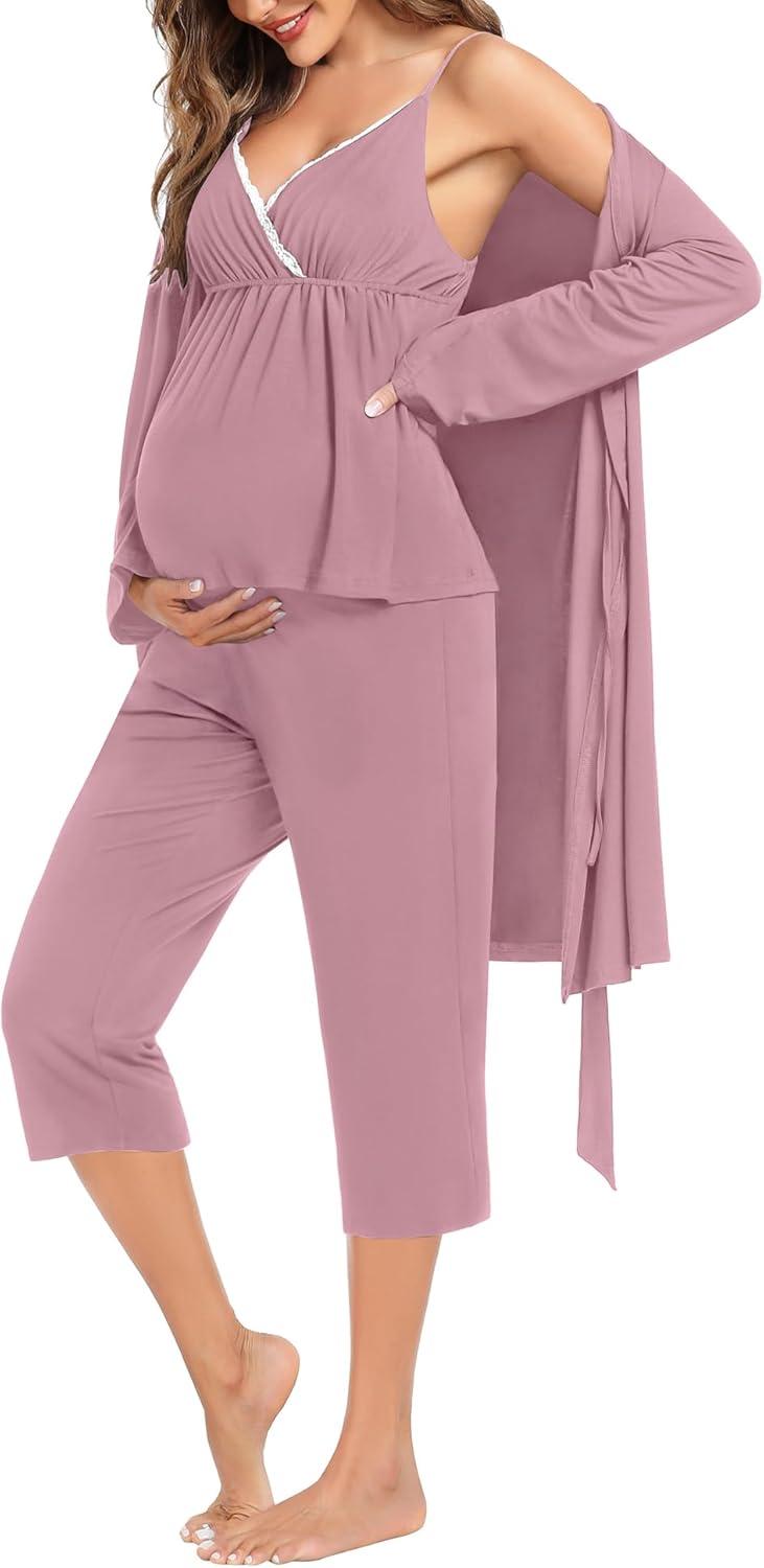 SWOMOG Maternity Nursing Robe Set 3 Piece Breastfeeding Pajamas 3 in 1 Labor Delivery Sleevless Tops&Long Pants Pregnancy Pjs(Z Capri-lilac Purple)