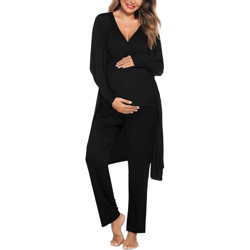 SWOMOG Maternity Nursing Robe Set 3 Piece Postpartum Breastfeeding Pajamas 3 in 1 Hospital Labor Delivery Pregnancy Pjs(Black-pants)