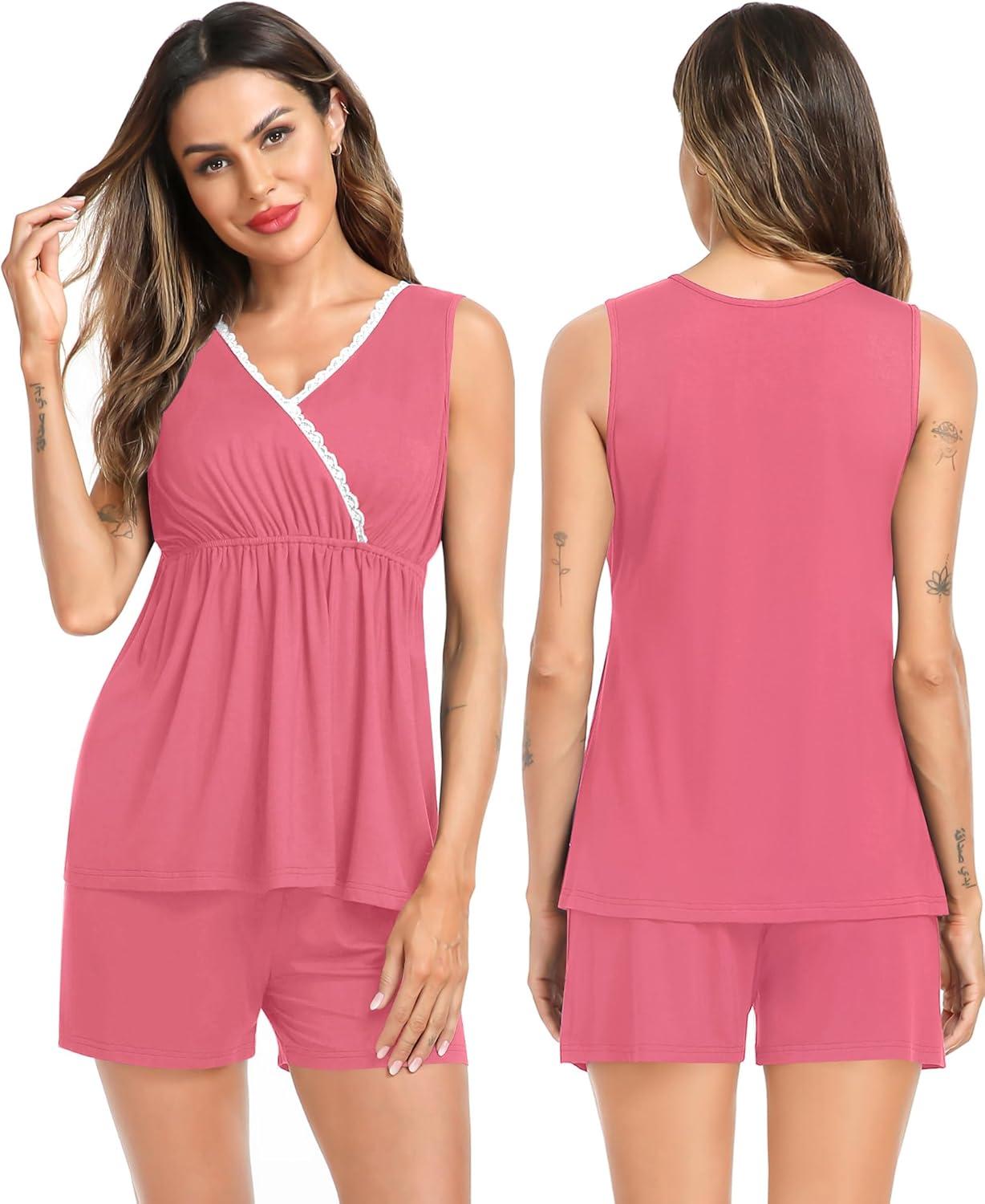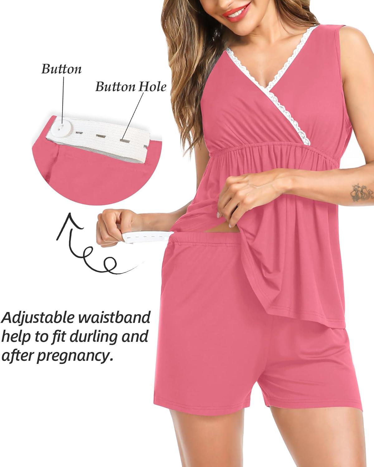 Crafted from high-quality, stretchy fabric, this set is perfect for your growing bump, providing comfort and support throughout your pregnancy. The convenient nursing clips on the sleevless tops make breastfeeding a breeze, while the cozy long pants ensure a peaceful night's sleep for both mom and baby.