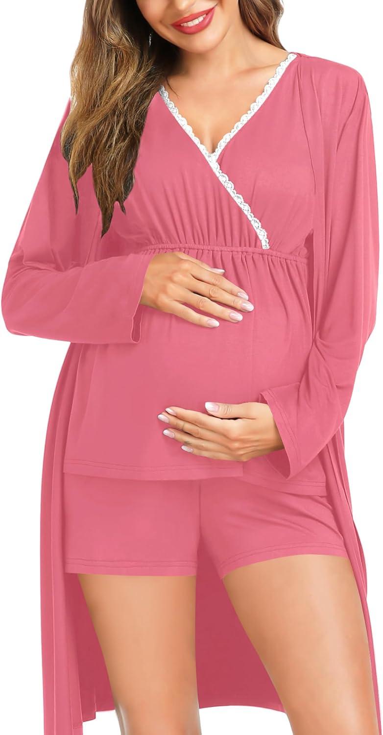 SWOMOG Maternity Nursing Robe Set 3 Piece Postpartum Breastfeeding Pajamas 3 in 1 Hospital Labor Delivery Pregnancy Pjs(Coral-shorts)