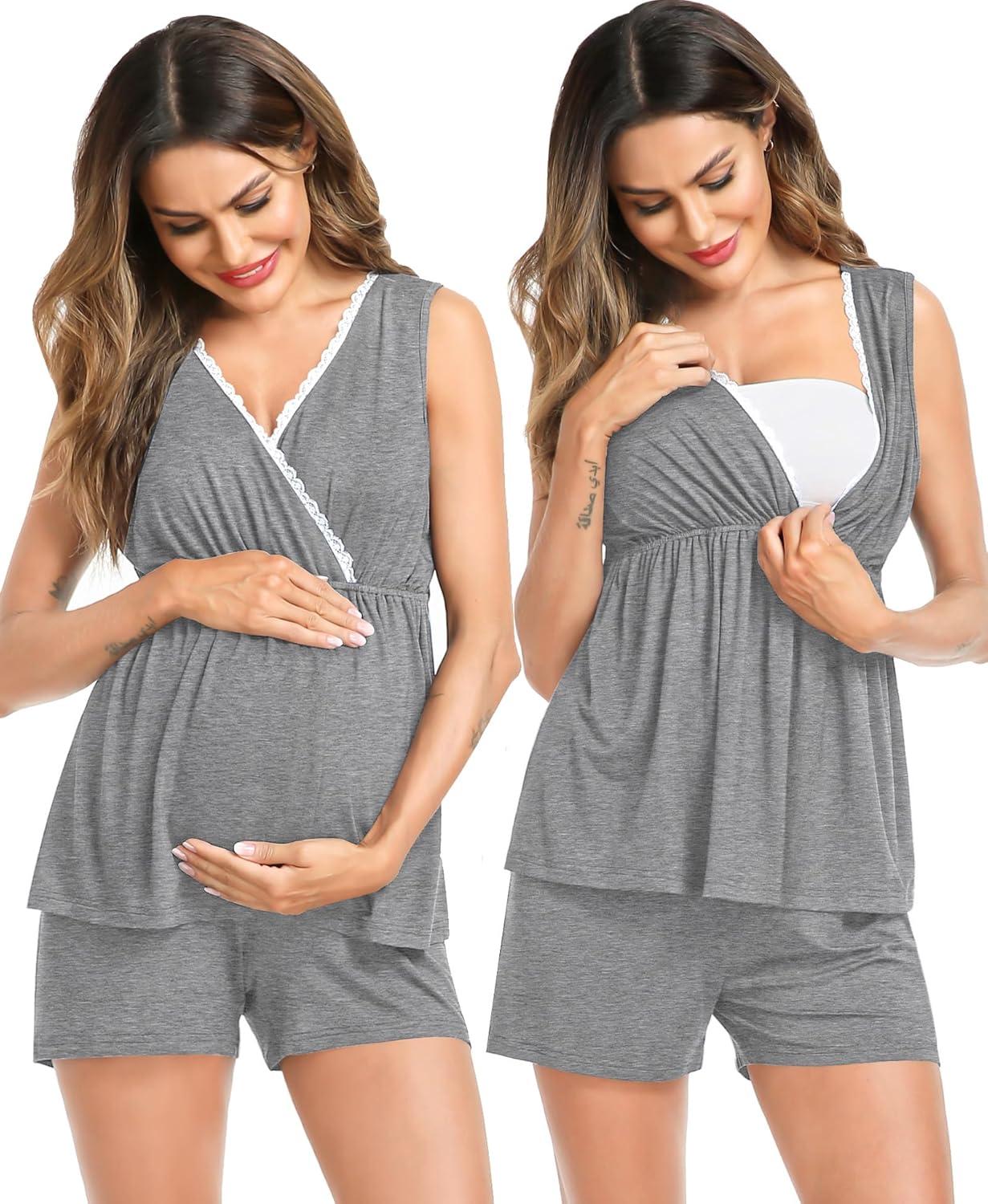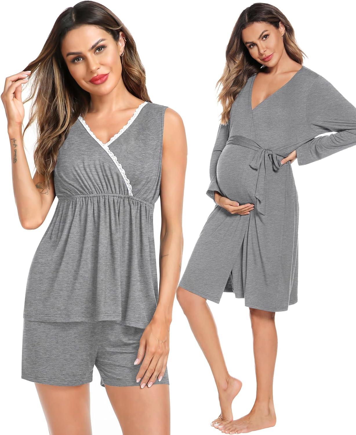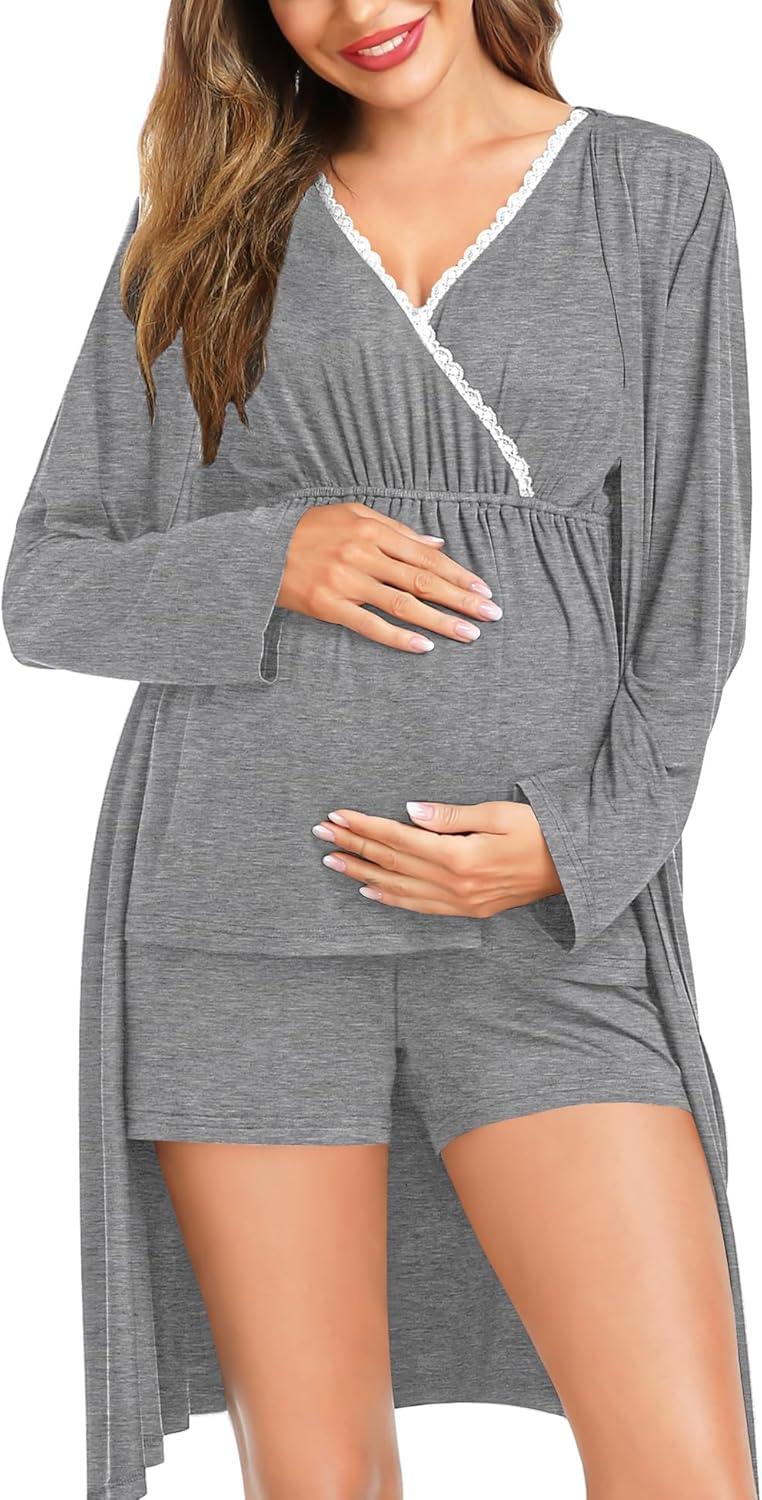 SWOMOG Maternity Nursing Robe Set 3 Piece Postpartum Breastfeeding Pajamas 3 in 1 Hospital Labor Delivery Pregnancy Pjs(Grey-shorts)