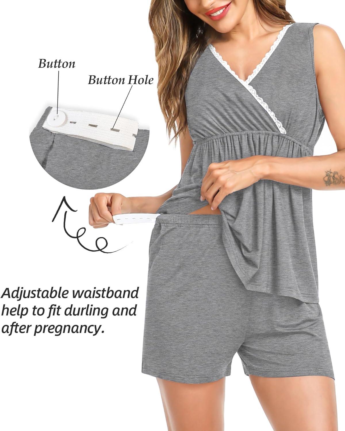 Crafted from high-quality, stretchy fabric, this set is perfect for your growing bump, providing comfort and support throughout your pregnancy. The convenient nursing clips on the sleevless tops make breastfeeding a breeze, while the cozy long pants ensure a peaceful night's sleep for both mom and baby.