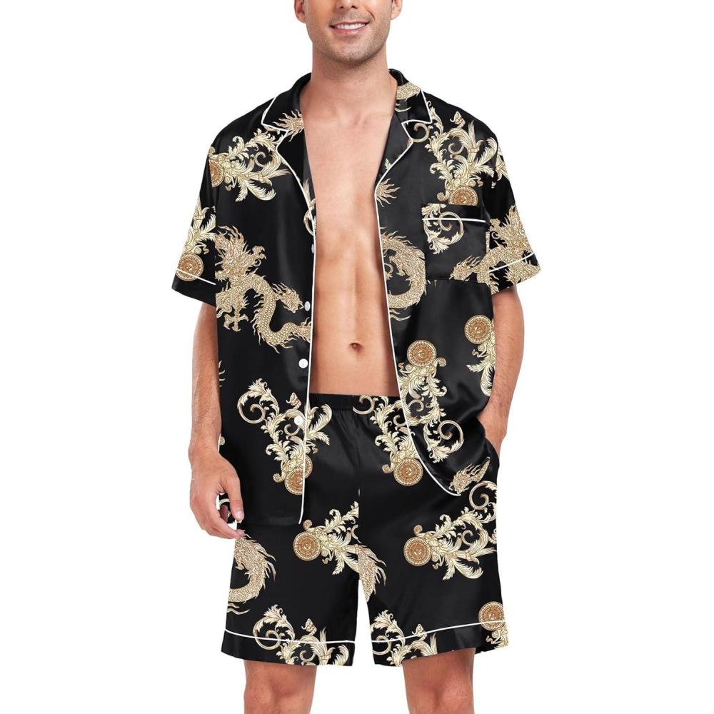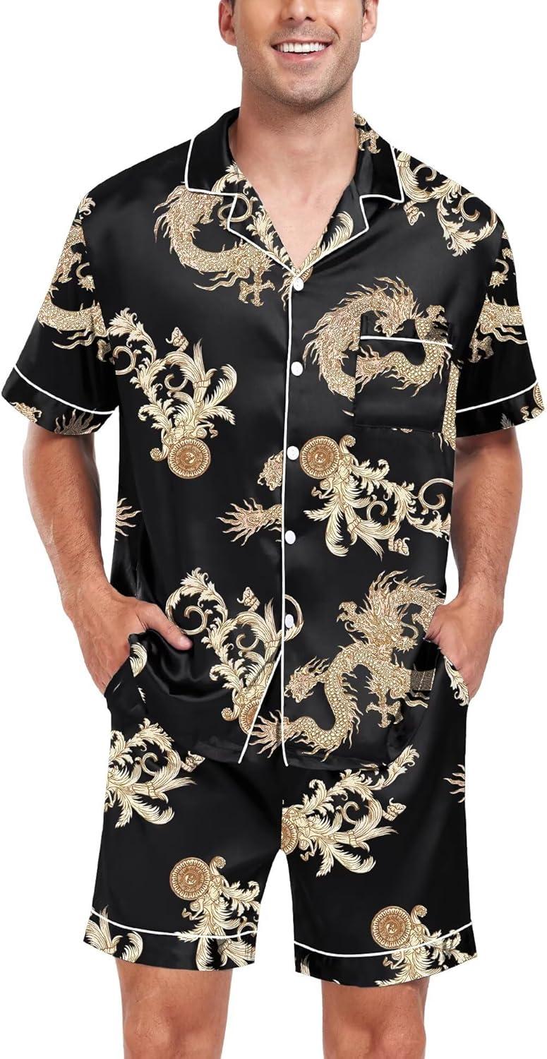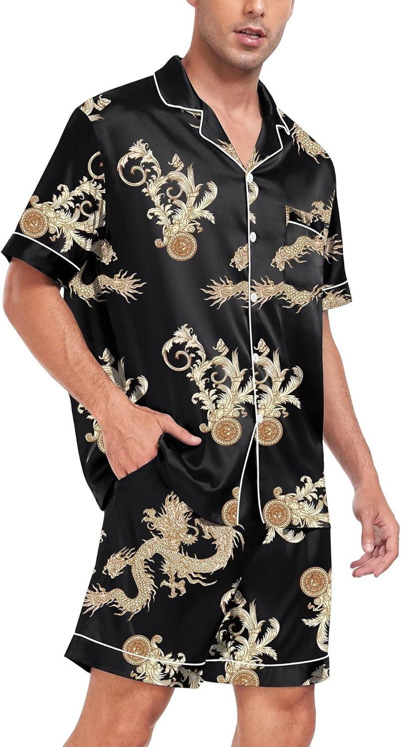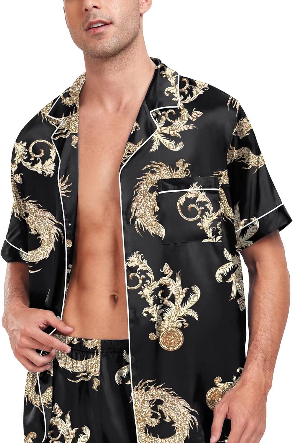 SWOMOG Men Satin Silk Pajamas Sets Short Sleeve Sleepwear Button-Down PJs Sets Two-Pieces Loungewear with Pockets(Leopard)
