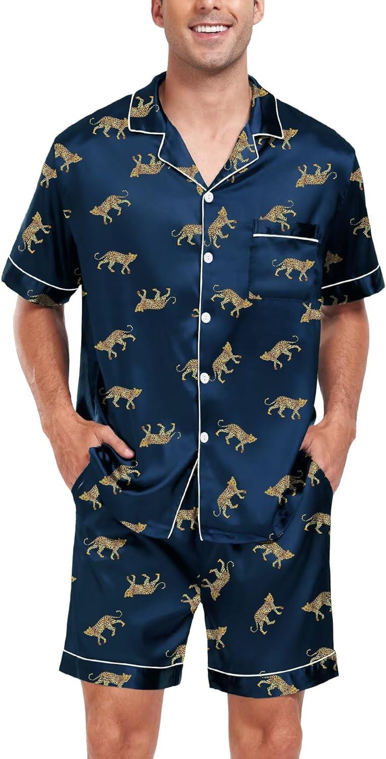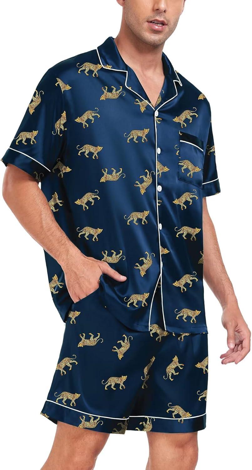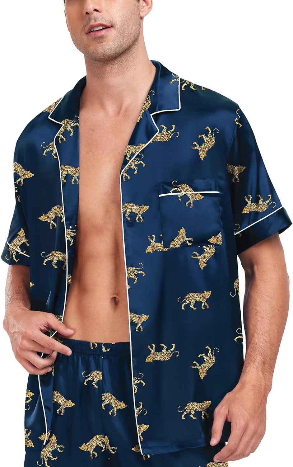 SWOMOG Men Satin Silk Pajamas Sets Short Sleeve Sleepwear Button-Down PJs Sets Two-Pieces Loungewear with Pockets(Navy Bue Leopard)