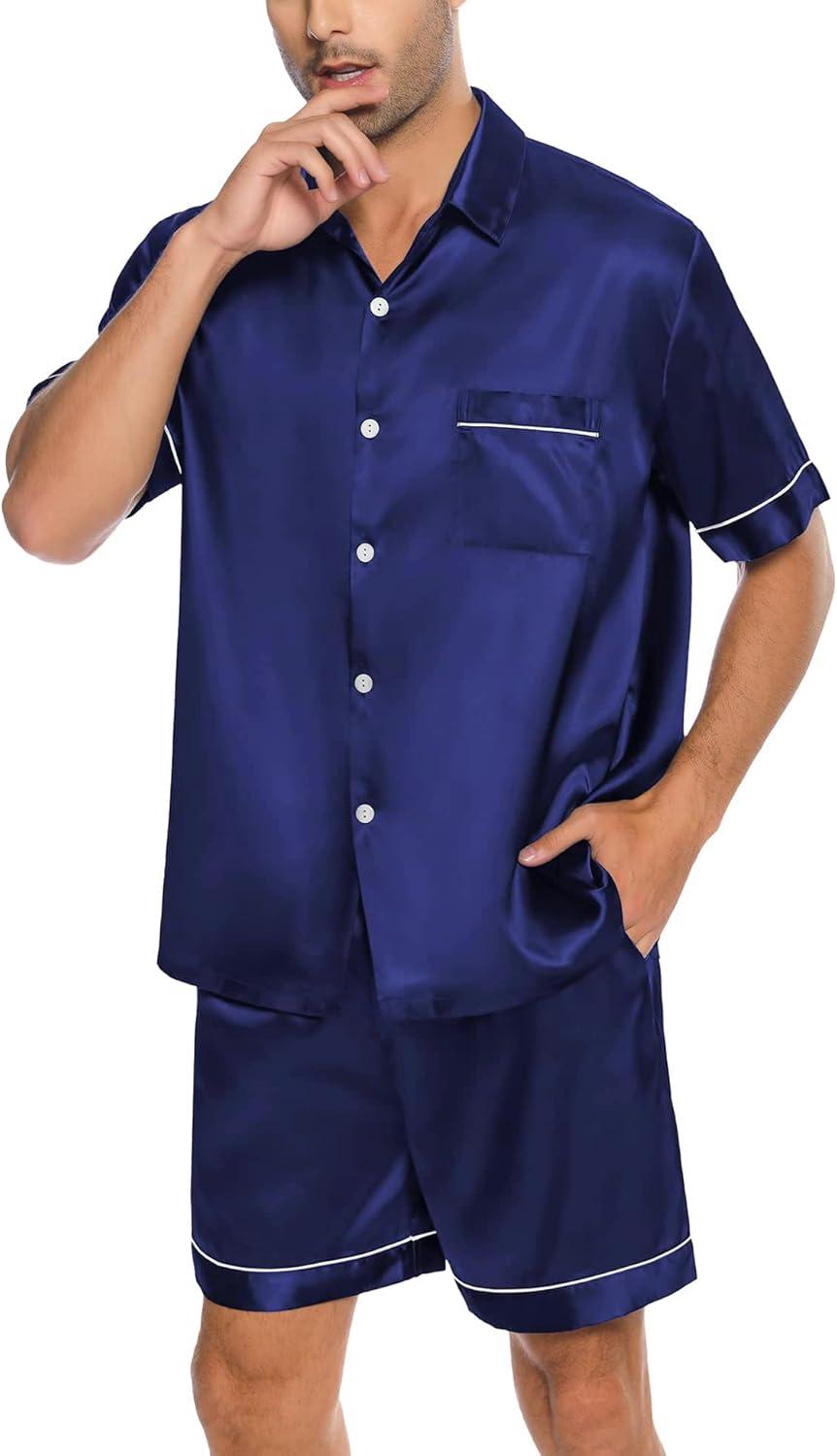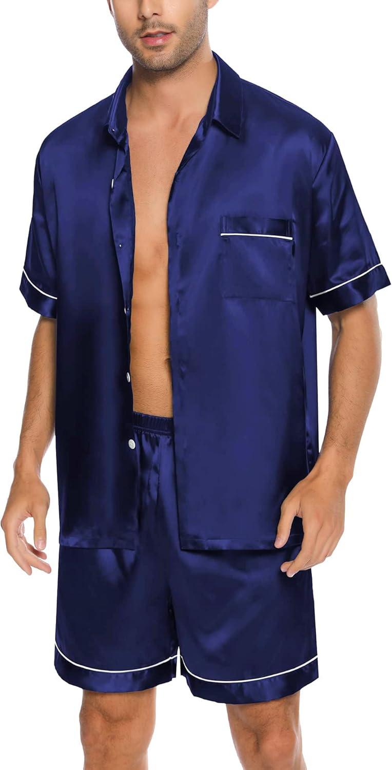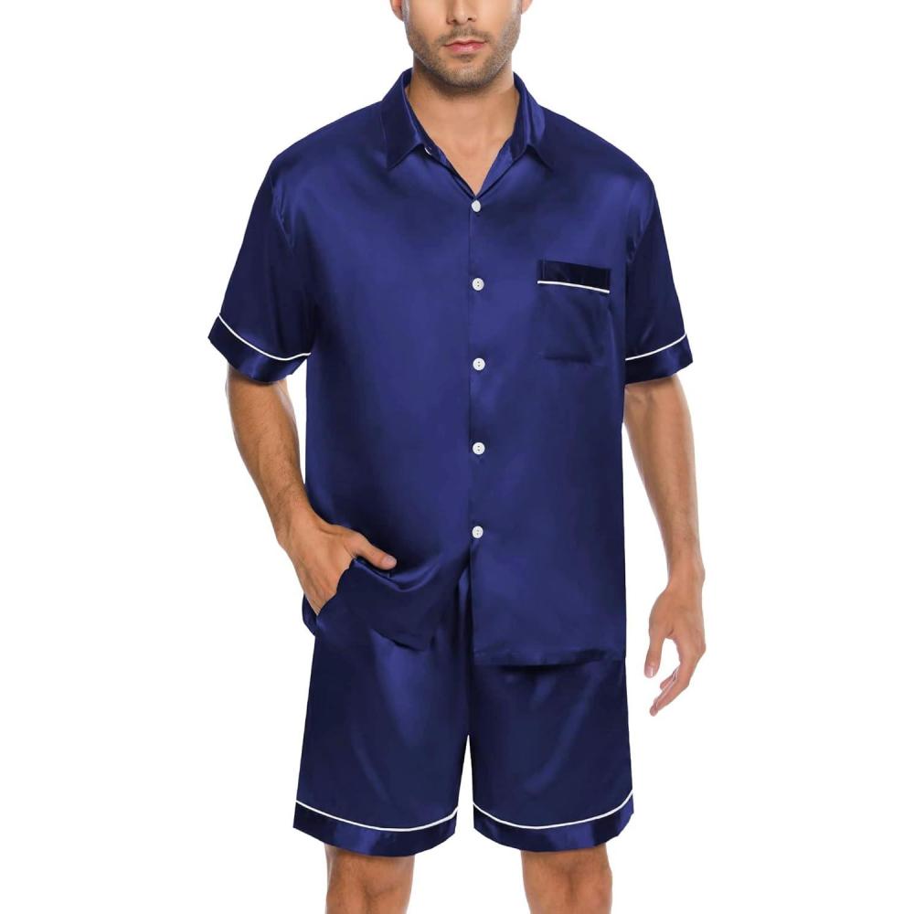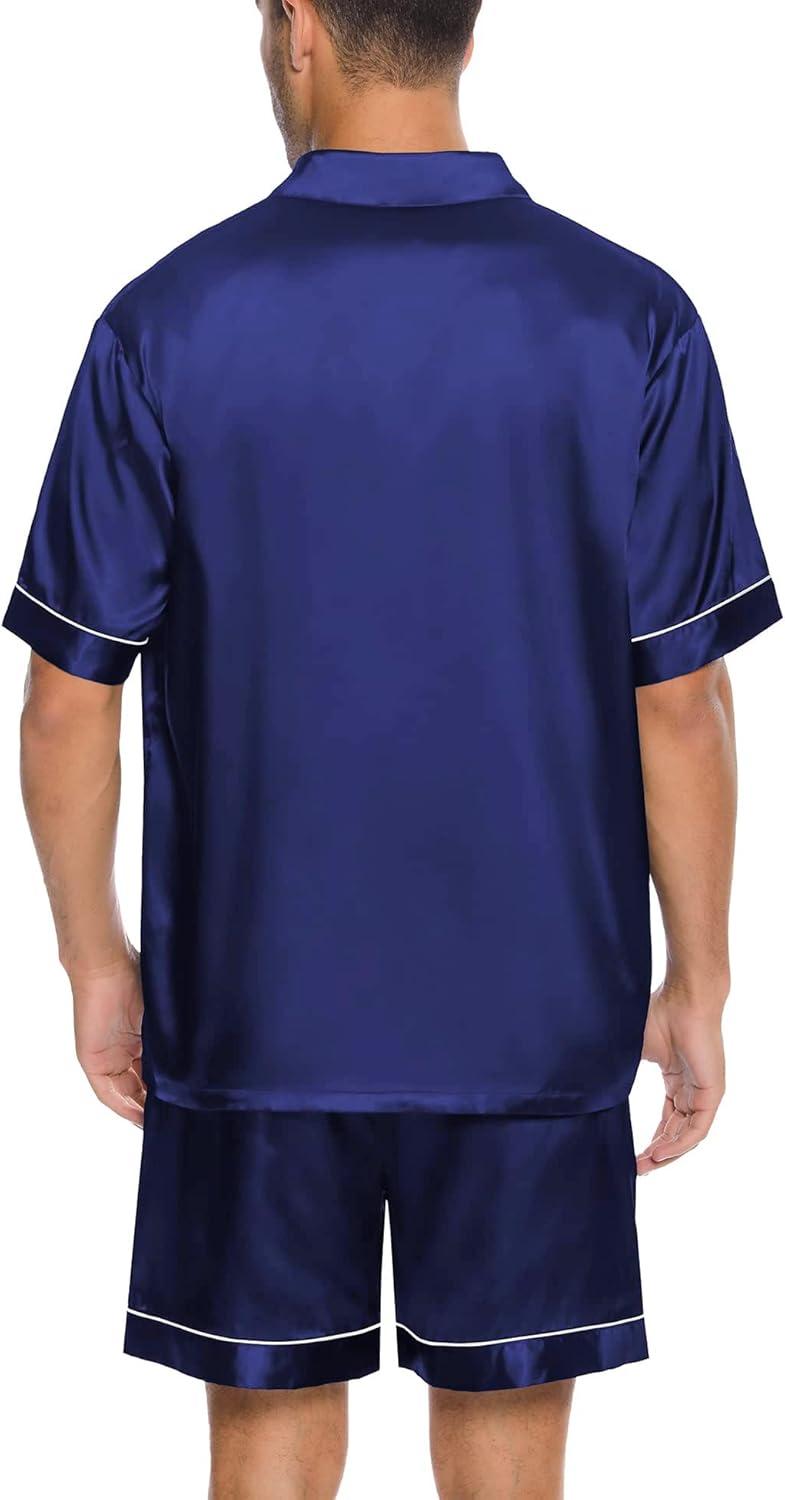 SWOMOG Men Silk Satin Pajamas Short Sleeve Pjs Set Button Down Sleepwear Soft Lounge Set Nightwear with Pockets(Navy Blue)