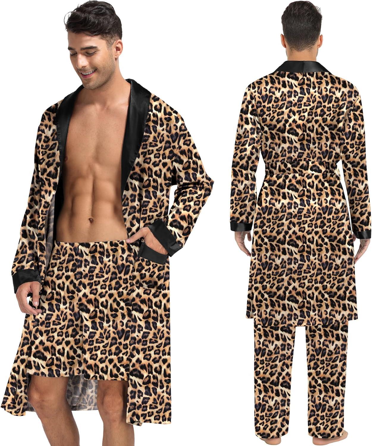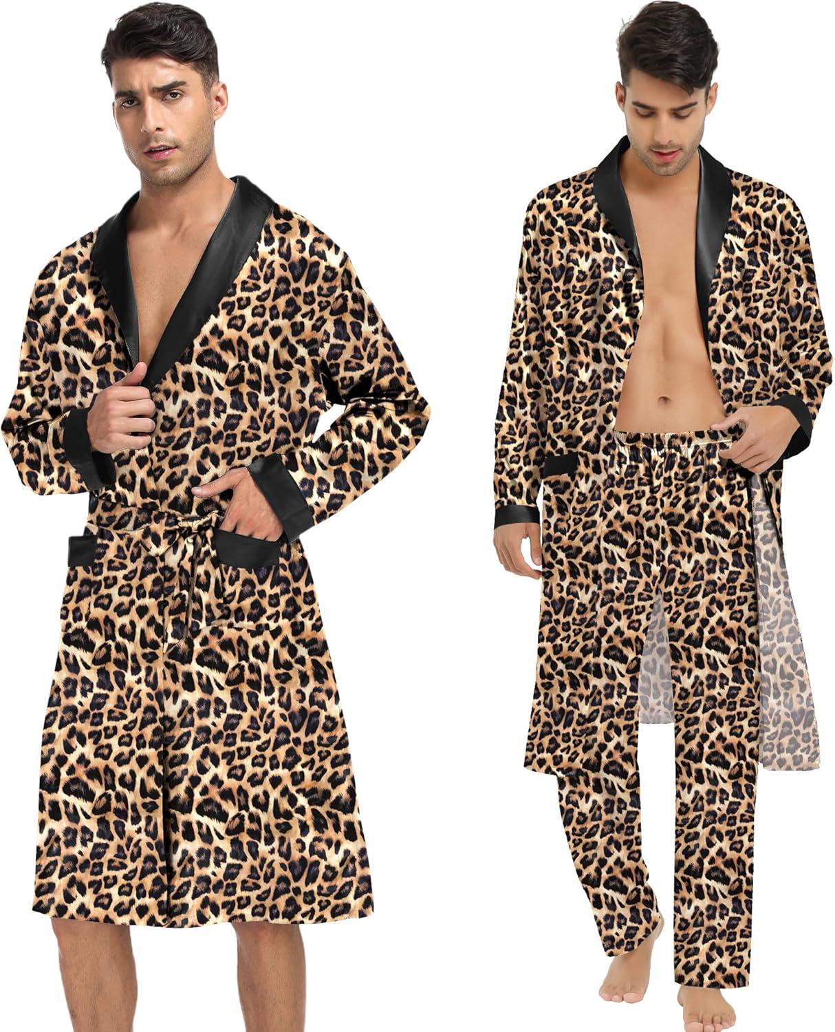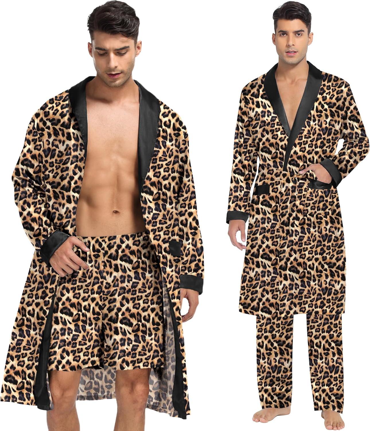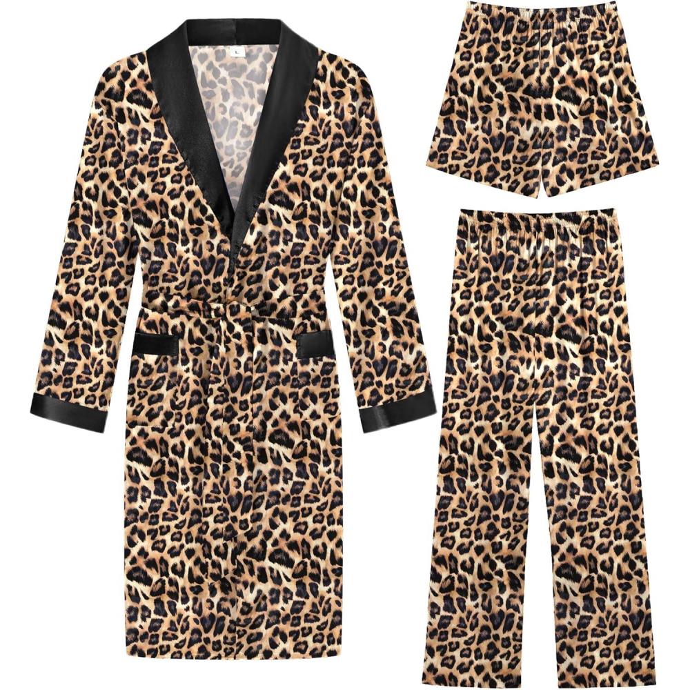 SWOMOG Men’s 3 Pcs Robe Silk Satin Kimono Bathrobe with Shorts&Pants Set Lightweight Soft Sleepwear(Leopard)