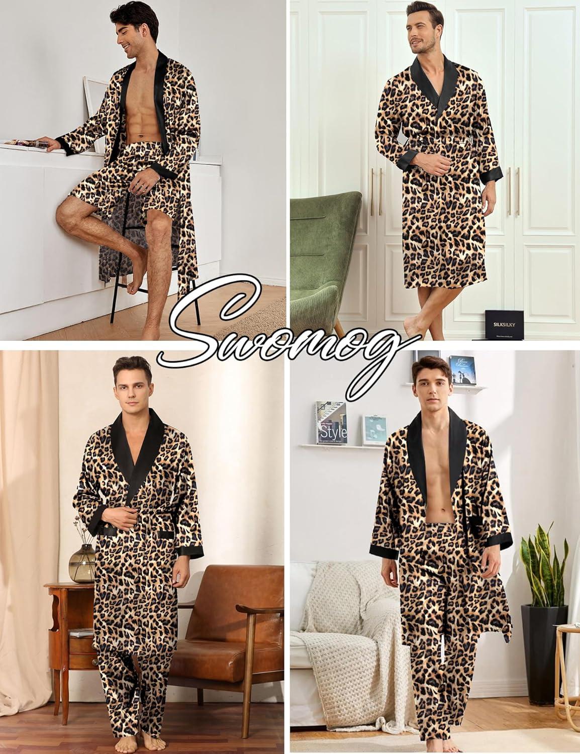 imageSWOMOG Mens 3 Pcs Robe Silk Satin Kimono Bathrobe with ShortsampampPants Set Lightweight Soft SleepwearLeopard