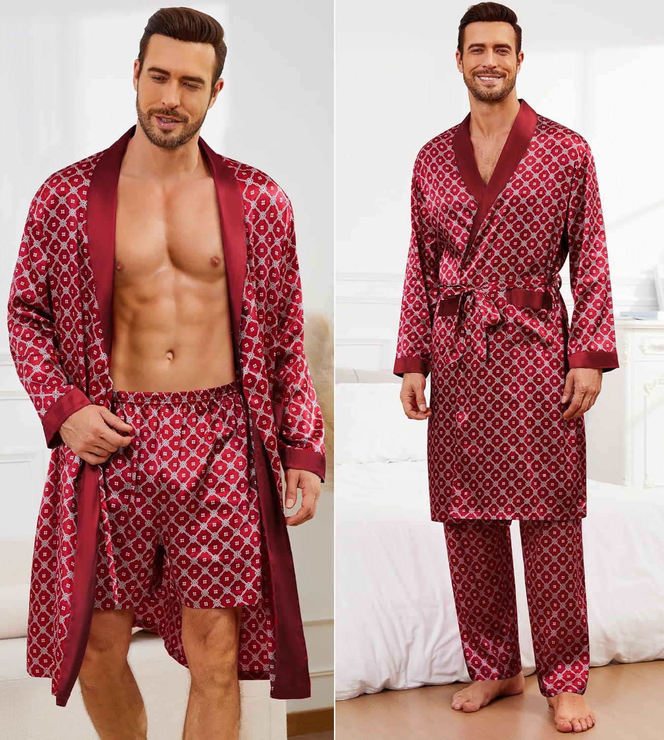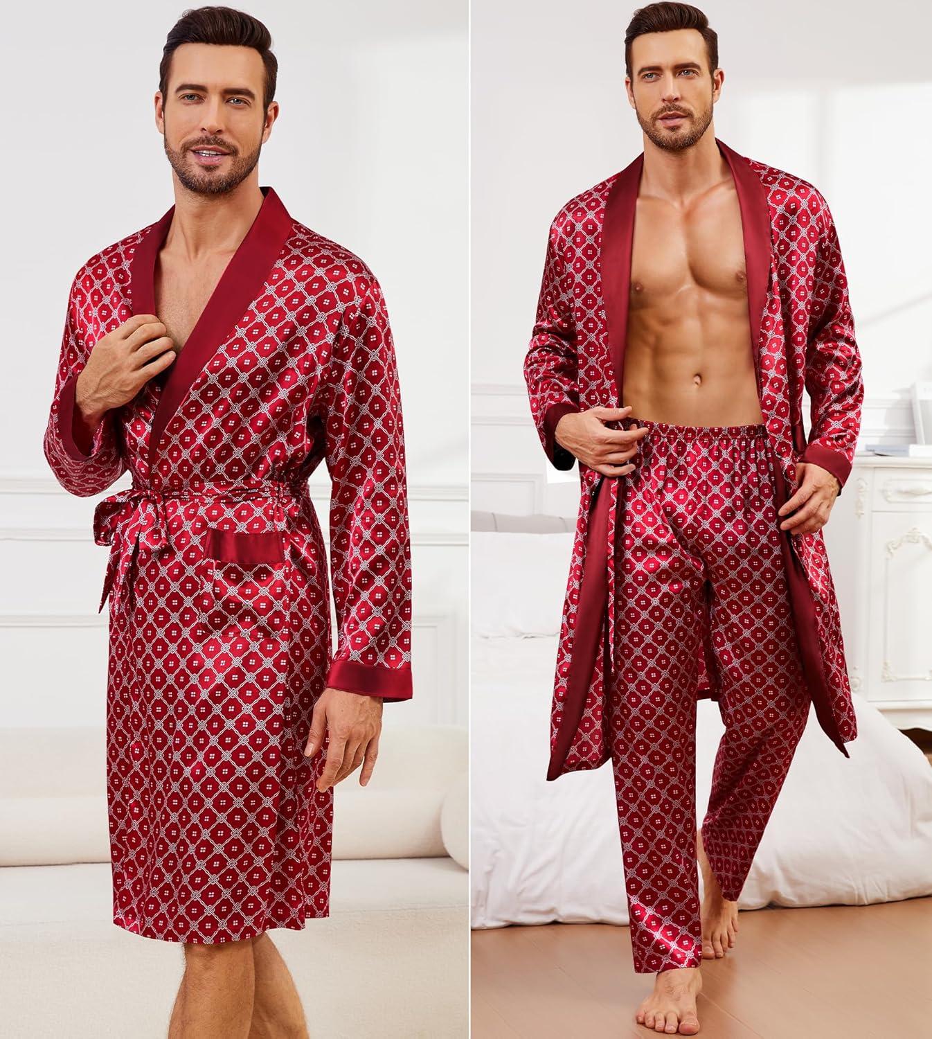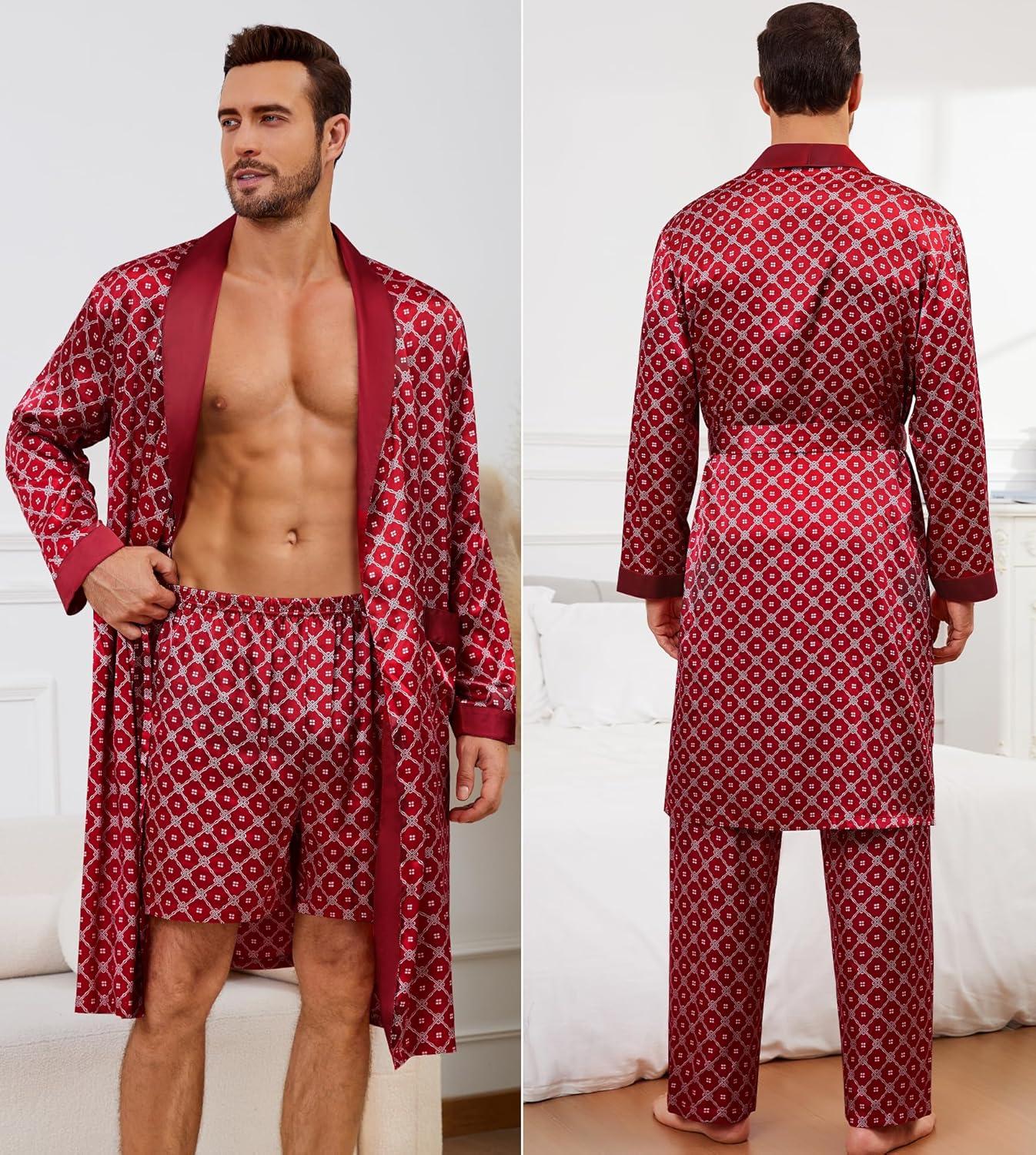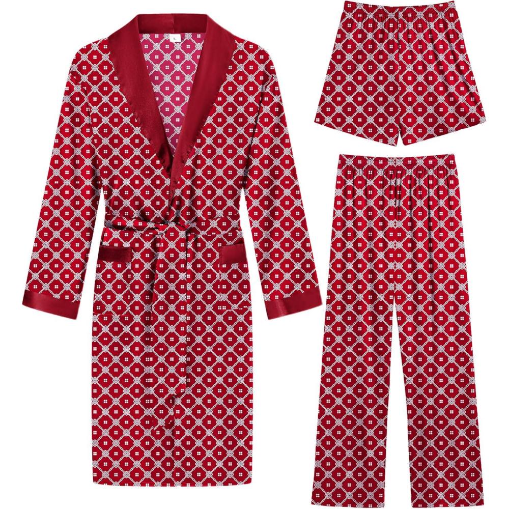 SWOMOG Men’s 3 Pcs Robe Silk Satin Kimono Bathrobe with Shorts&Pants Set Lightweight Soft Sleepwear(Red Floral)