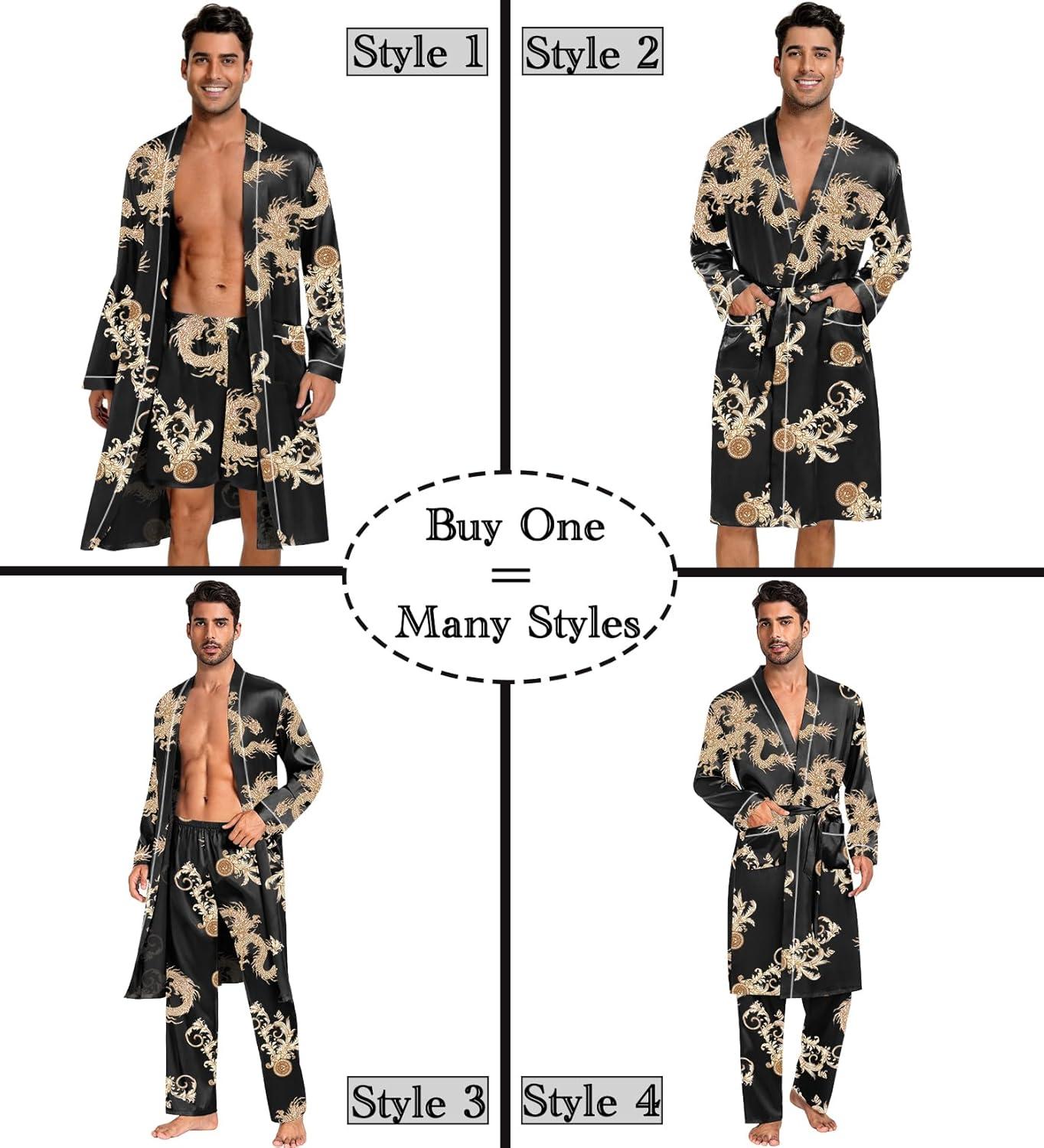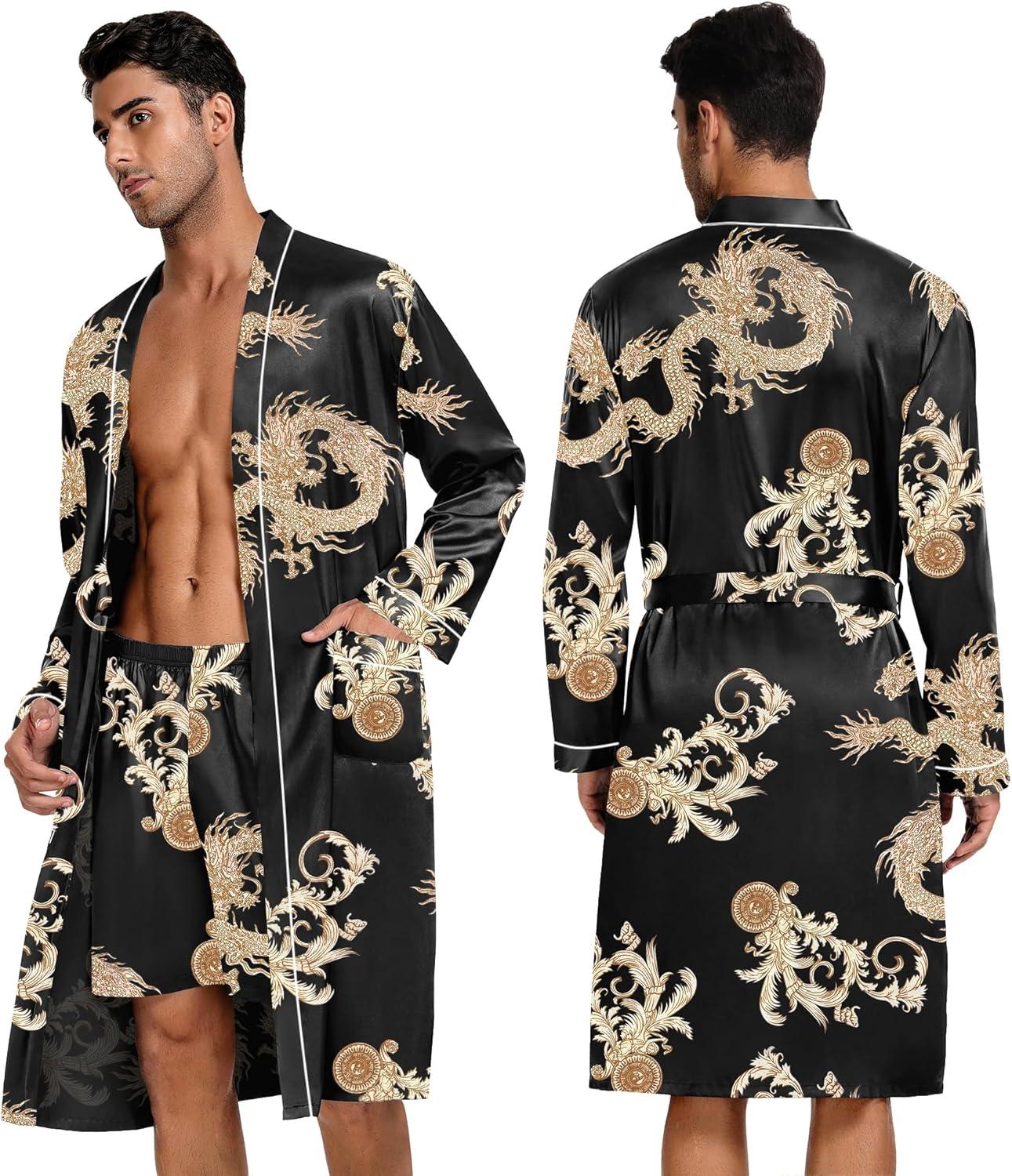 SWOMOG Mens 3 PCS Satin Robe with Pants & Shorts Set Kimono Bathrobe Long Sleeve Sleepwear Pjs Sets with Pockets(Black Dragon)