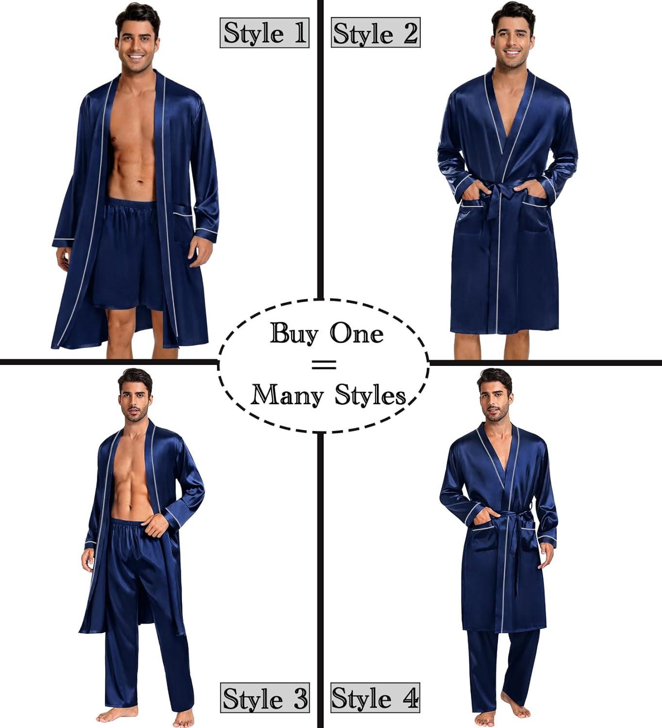 SWOMOG Mens 3 PCS Satin Robe with Pants & Shorts Set Kimono Bathrobe Long Sleeve Sleepwear Pjs Sets with Pockets(Deep Navy Blue)