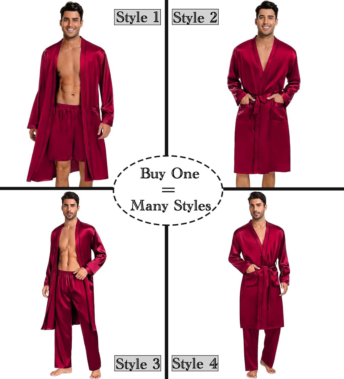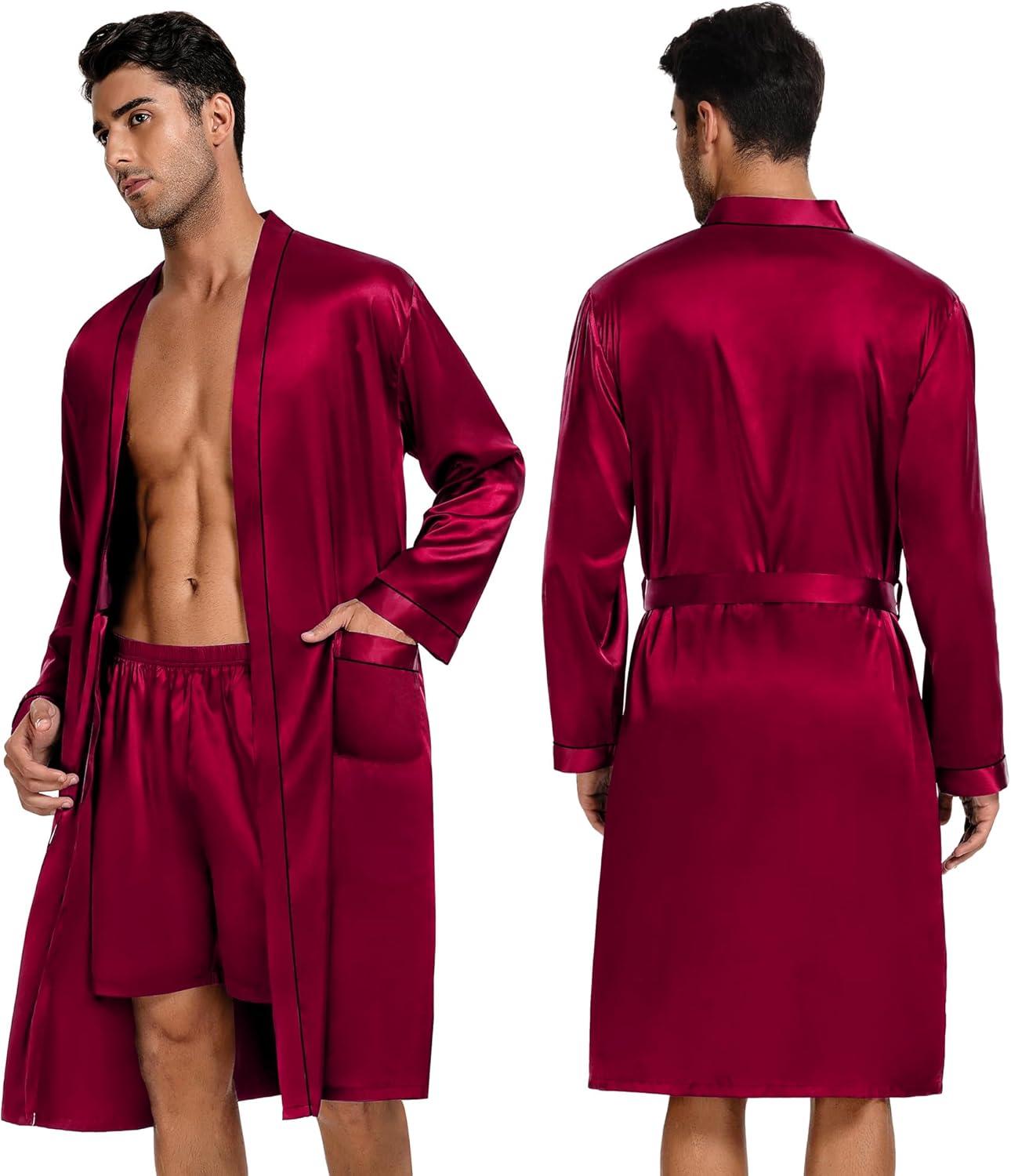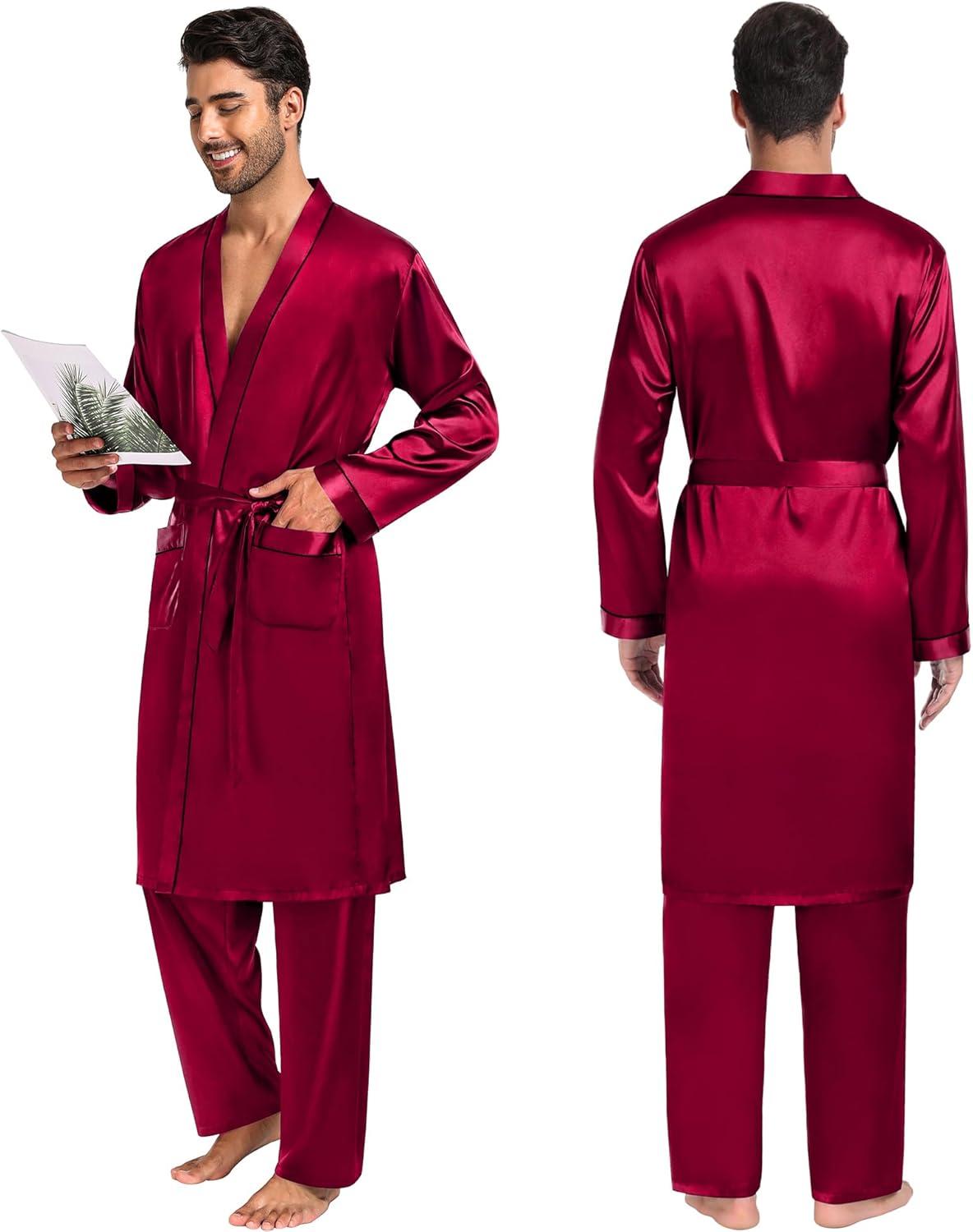 SWOMOG Mens 3 PCS Satin Robe with Pants & Shorts Set Kimono Bathrobe Long Sleeve Sleepwear Pjs Sets with Pockets(Deep Wine Red)