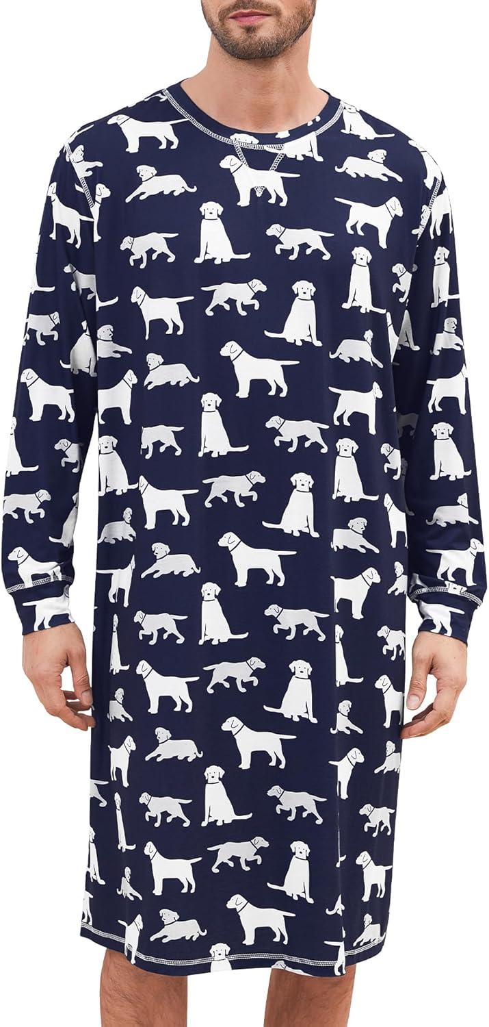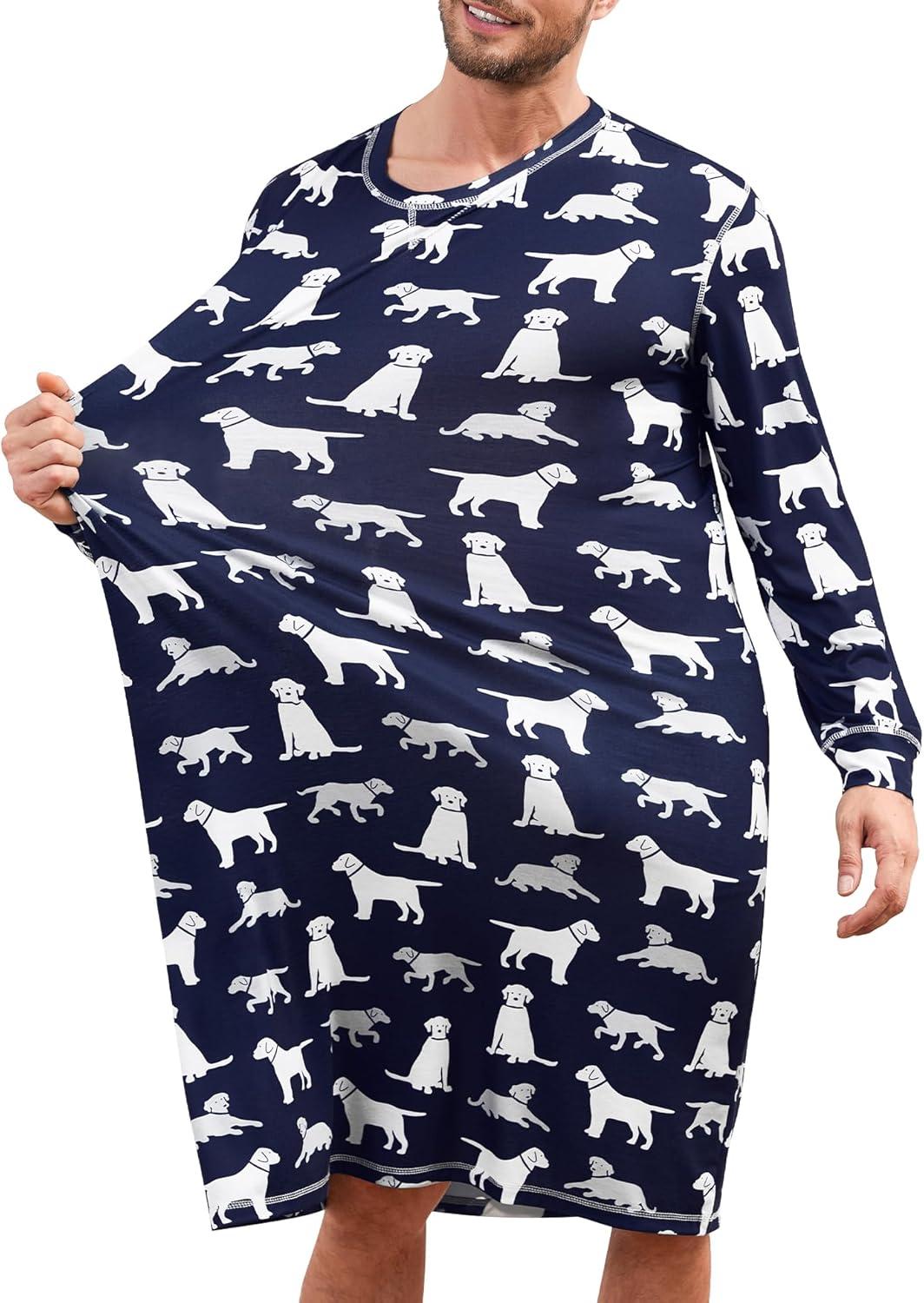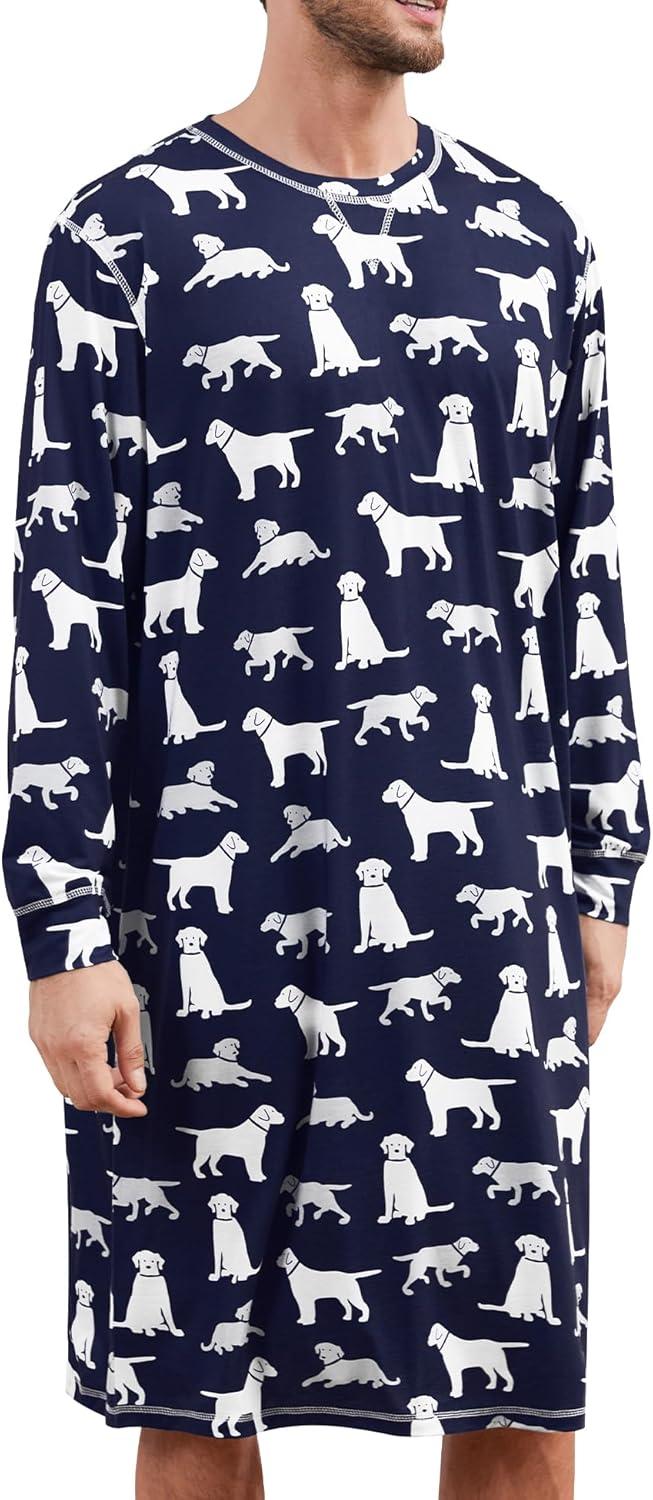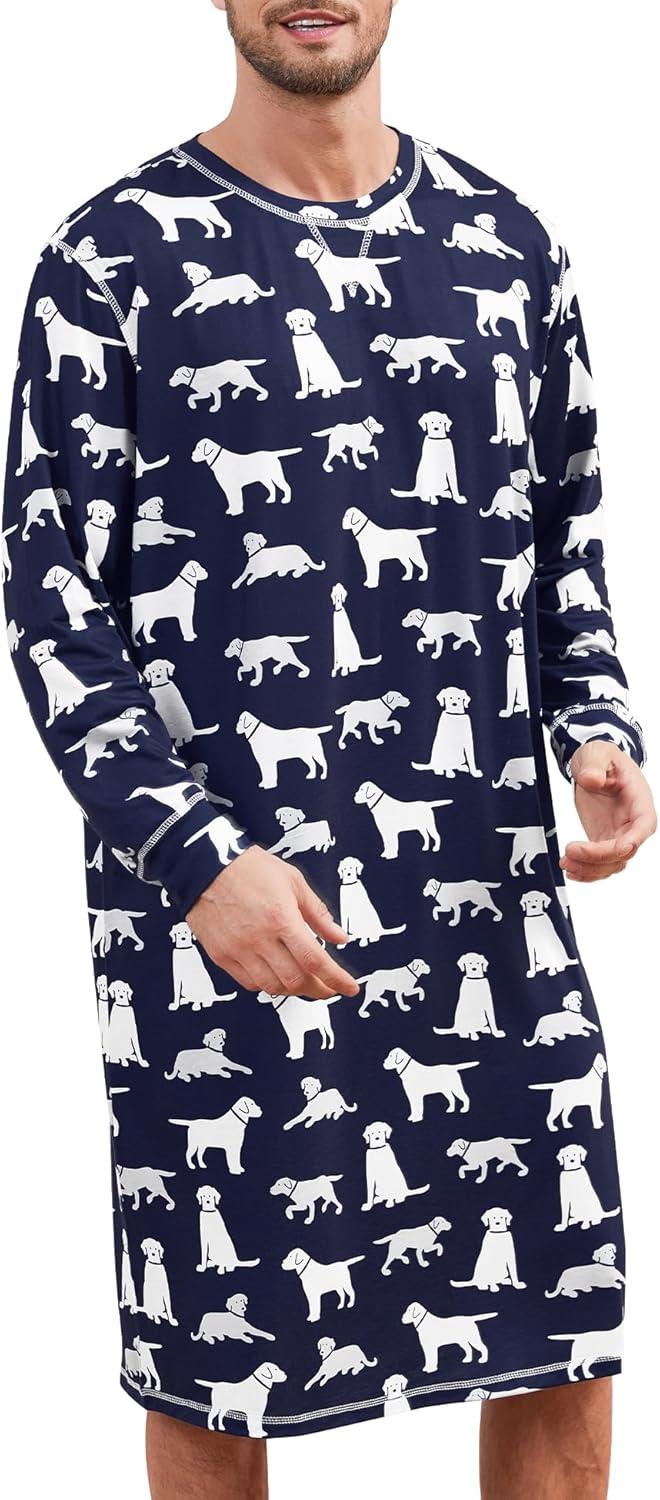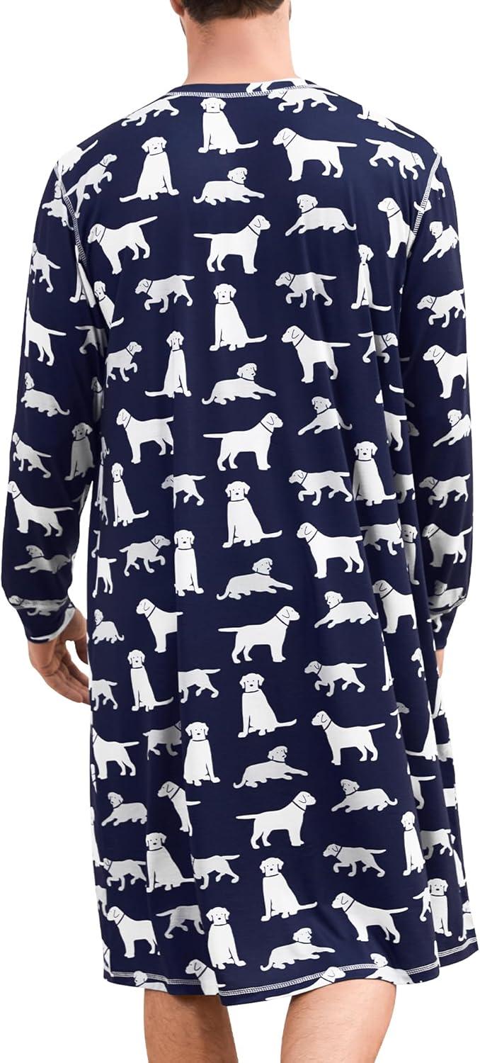 SWOMOG Mens Nightgown Long Sleeve Lounge, Sleep Henley Shirt Pajama Big & Tall Nightshirt Comfy Nightwear S-XXL(Navy Blue Dogs)
