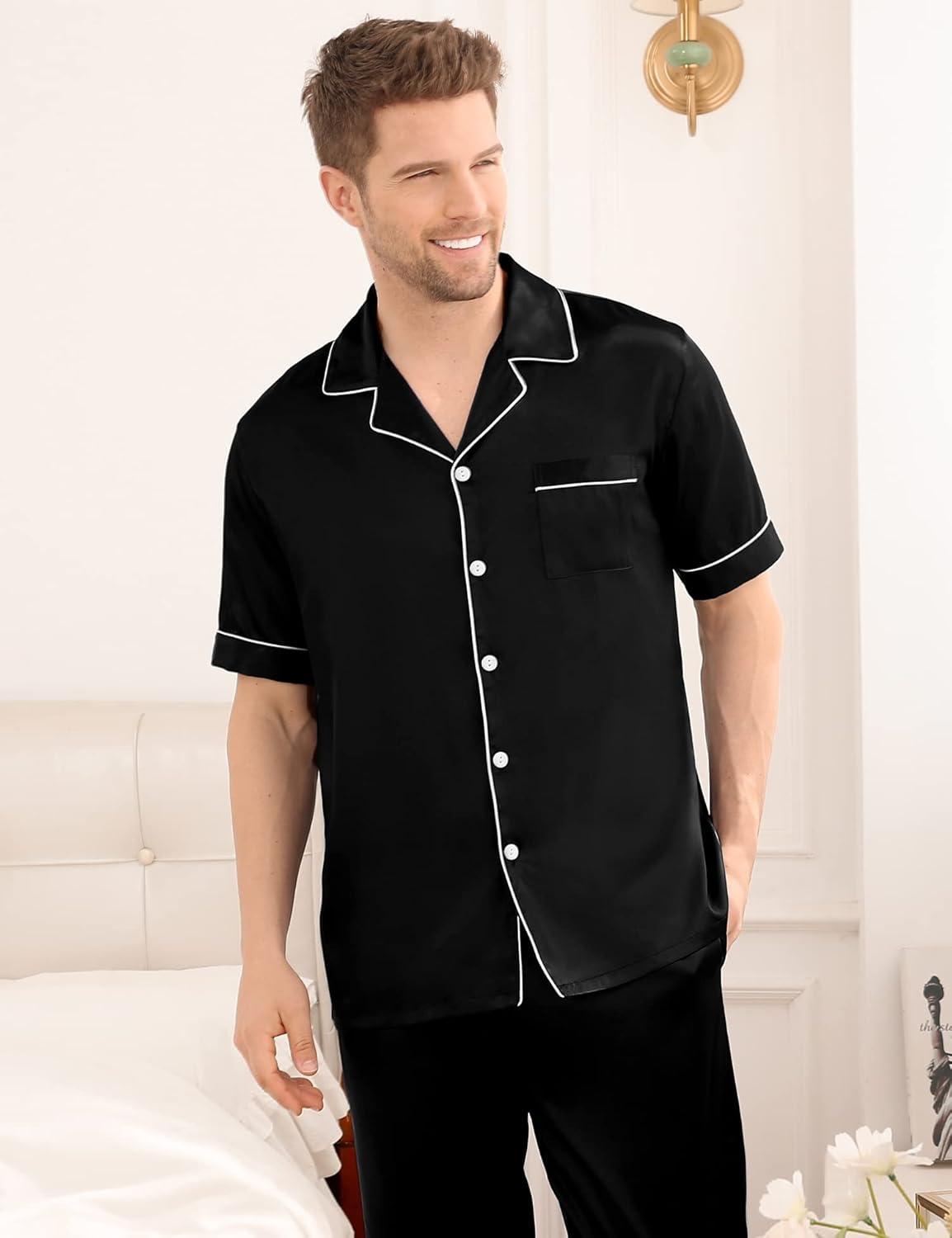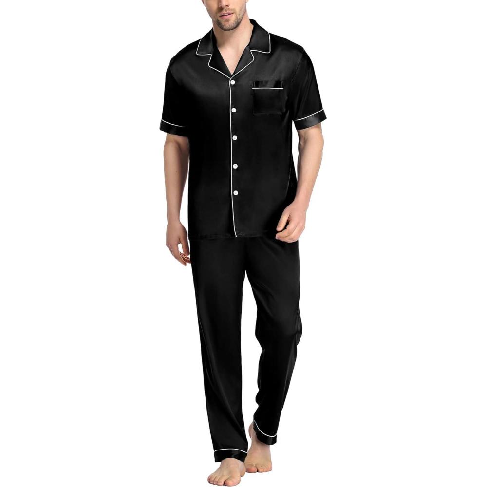 SWOMOG Mens Satin Pajama Set Short Sleeve Classic Sleepwear Button Down Silky Loungewear with Long Pants(Black)