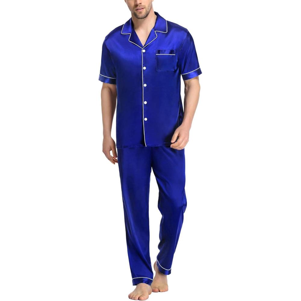 SWOMOG Mens Satin Pajama Set Short Sleeve Classic Sleepwear Button Down Silky Loungewear with Long Pants(Blue)