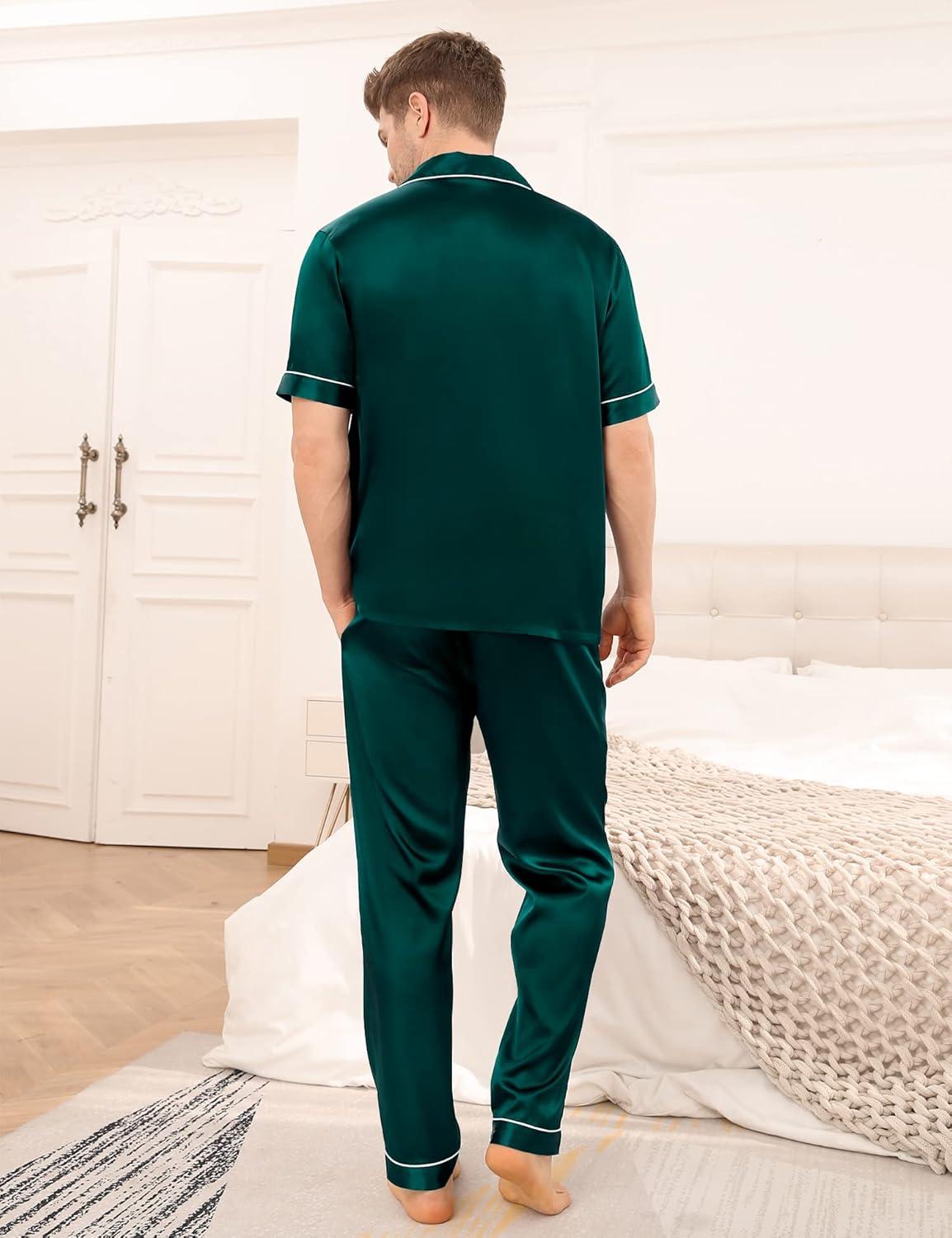 SWOMOG Mens Satin Pajama Set Short Sleeve Classic Sleepwear Button Down Silky Loungewear with Long Pants(Deep Green)