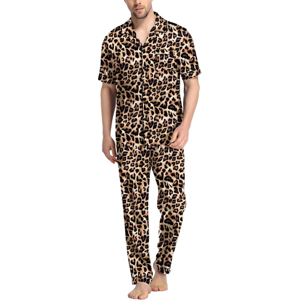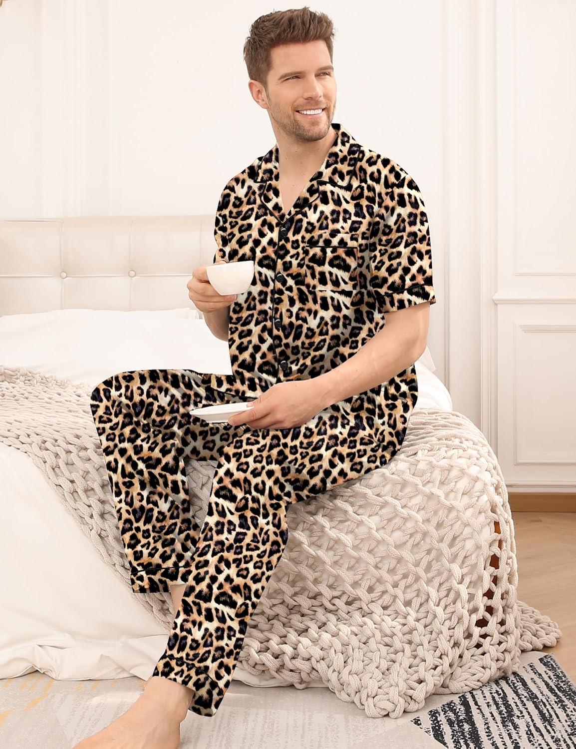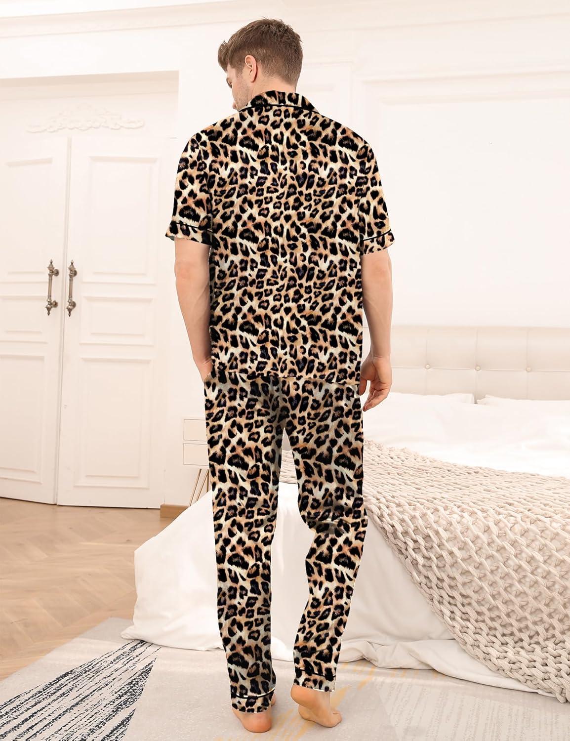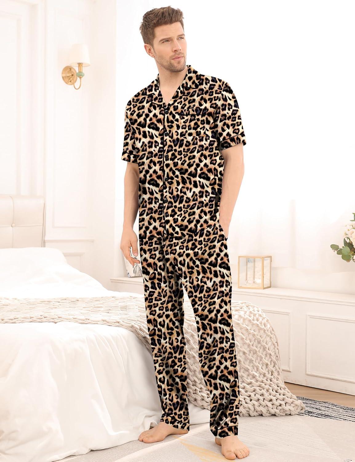 SWOMOG Mens Satin Pajama Set Short Sleeve Classic Sleepwear Button Down Silky Loungewear with Long Pants(Leopard Print)