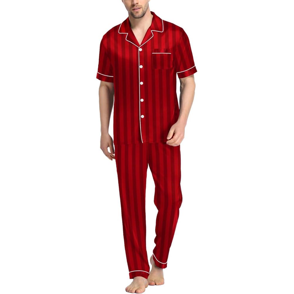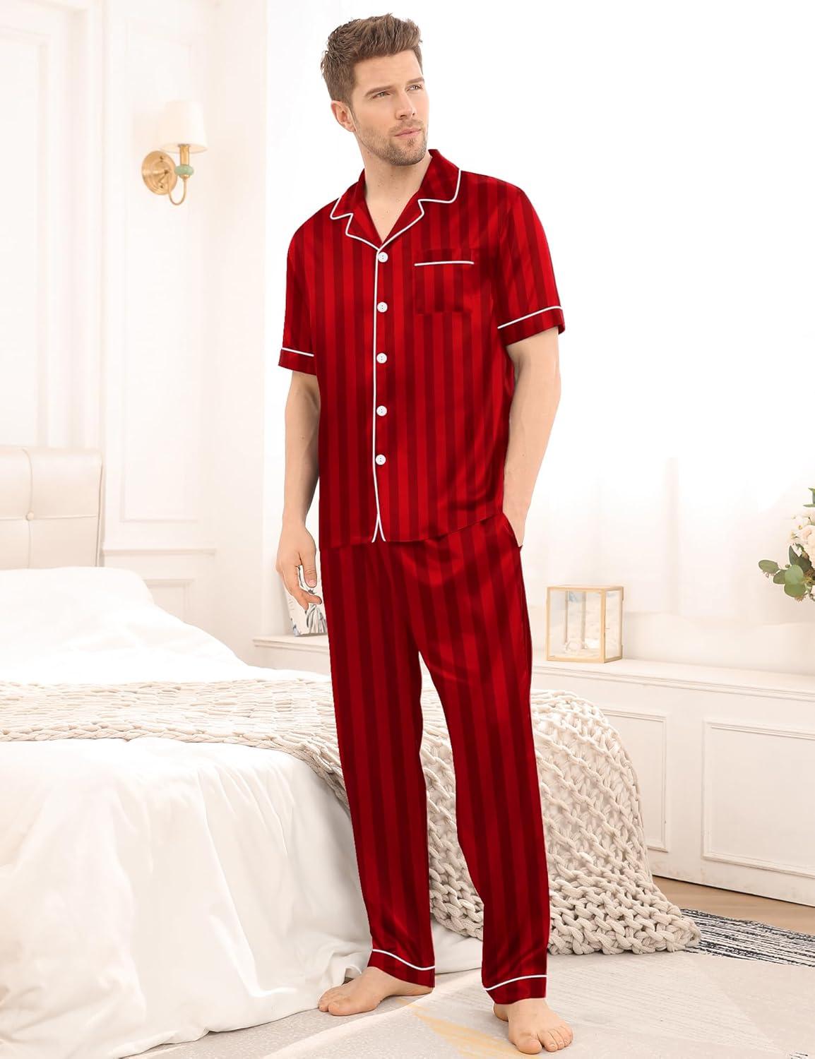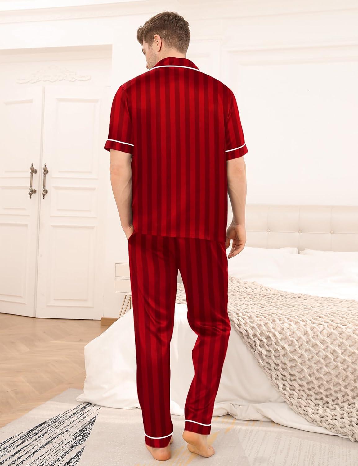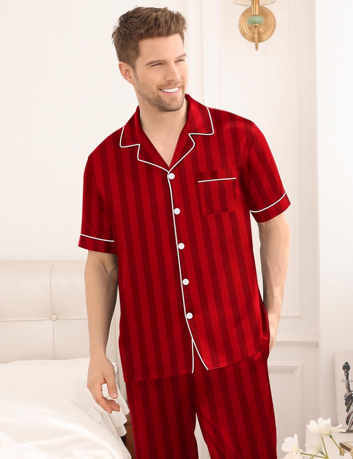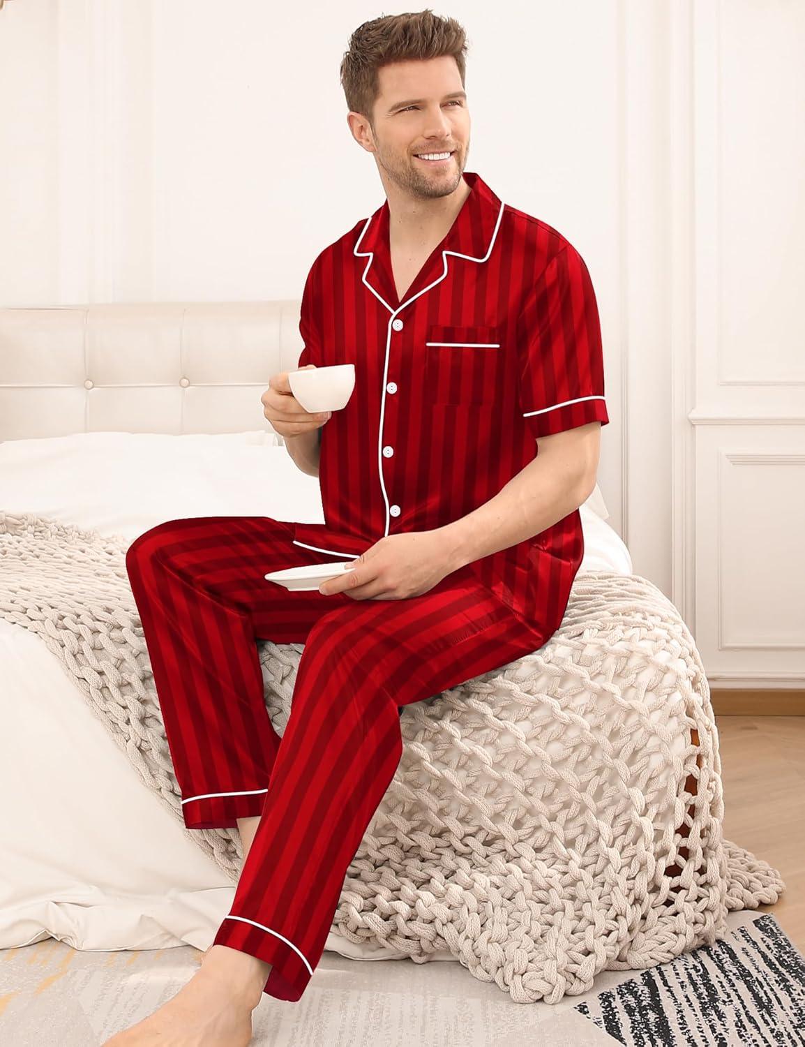 SWOMOG Mens Satin Pajama Set Short Sleeve Classic Sleepwear Button Down Silky Loungewear with Long Pants(Red Stripes)