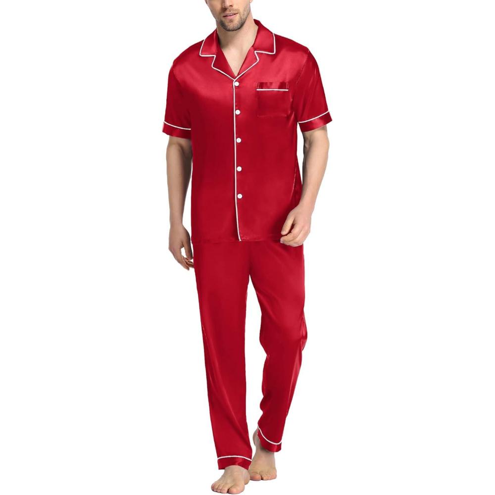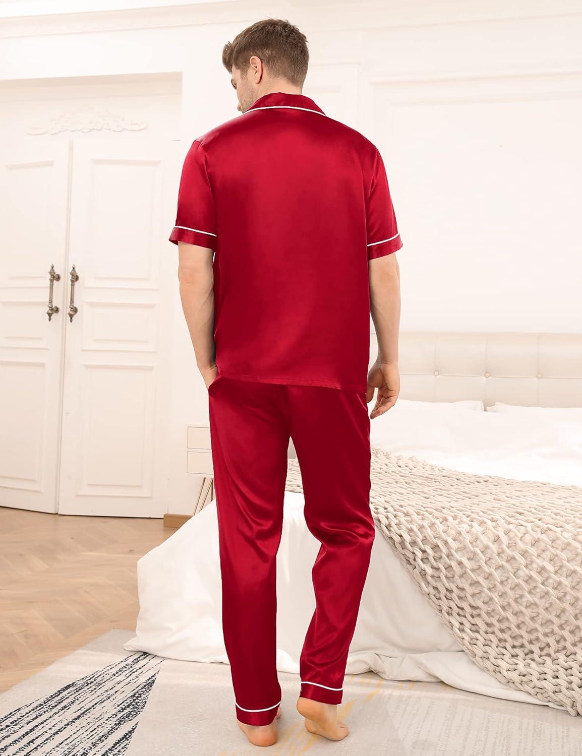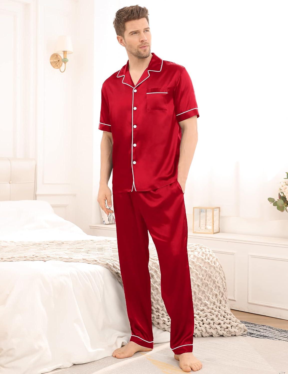 SWOMOG Mens Satin Pajama Set Short Sleeve Classic Sleepwear Button Down Silky Loungewear with Long Pants(Red)