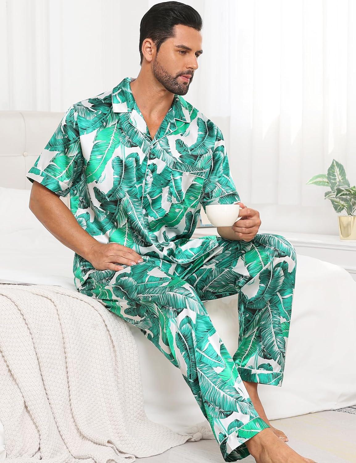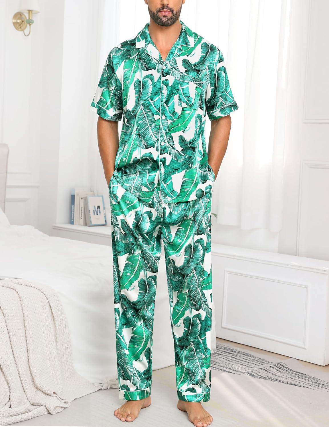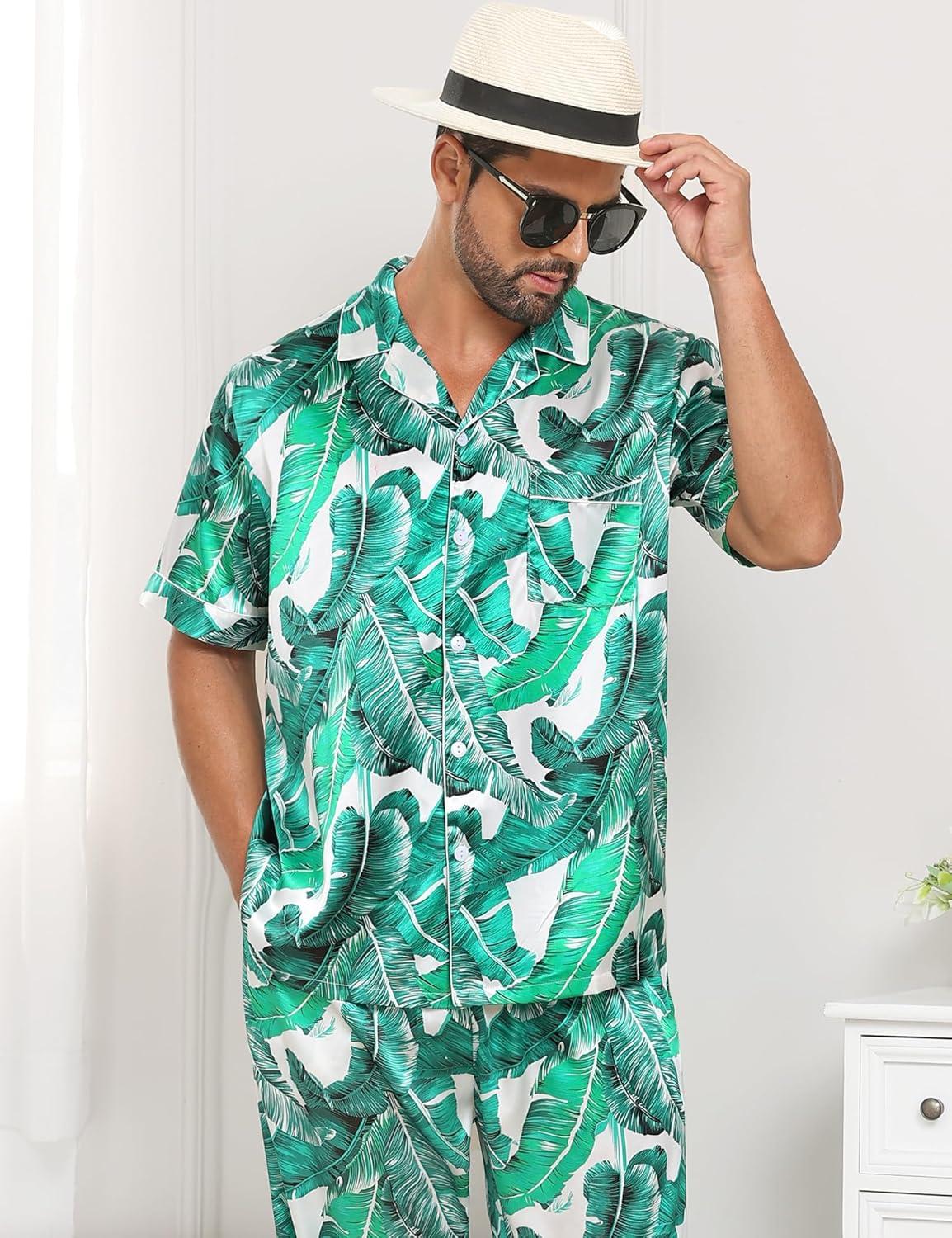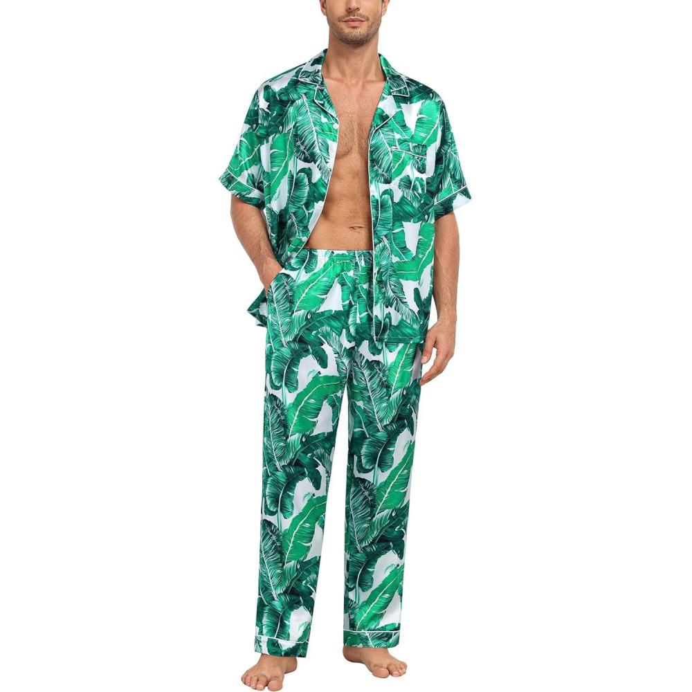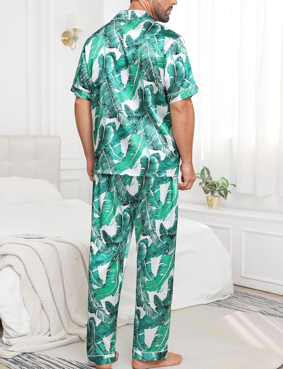 SWOMOG Mens Satin Pajama Set Short Sleeve Classic Sleepwear Button Down Silky Loungewear with Long Pants(White Leaves)