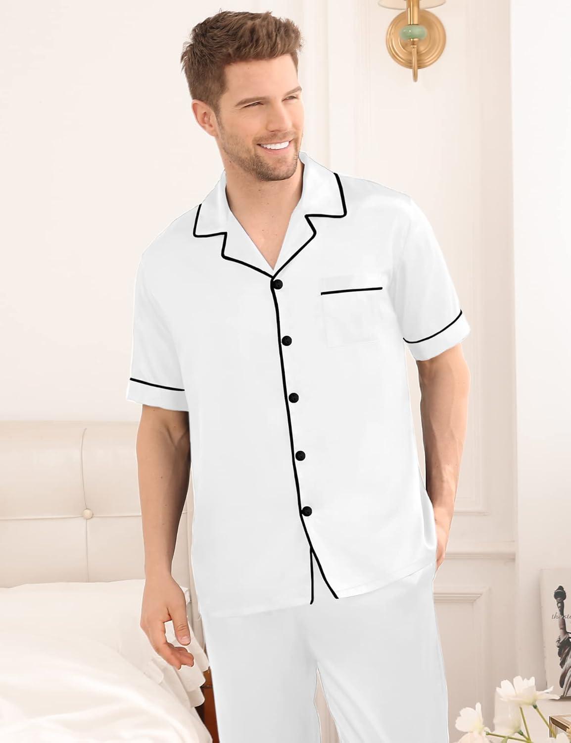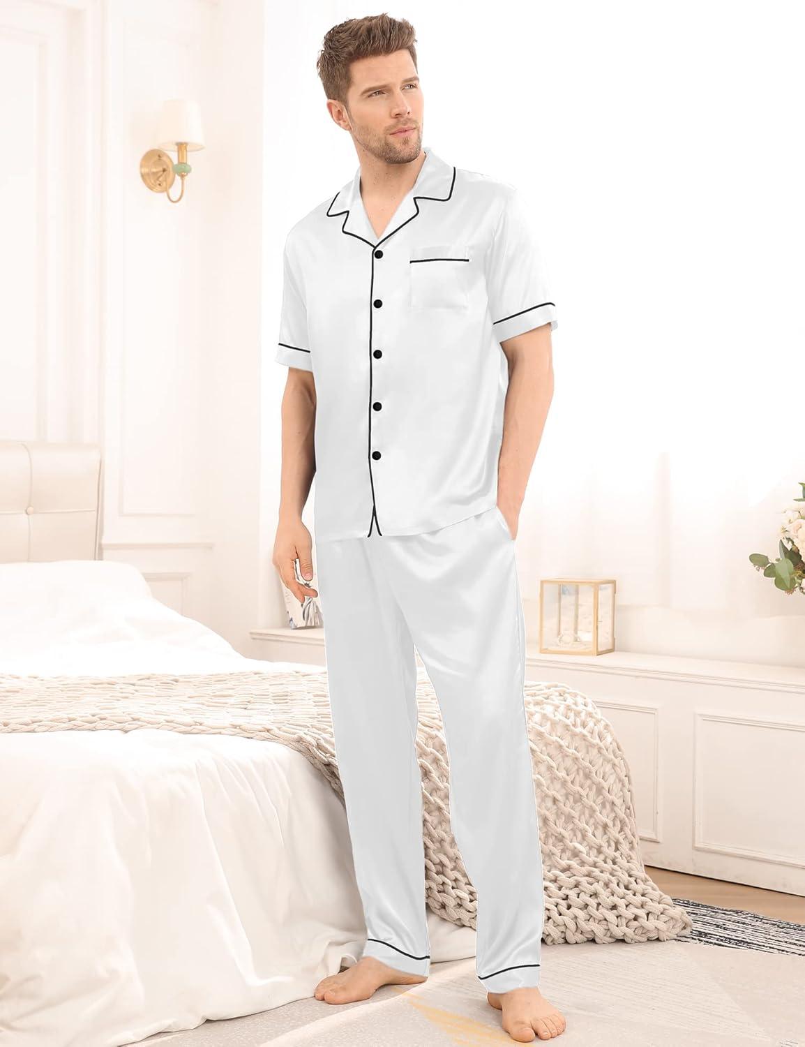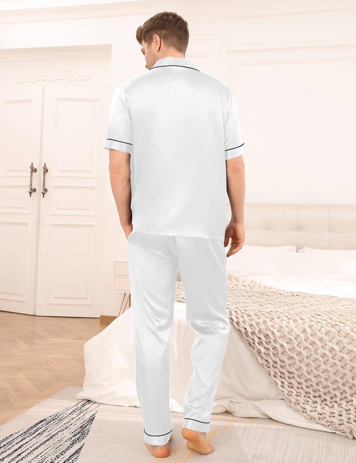 SWOMOG Mens Satin Pajama Set Short Sleeve Classic Sleepwear Button Down Silky Loungewear with Long Pants(White)