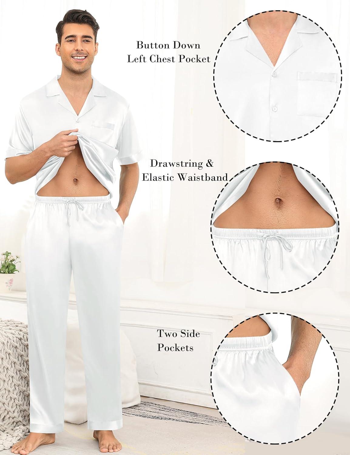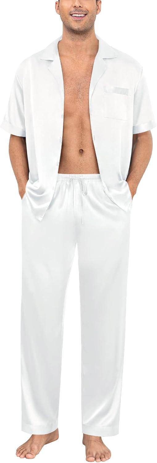 SWOMOG Mens Satin Pajama Set Short Sleeve Classic Sleepwear Button Down Silky Loungewear with Long Pants(Z - Solid White - With Drawstrings)