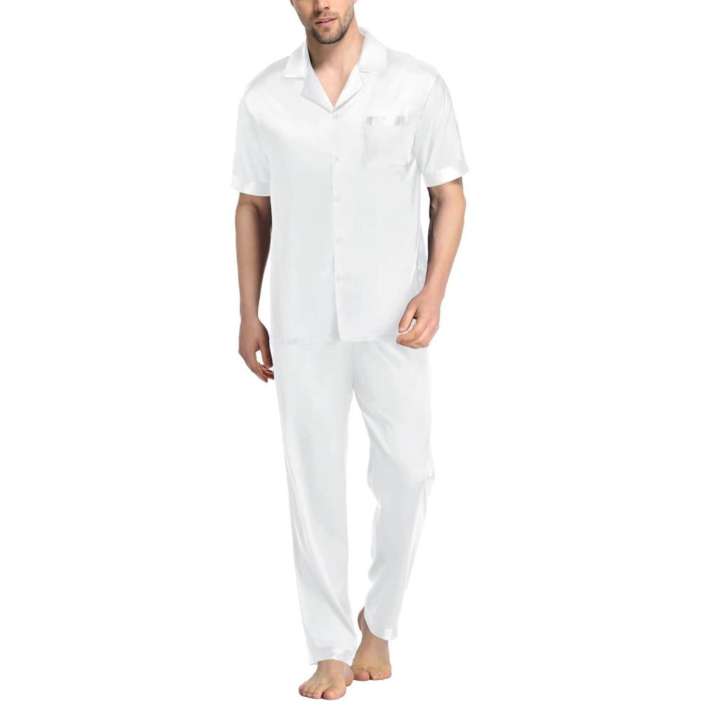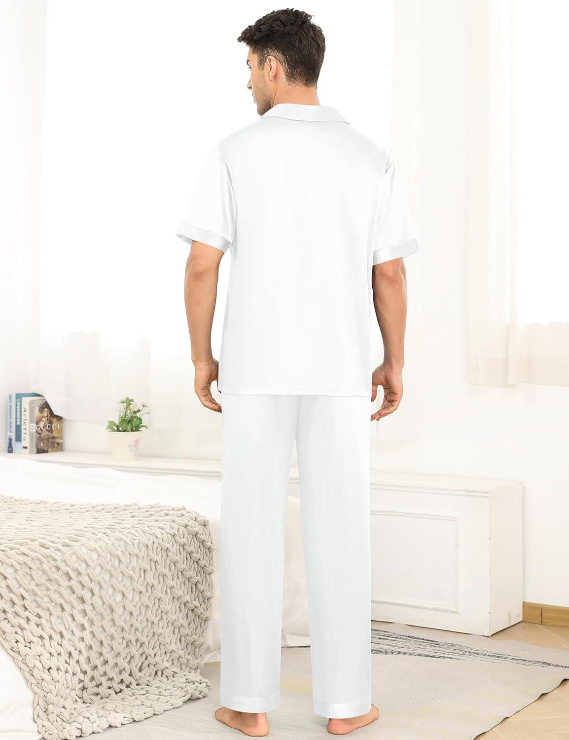 SWOMOG Mens Satin Pajama Set Short Sleeve Classic Sleepwear Button Down Silky Loungewear with Long Pants(Z – Solid White – With Drawstrings)