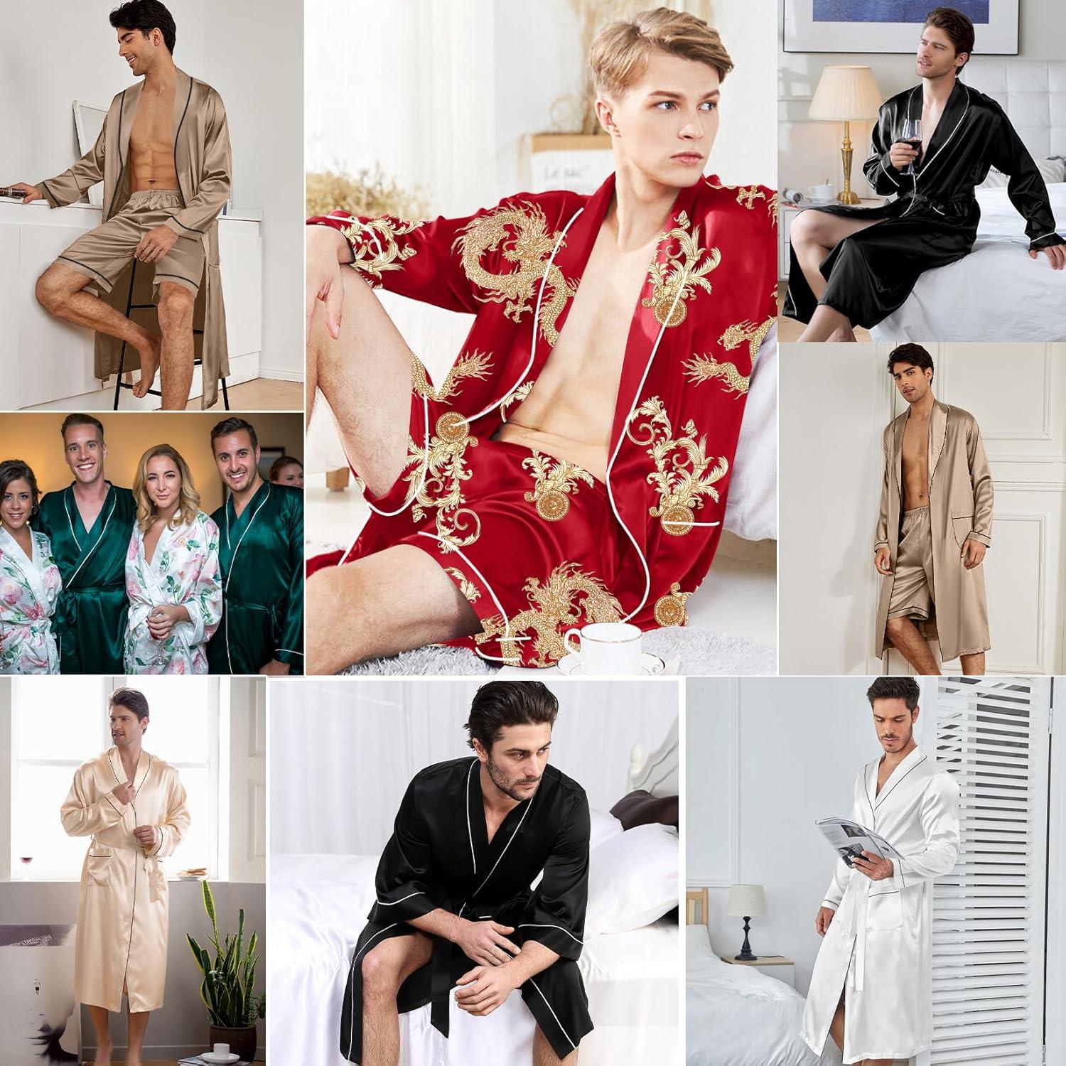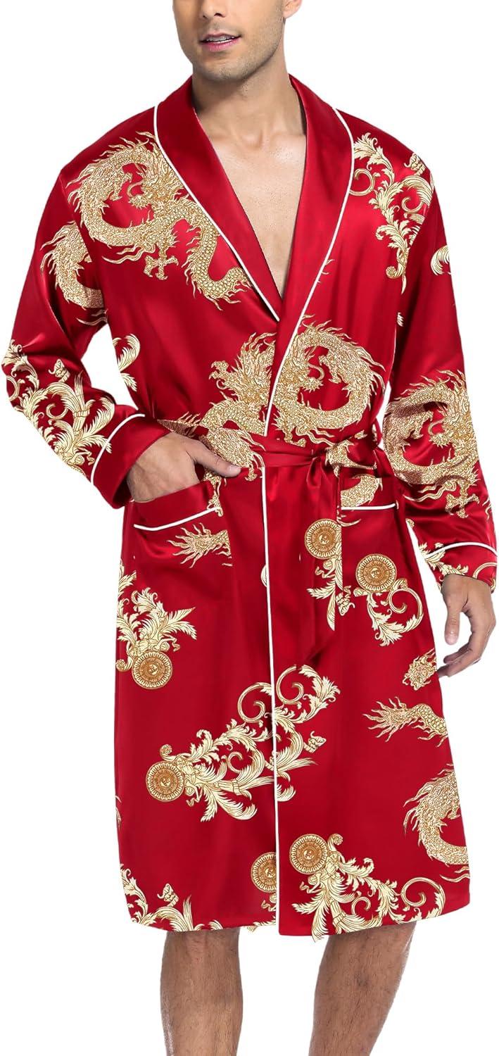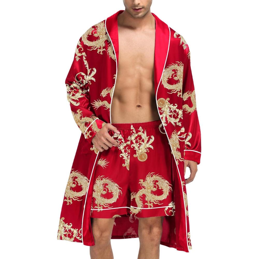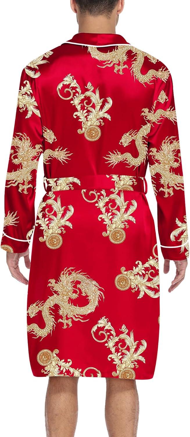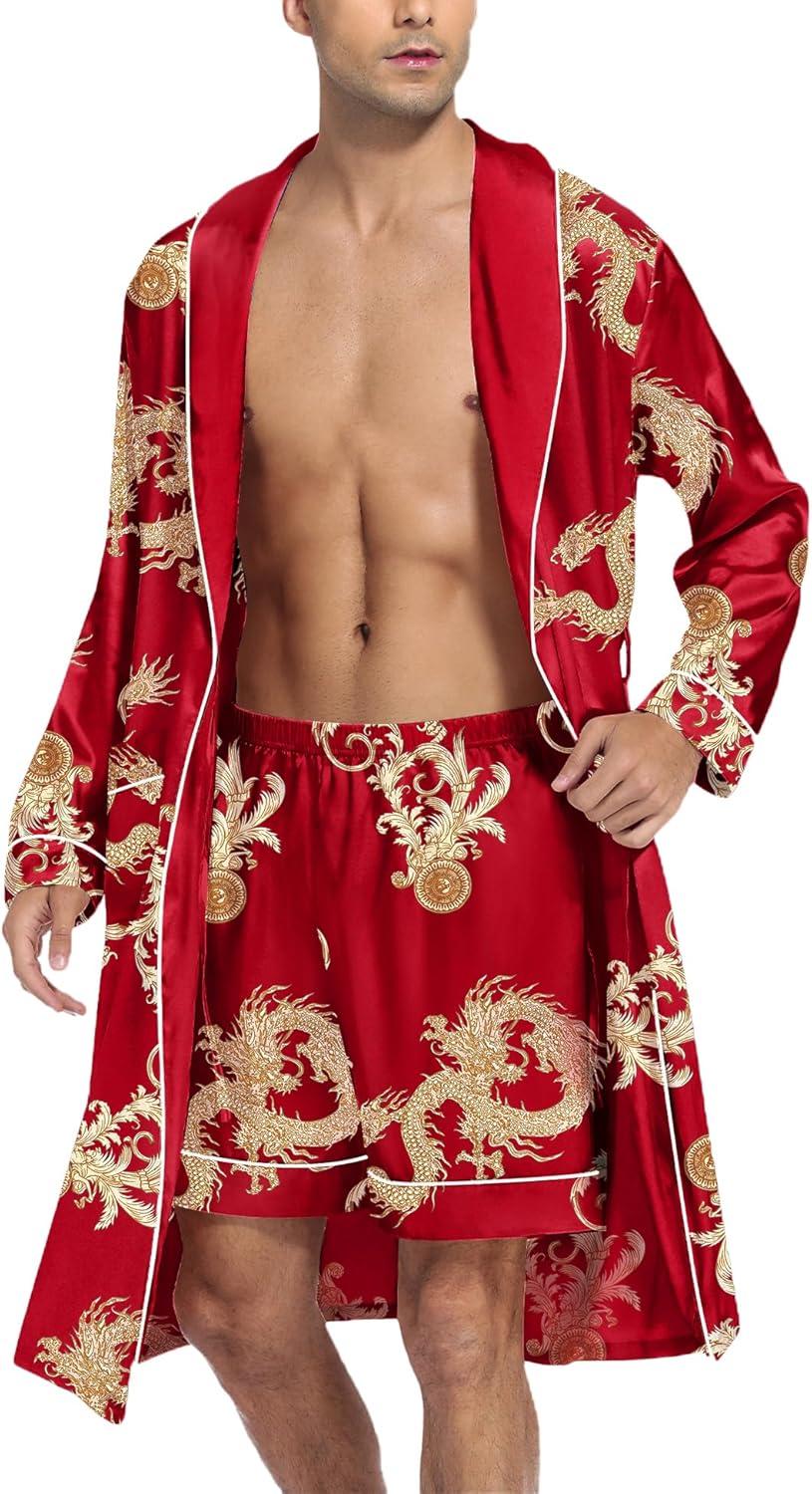 SWOMOG Men’s Satin Robe Silky Kimono Bathrobe with Shorts Set Lightweight Soft Loungewear Nightwear(Red Dragon)