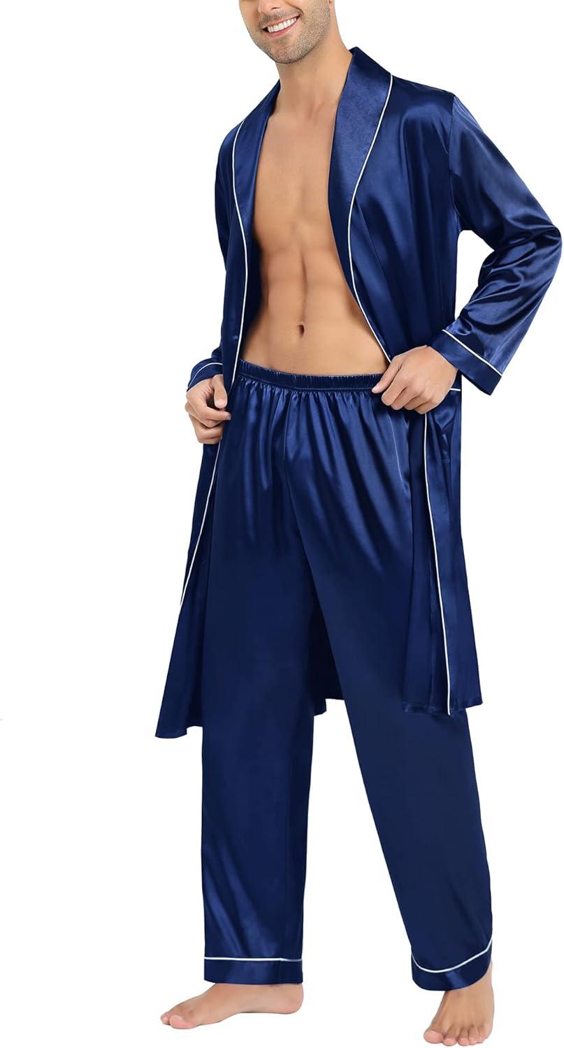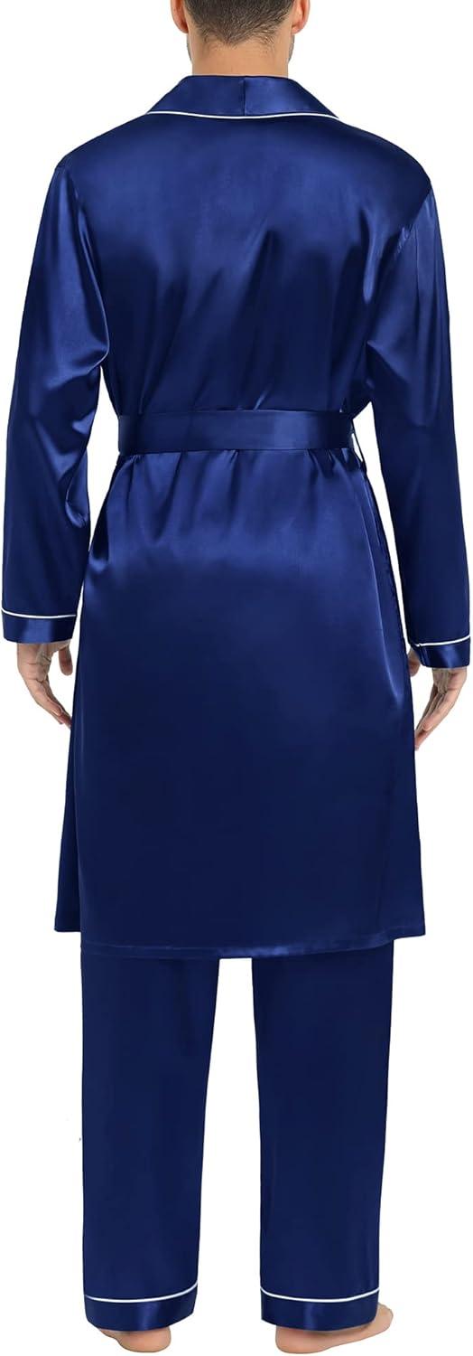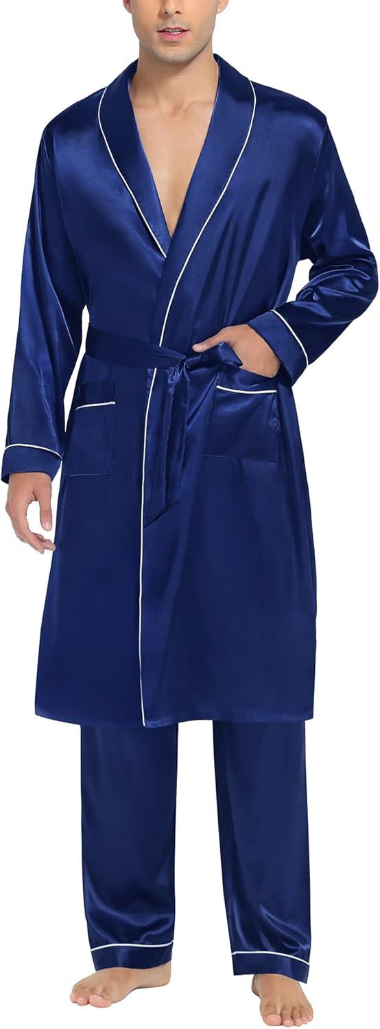 SWOMOG Men’s Satin Robe Silky Kimono Bathrobe with Shorts Set Lightweight Soft Loungewear Nightwear(Z-long Sleeve-blue)