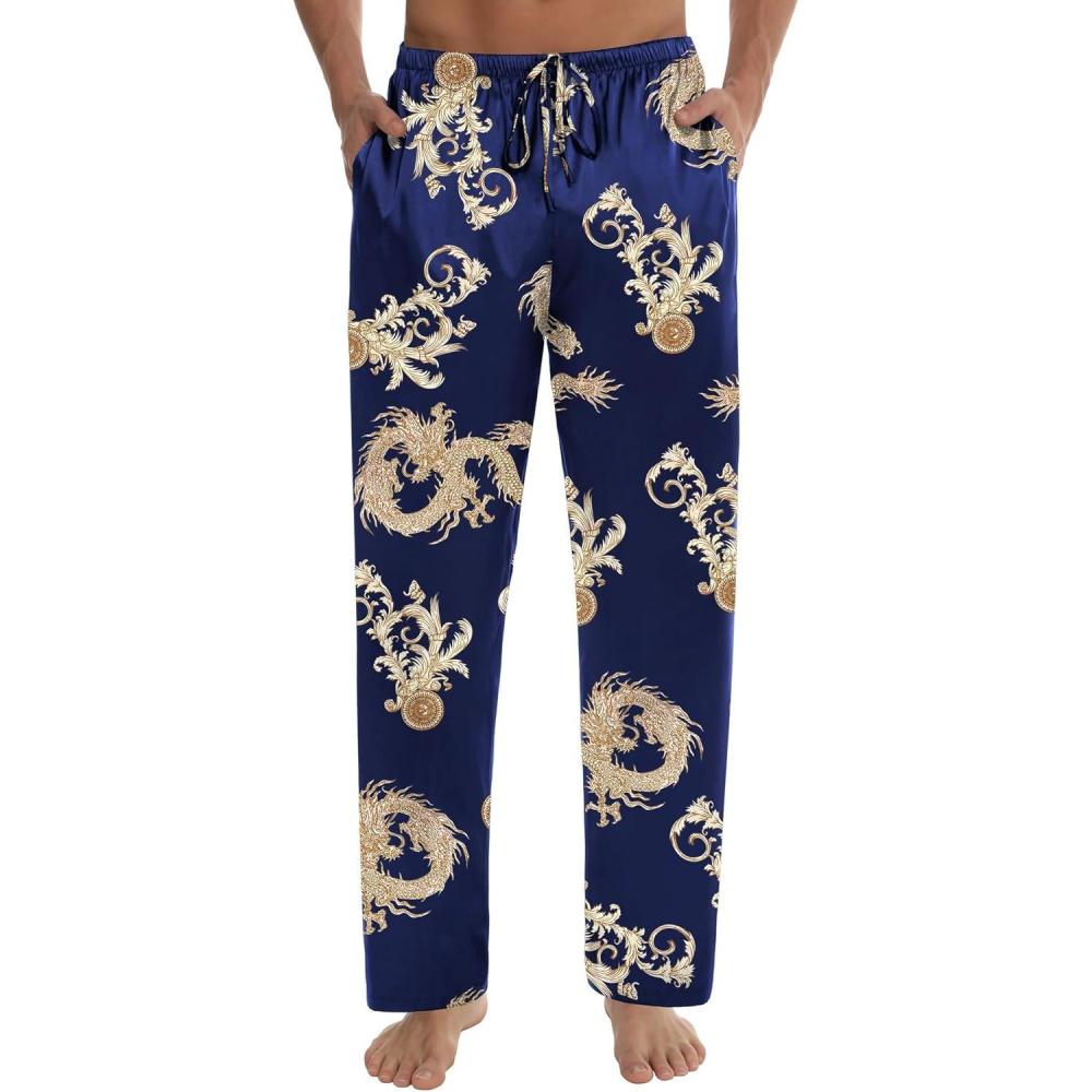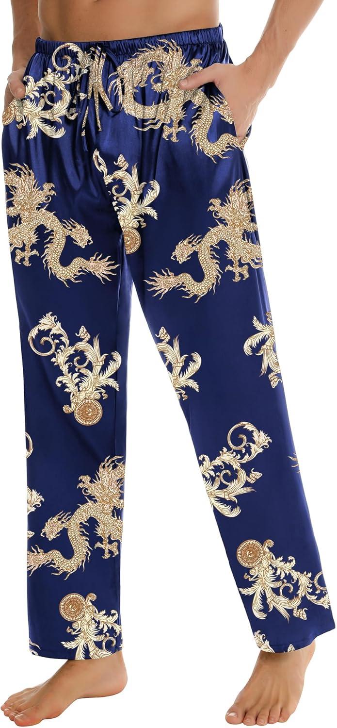 SWOMOG Men’s Satin Silk Pajama Pant Long Pj Bottoms Soft Lounge Sleep Pants with Pockets(A- Blue Dragon)