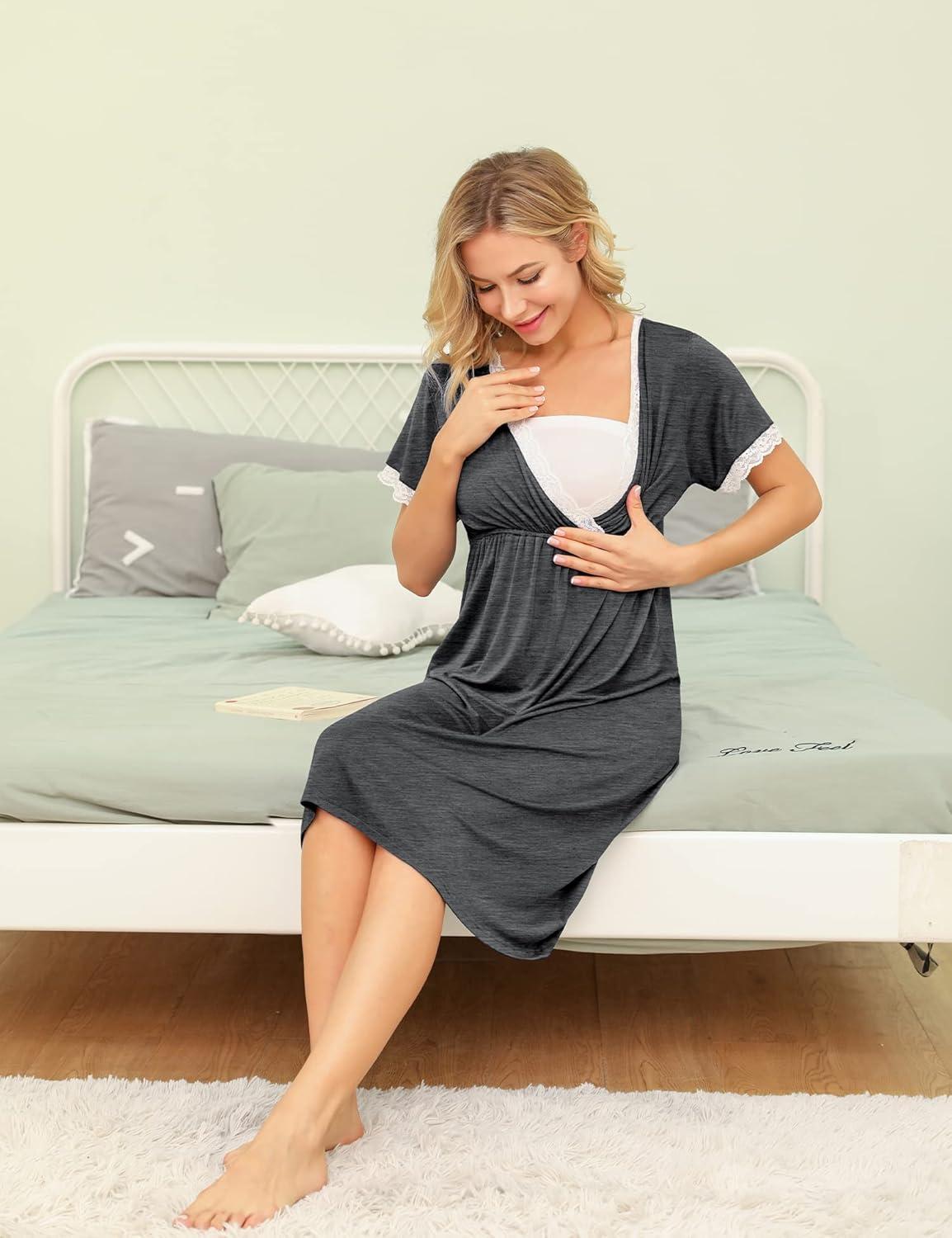 imageSWOMOG Women 3 in 1 DeliveryLaborNursing Nightgown Short Sleeve Pleated Maternity Sleepwear for BreastfeedingShort Sleeve Deep Grey