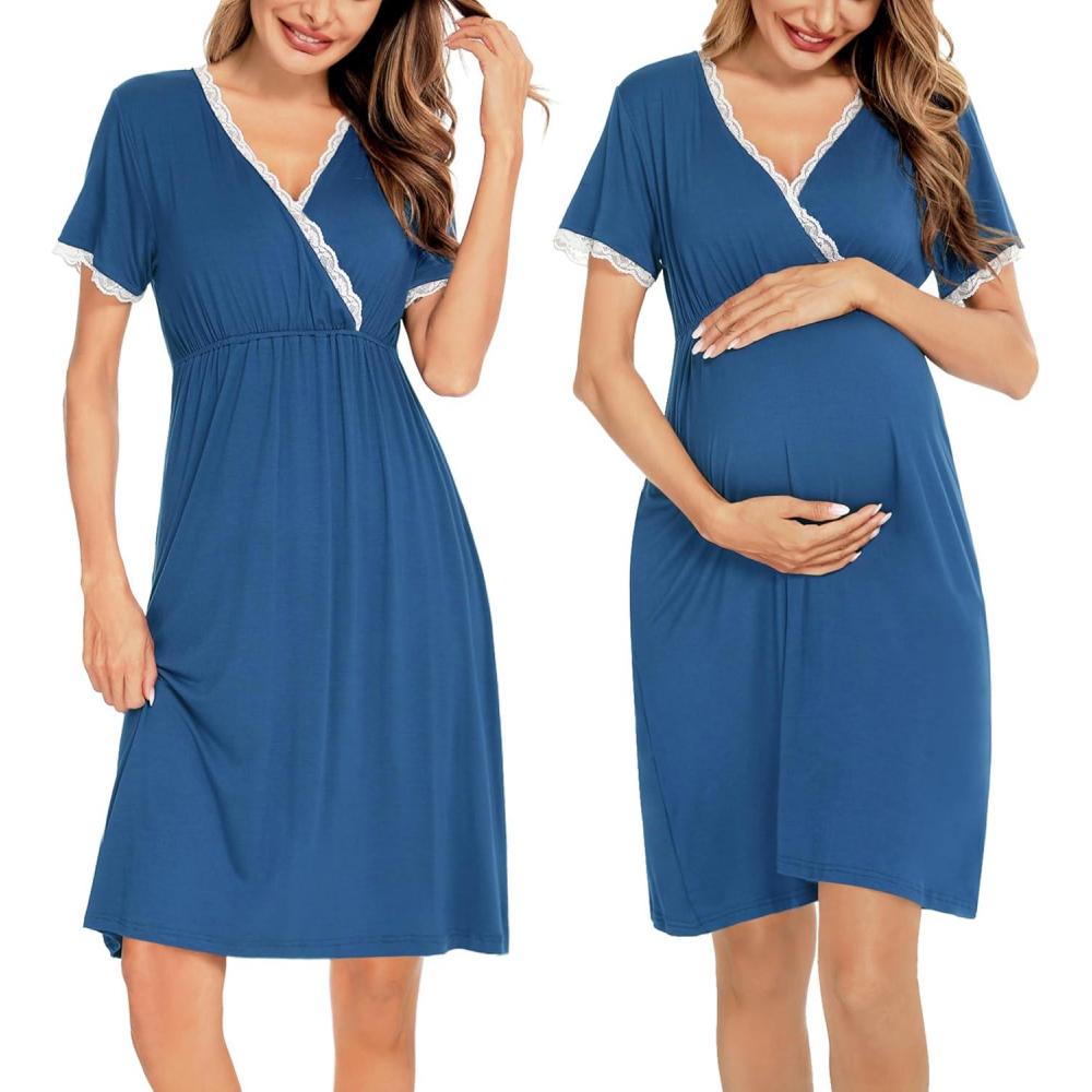 SWOMOG Women 3 in 1 Delivery/Labor/Nursing Nightgown Short Sleeve Pleated Maternity Sleepwear for Breastfeeding(Sleeve Short Navy)