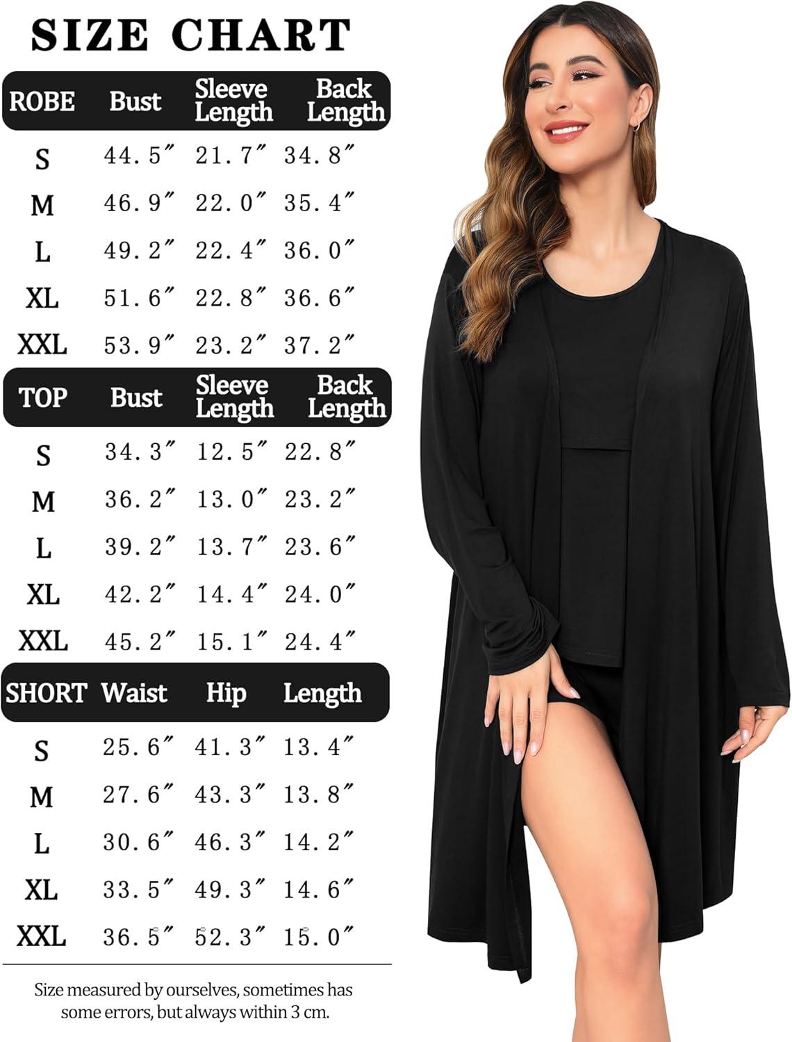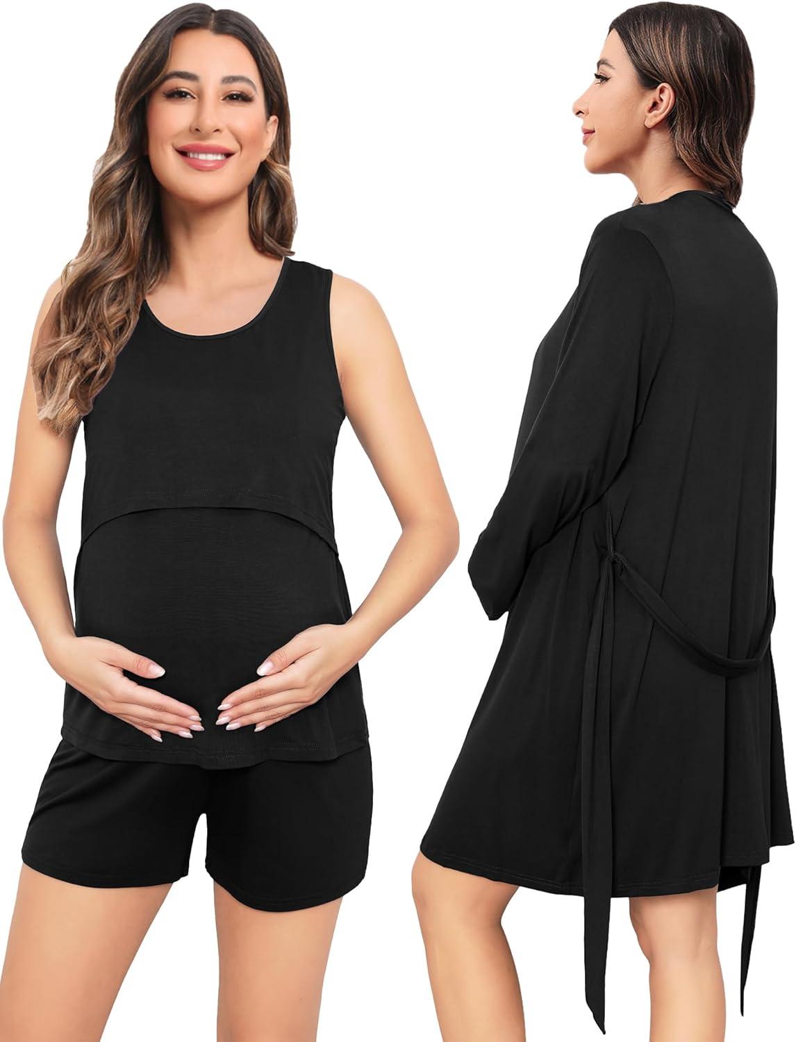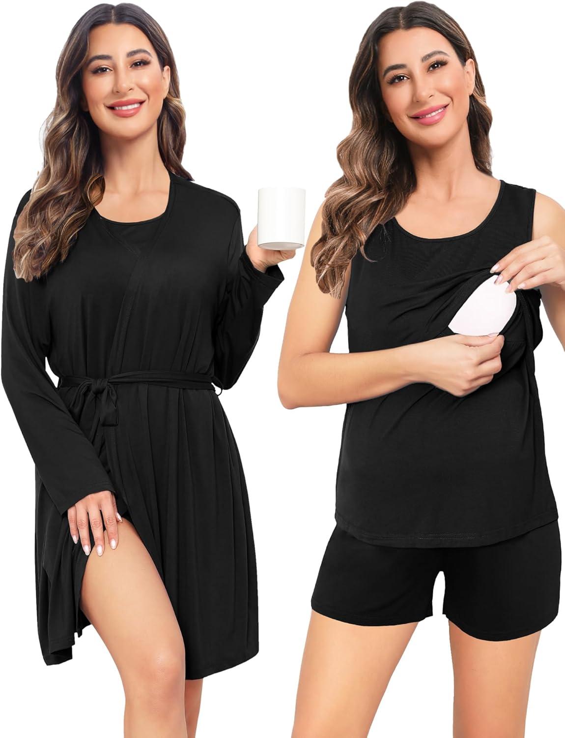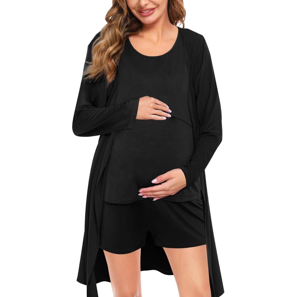 SWOMOG Women Maternity Nursing Robe Set Postpartum Pajamas 3 PCS Breastfeeding Labor Delivery Pregnancy Hospital Pjs(Black)