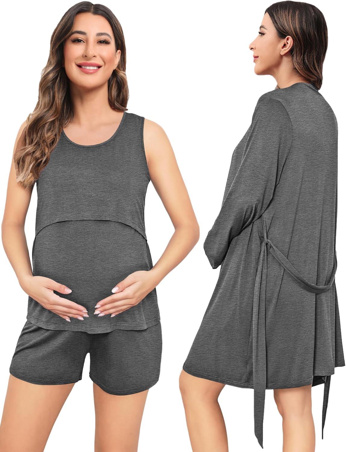 SWOMOG Women Maternity Nursing Robe Set Postpartum Pajamas 3 PCS Breastfeeding Labor Delivery Pregnancy Hospital Pjs(Grey)