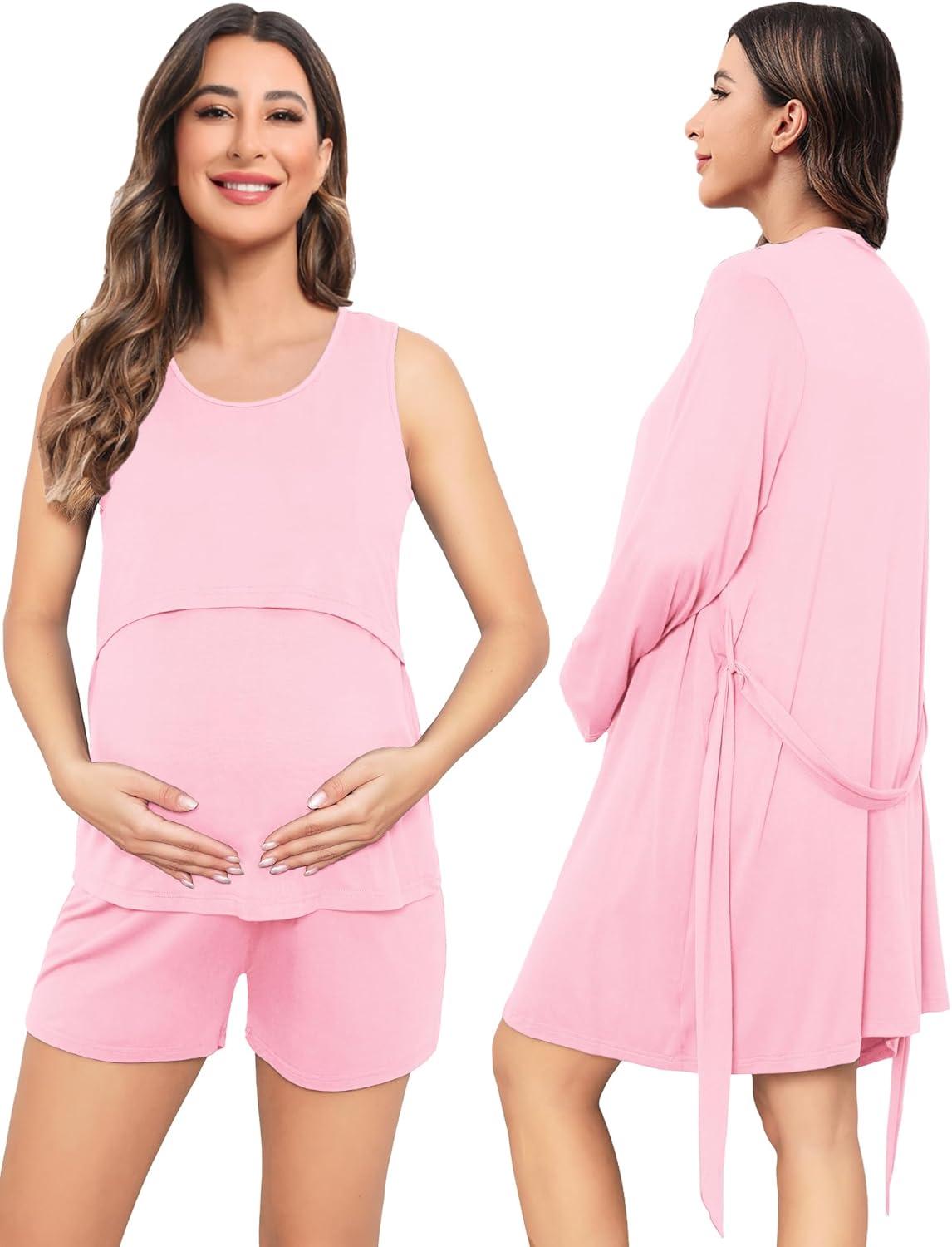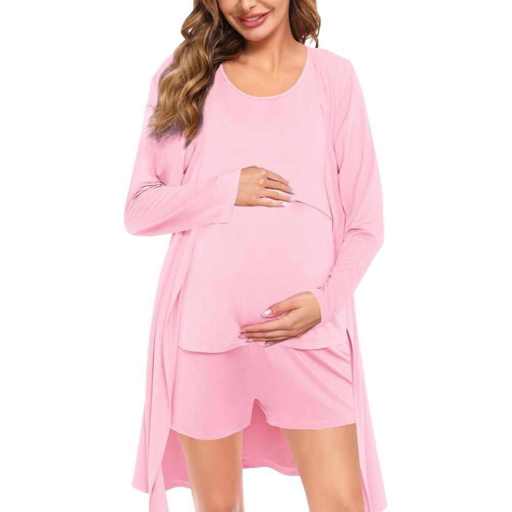 SWOMOG Women Maternity Nursing Robe Set Postpartum Pajamas 3 PCS Breastfeeding Labor Delivery Pregnancy Hospital Pjs(Pink)