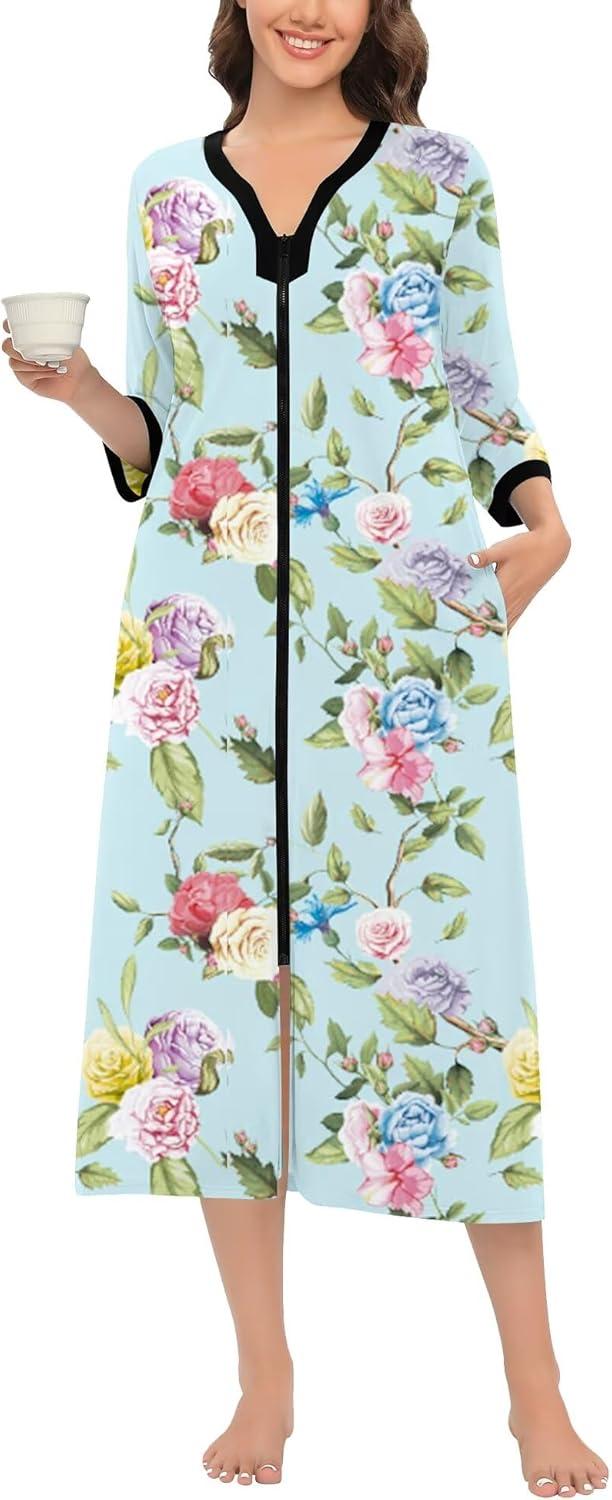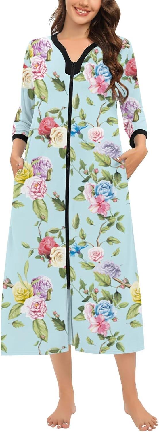 SWOMOG Women Zipper Robe Long Housecoat Zip Up Bathrobes Full Length Nightgown Loungewear with Pockets S-3XL(Floral Green)