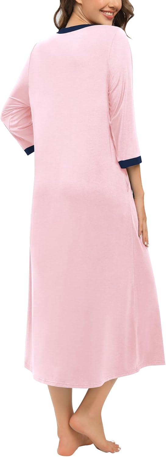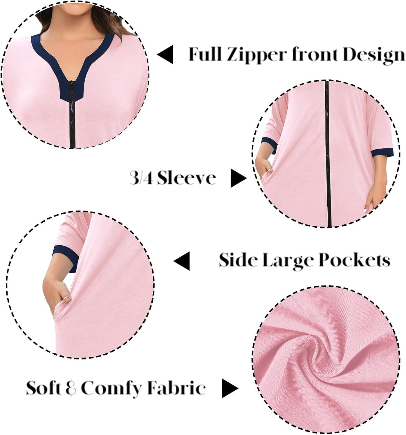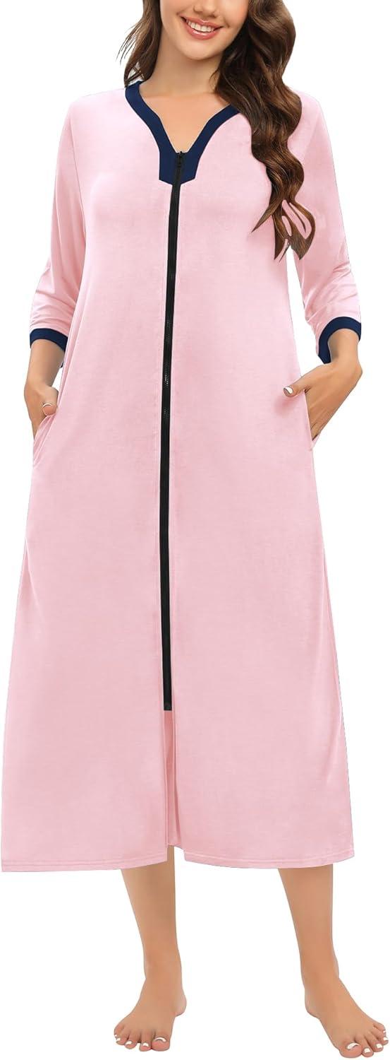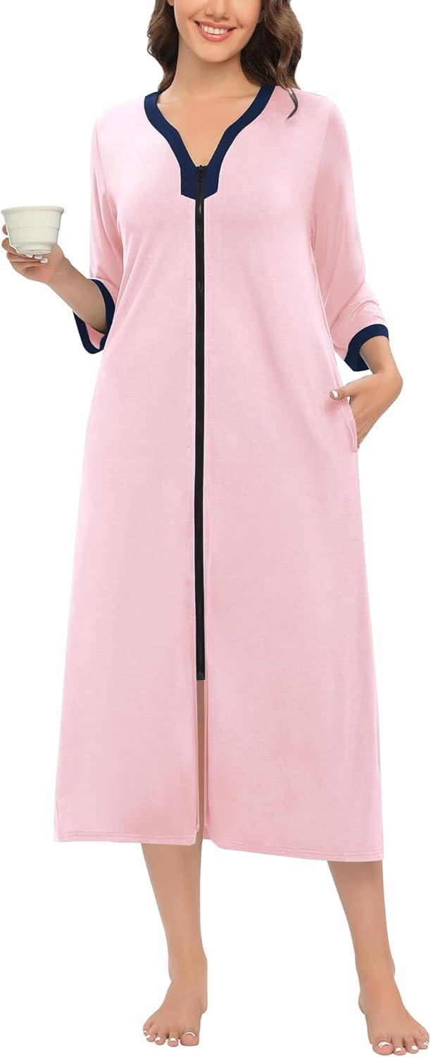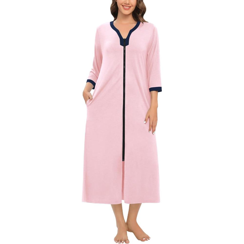 SWOMOG Women Zipper Robe Long Housecoat Zip Up Bathrobes Full Length Nightgown Loungewear with Pockets S-3XL(Pink)
