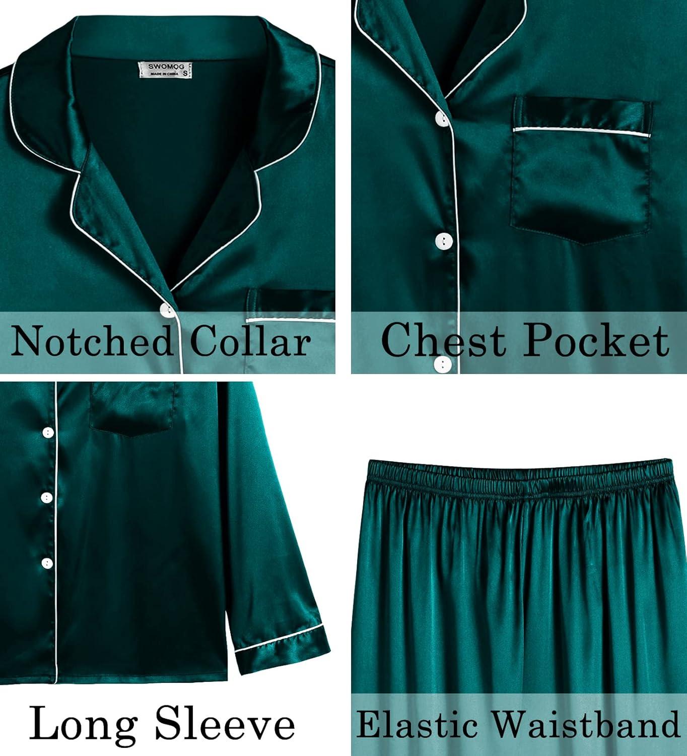 imageSWOMOG Womens 2 PCS  3 PCS Pajamas Set Silk Satin Long Sleeve Sleepwear Button Down Loungewear Pjs NightwearZ  Deep Green  2 Pcs